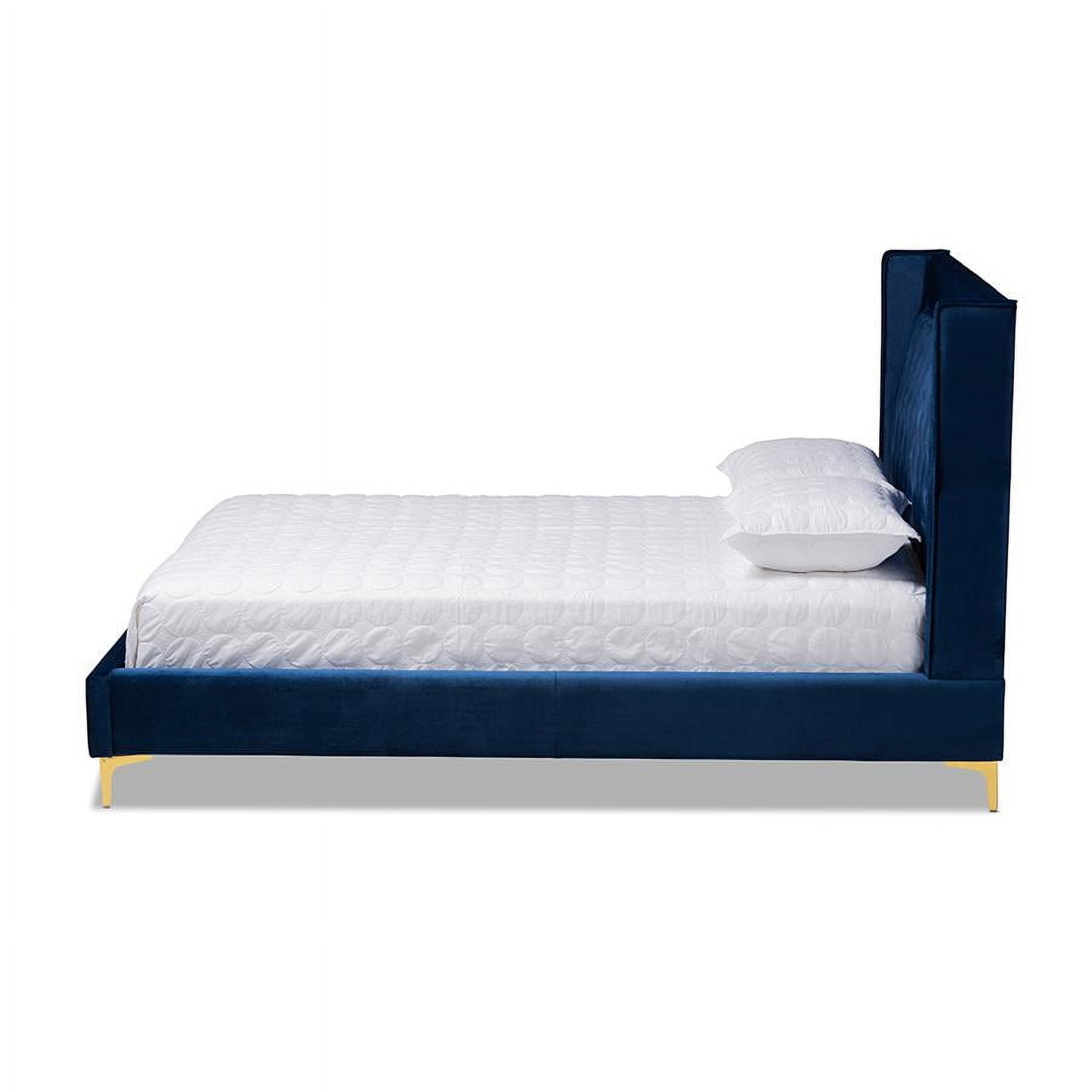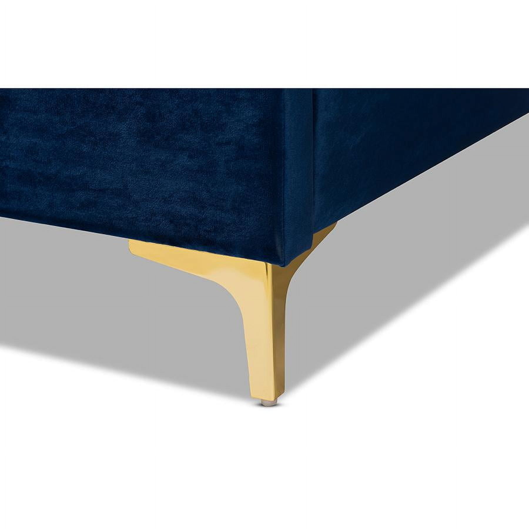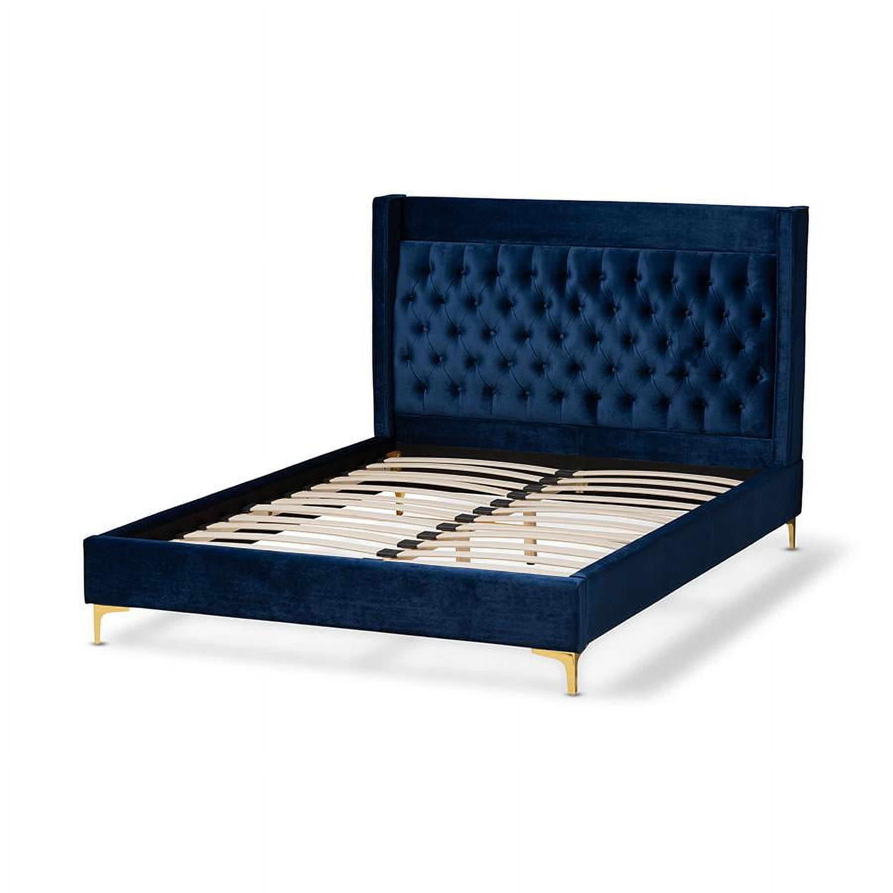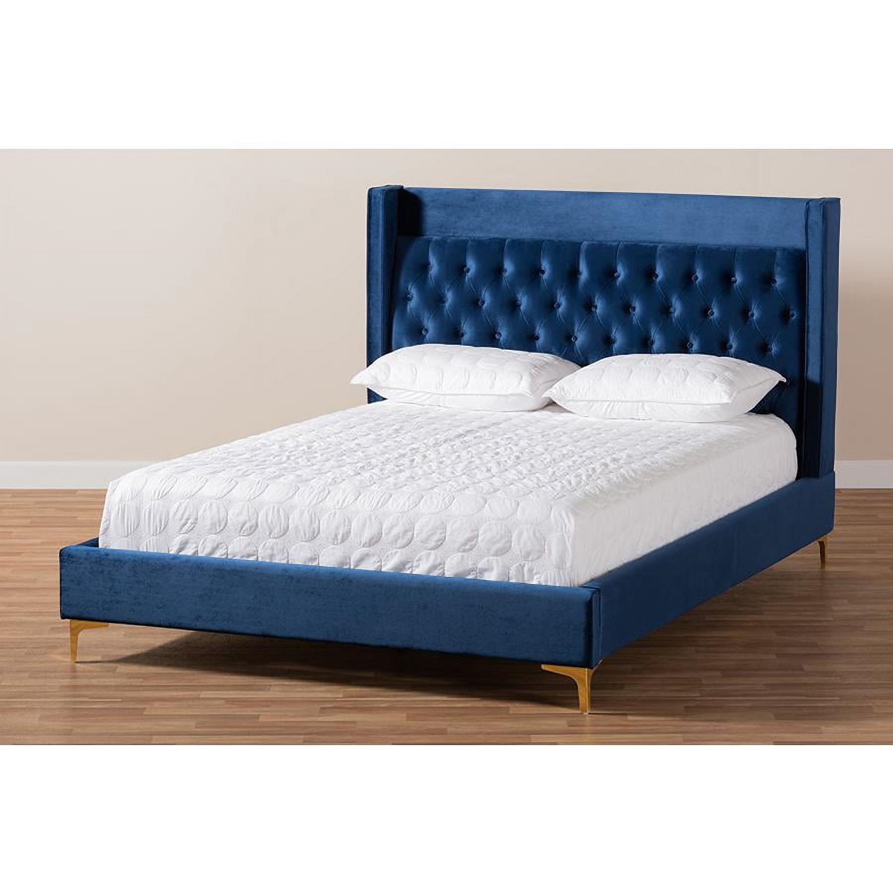 Modern and contemporary platform bed Wooden slats eliminate the need for a box spring Velvet polyester fabric upholstery Gold-finished metal legs Button tufted Assembly required Made in Malaysia
