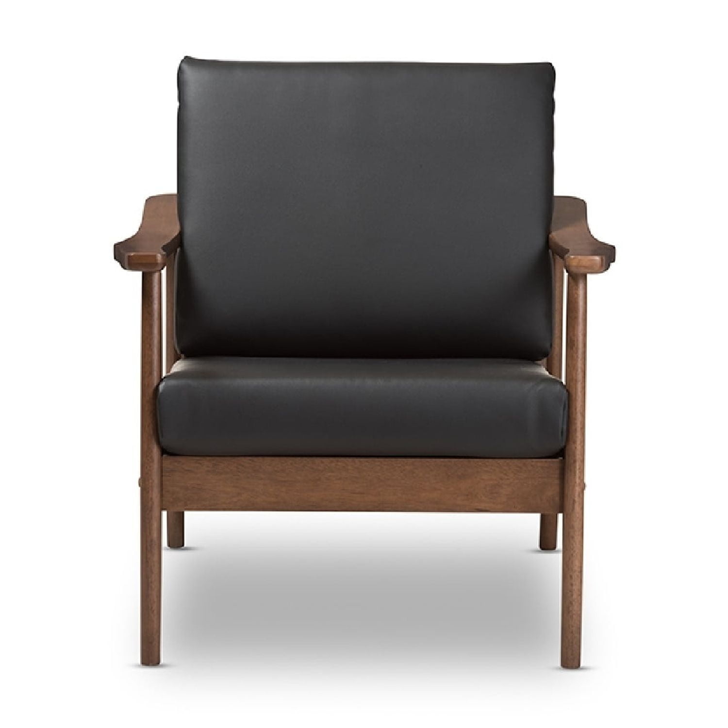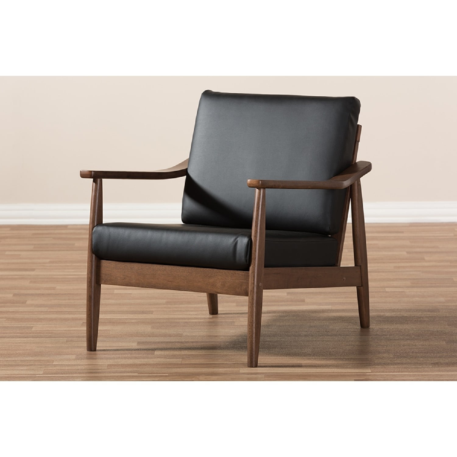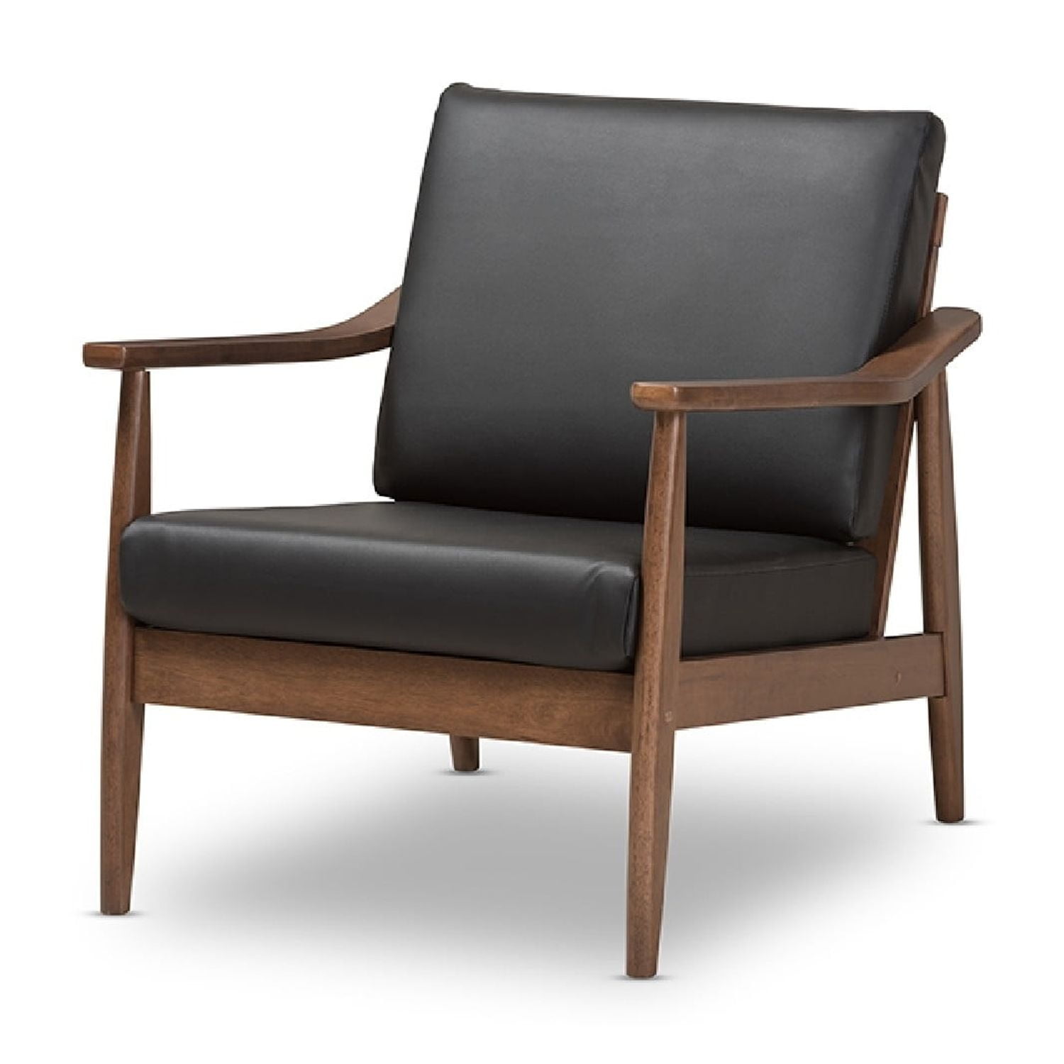 Look forward to unwinding after a long day, with the casual and relaxing design of the Venza 1-seater lounge chair. Constructed of solid rubber wood frame for strength and long-lasting durability, this mid-century modern-inspired armchair is built with clean paneled lines on the back, bringing relaxing vibes into your living room and complementing your home with lavish style. Cushions are upholstered in a soft but resilient black faux leather for plush comfort and lasting good looks. Featuring splayed legs with sloping arms for a mix of minimalist and contemporary styling in your space, the Venza is perfect as a lounge chair or an occasional chair in your living area, bedroom, or in a lounge arrangement, public waiting area or private office. Made in Malaysia, the Venza requires assembly. Features: Finish: Black and Brown Material: Faux Leather, Rubber Wood Mid-century retro modern 1-seater lounge chair Removable cushions in faux leather Sloping armrests with splayed legs Specifications: Product Dimensions: 29.53” H x 27.95” W x 33.07” D Product Weight: 25.35 lbs