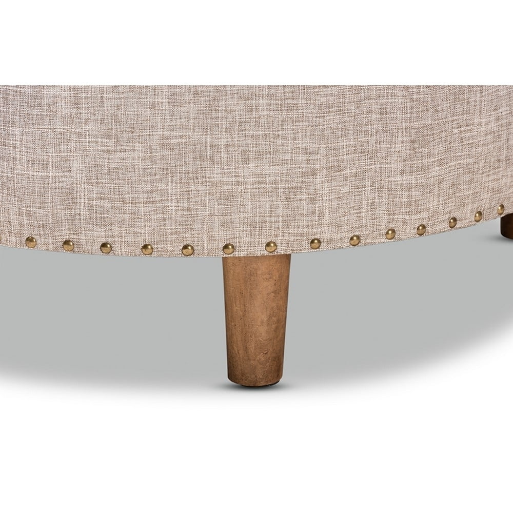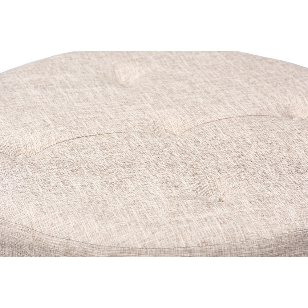 Baxton Studio Vinet Modern and Contemporary Beige Fabric Upholstered Natural Wood Cocktail Ottoman Chic and versatile, the Vinet ottoman is designed for the modern home. Constructed from MDF wood, the Vinet is upholstered in a soft polyester fabric that displays a subtle crosshatch weave for a natural, earthy feel. The neutral upholstery is complemented by sturdy fir wood legs, which showcase the rustic beauty of the woodgrains. Button tufting on the top and brass nailhead trim along the lower edge add a touch of elegance. Use this versatile piece as a coffee table, footstool, or as extra seating for guests. The Vinet ottoman is made in China and requires assembly. Specifications: Modern and contemporary cocktail ottoman Constructed from MDF wood Polyester fabric upholstery Natural-finished fir wood legs Brass nailheads Assembly required Made in China