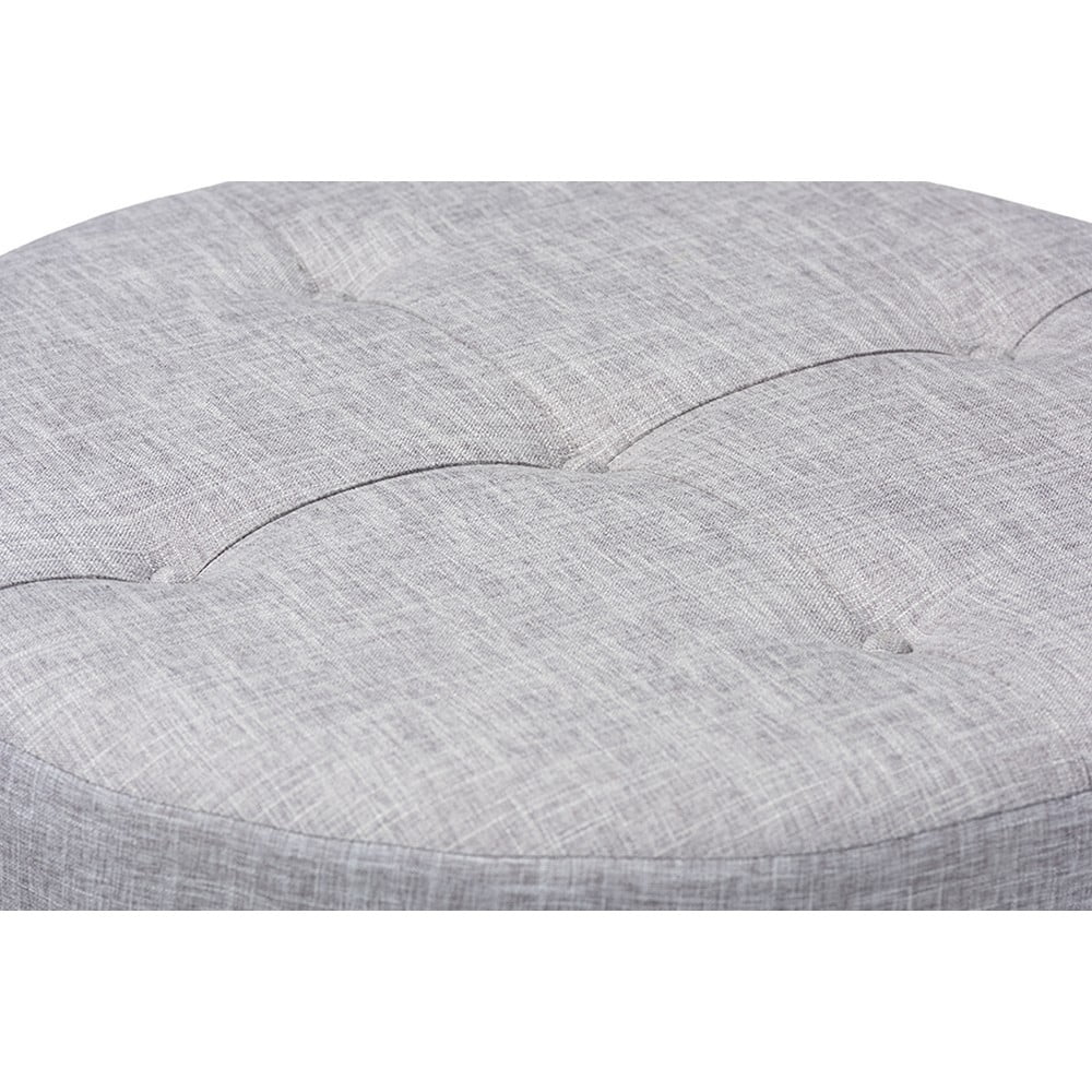 Chic and versatile, the Vinet ottoman is designed for the modern home. Constructed from MDF wood, the Vinet is upholstered in a soft polyester fabric that displays a subtle crosshatch weave for a natural, earthy feel. The neutral upholstery is complemented by sturdy fir wood legs, which showcase the rustic beauty of the woodgrains. Button tufting on the top and brass nailhead trim along the lower edge add a touch of elegance. Use this versatile piece as a coffee table, footstool, or as extra seating for guests. The Vinet ottoman is made in China and requires assembly. Features: Constructed from MDF wood Polyester fabric upholstery Natural-finished fir wood legs Specifications: Seat Height: 13.39 Seat Depth: 31.5 Seat Width: 31.5