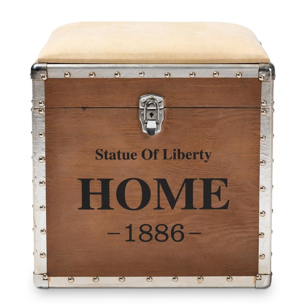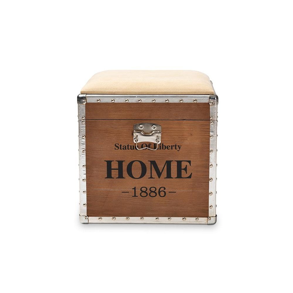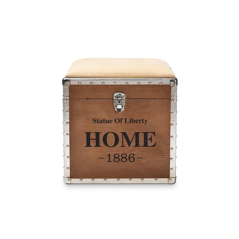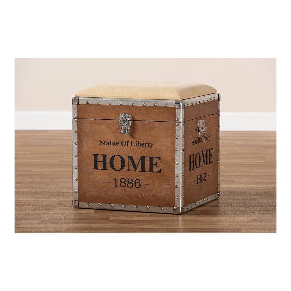 Baxton Studio Violetta Vintage Industrial Beige Fabric Upholstered Wood Storage Trunk Ottoman Featuring a striking mix of textures, the Violetta ottoman adds character to any space. Constructed from light brown-finished MDF wood and metal, the Violetta showcases cool rivet detailing along its metal edges. This versatile piece features a polyester fabric upholstered seat that can be flipped up to reveal an inner storage compartment. Modeled after vintage storage trunks, the Violetta is accented with silver metal handles and an imitation lock, as well as an antique-inspired inscription. The Violetta ottoman is made in China and will arrive fully assembled. Specifications: Constructed from engineered wood and metal Light brown finish Polyester fabric upholstery Inner storage compartment Imitation lock Rivet detailing Fully assembled