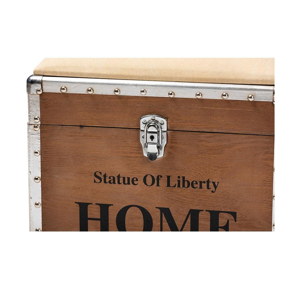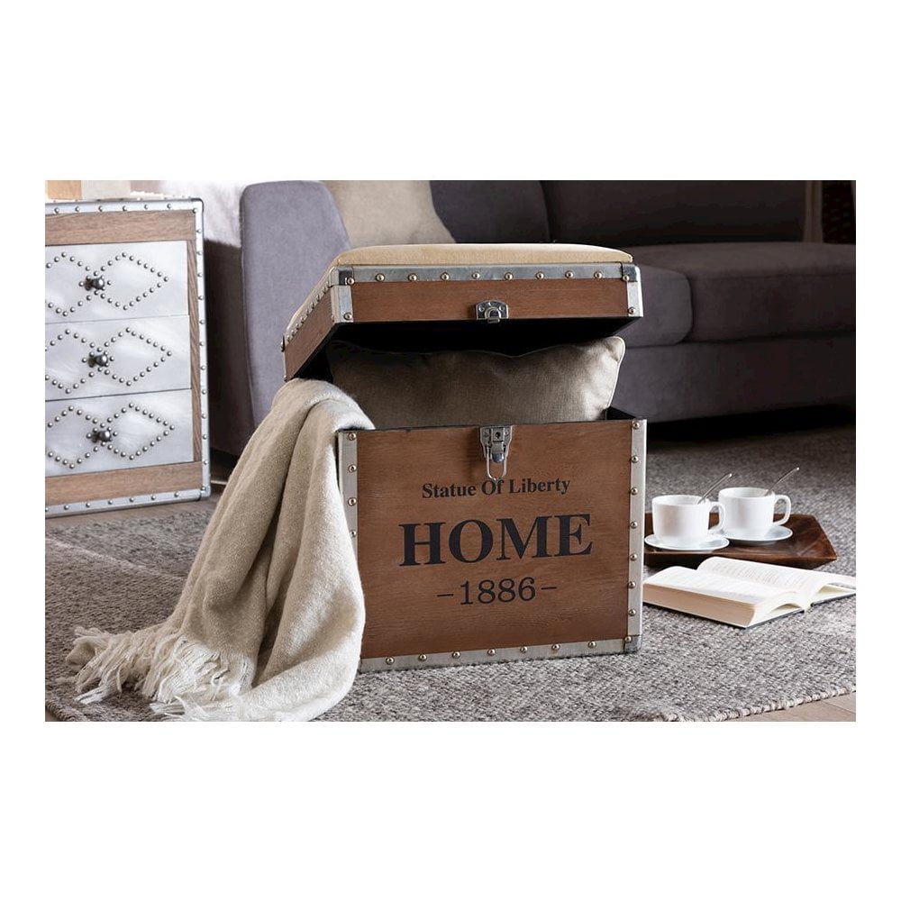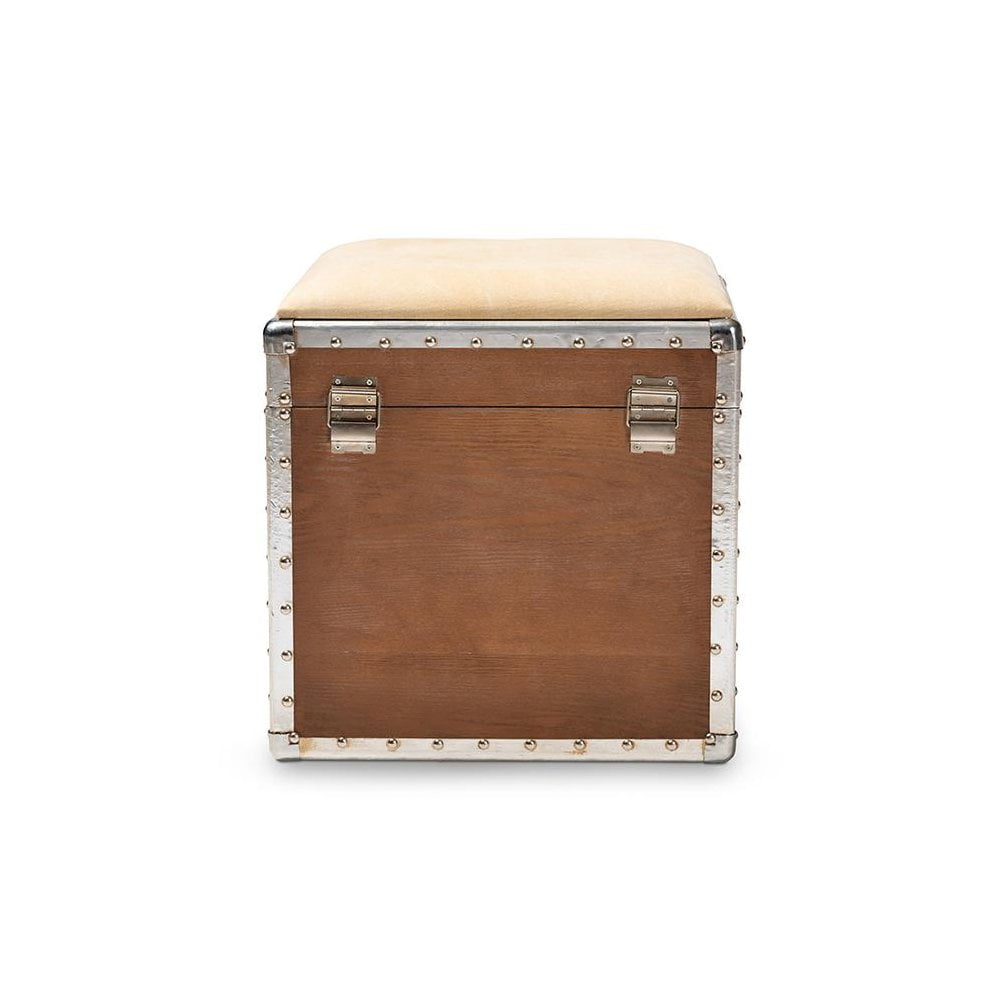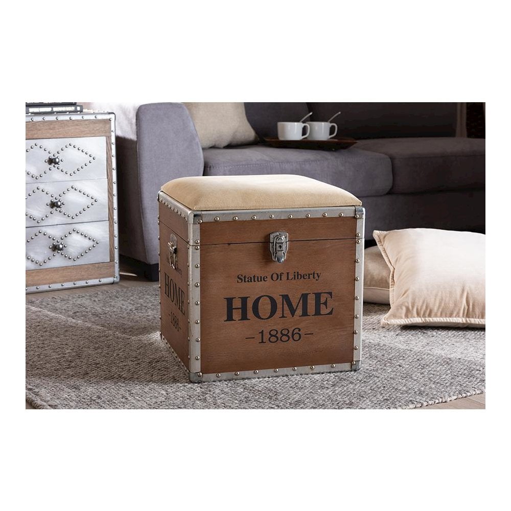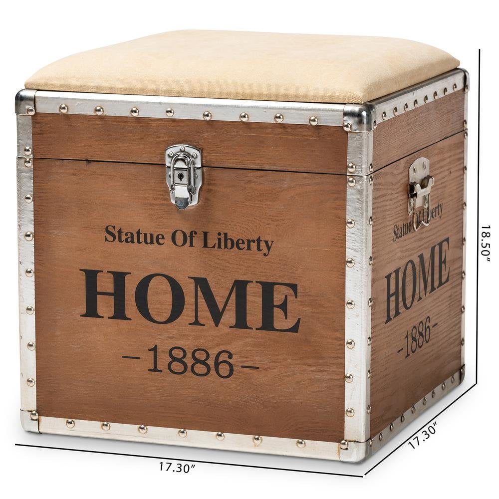 Baxton Studio Violetta Vintage Industrial Beige Fabric Upholstered Wood Storage Trunk Ottoman Featuring a striking mix of textures, the Violetta ottoman adds character to any space. Constructed from light brown-finished MDF wood and metal, the Violetta showcases cool rivet detailing along its metal edges. This versatile piece features a polyester fabric upholstered seat that can be flipped up to reveal an inner storage compartment. Modeled after vintage storage trunks, the Violetta is accented with silver metal handles and an imitation lock, as well as an antique-inspired inscription. The Violetta ottoman is made in China and will arrive fully assembled. Specifications: Constructed from engineered wood and metal Light brown finish Polyester fabric upholstery Inner storage compartment Imitation lock Rivet detailing Fully assembled