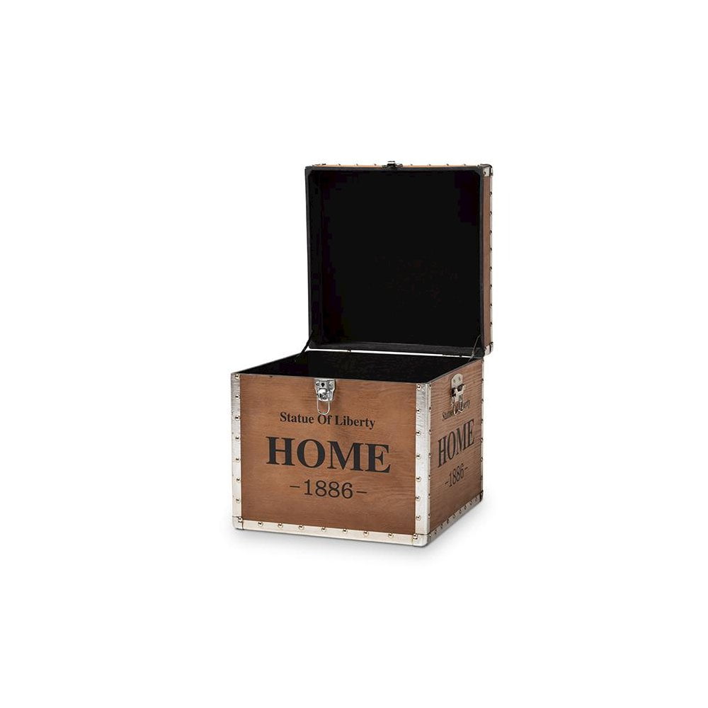 Constructed from engineered wood and metal Light brown finish Polyester fabric upholstery Inner storage compartment Imitation lock Rivet detailing Fully assembled
