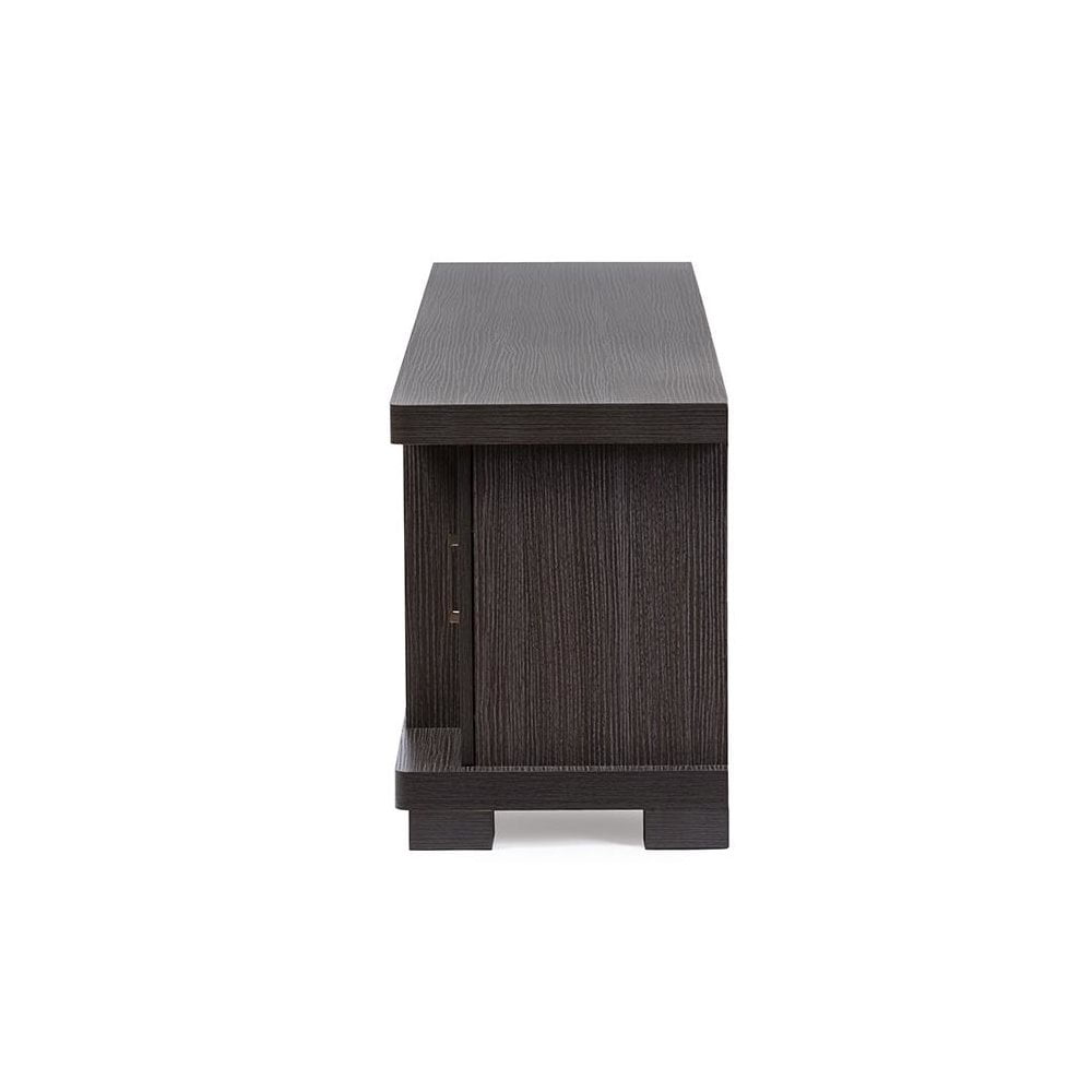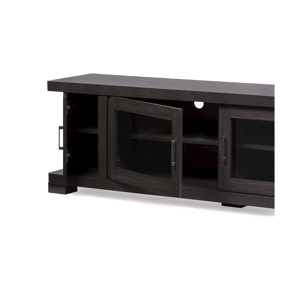 The Baxton Studio Viveka TV Cabinet has classic styling with contemporary updates and offers a variety of options for storing all your entertainment accessories. This beautiful TV cabinet is constructed of durable engineered wood and comes in a rich, dark-brown and espresso finish that warms up any space. It features two glass doors in the center, each opening to reveal a shelf behind. The glass doors are the perfect spot to store cable boxes, sound systems, media players, or decorative items to keep on display. Flanking the glass doors are two doors with metal handles that open to a shelf behind each, a handy spot to tuck away media clutter like extra cords and owner’s manuals. This handsome cabinet is the perfect blend of traditional style with a modern twist, and offers convenient storage with a contemporary flair.