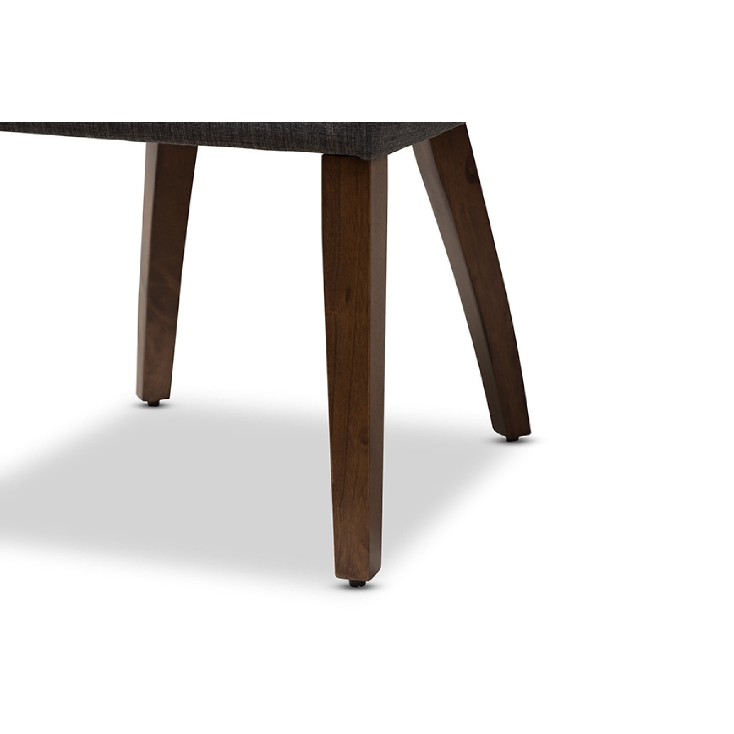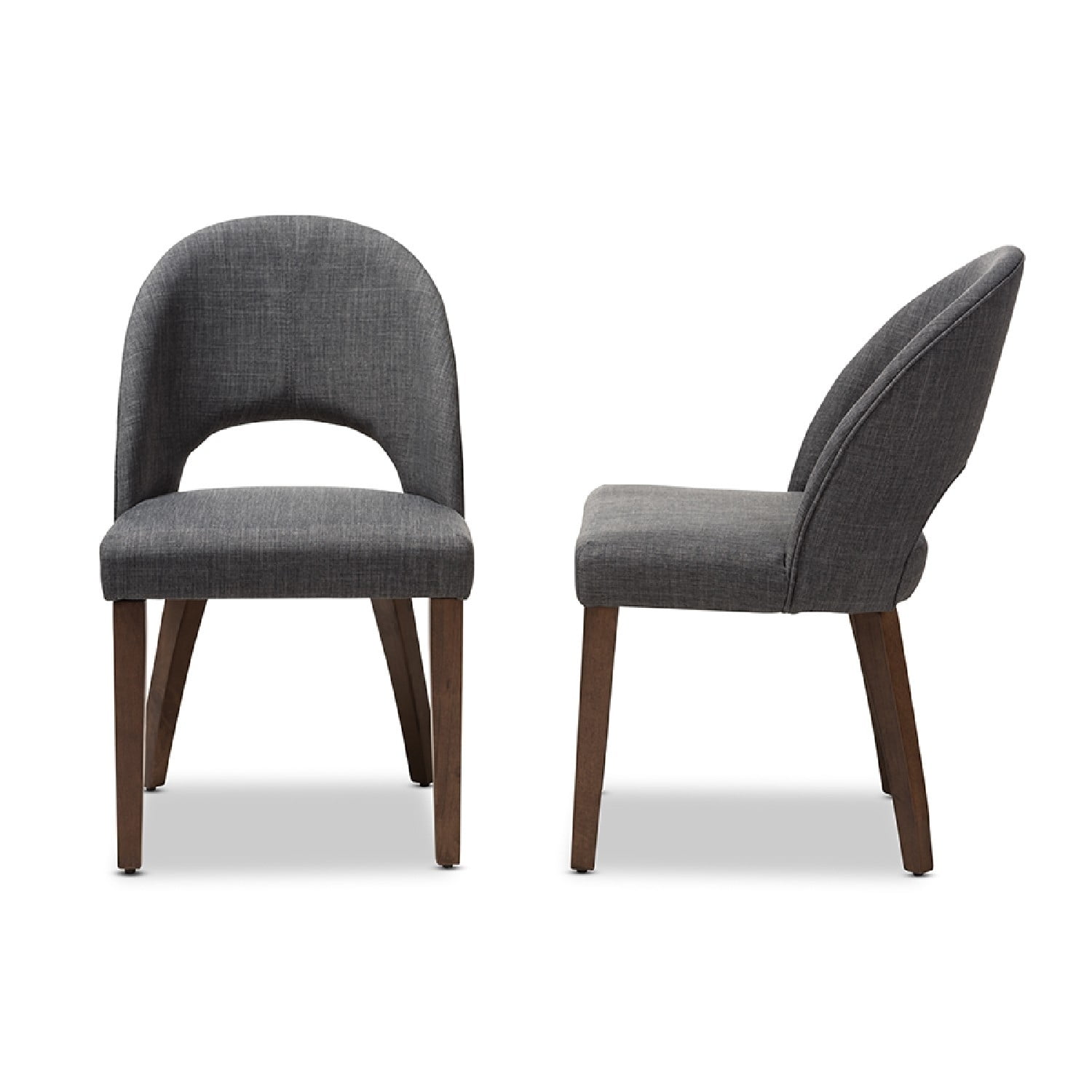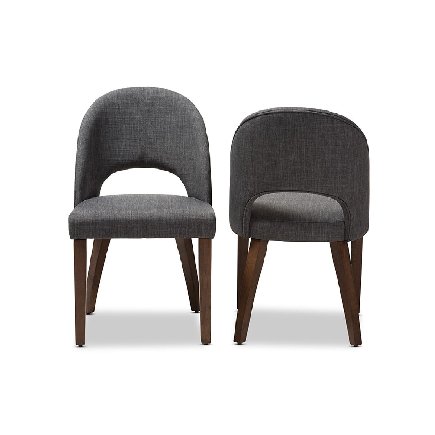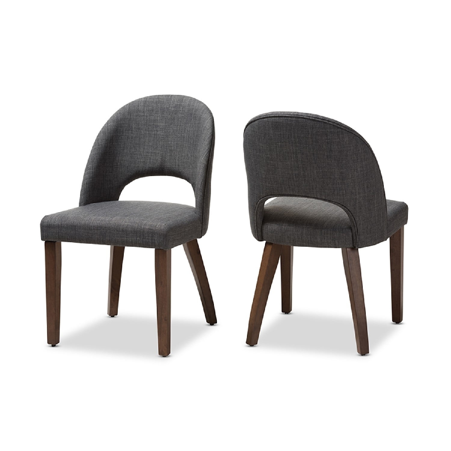Baxton Studio Wesley Mid-Century Modern Dark Grey Fabric Upholstered Walnut Finished Wood Dining Chair (Set of 2) The Wesley dining chair is both fun and functional. The mid-century modern-inspired design of this chair evokes a retro charm. Constructed of solid, walnut-finished rubberwood, this dining chair is built to last. The Wesley is upholstered in dark grey fabric with a foam-padded seat. The chairback is delightfully bowed and open for comfort, with a smooth arched design. Add a fun and retro flair to your dining room, living room, or any other shared space with the Wesley. Made in Malaysia, this chair requires assembly. Specifications: Mid-century modern dining chair Dark grey fabric upholstery Solid rubberwood, walnut-finished legs Bowed, open chairback Foam-padded seat Assembly required Made in Malaysia