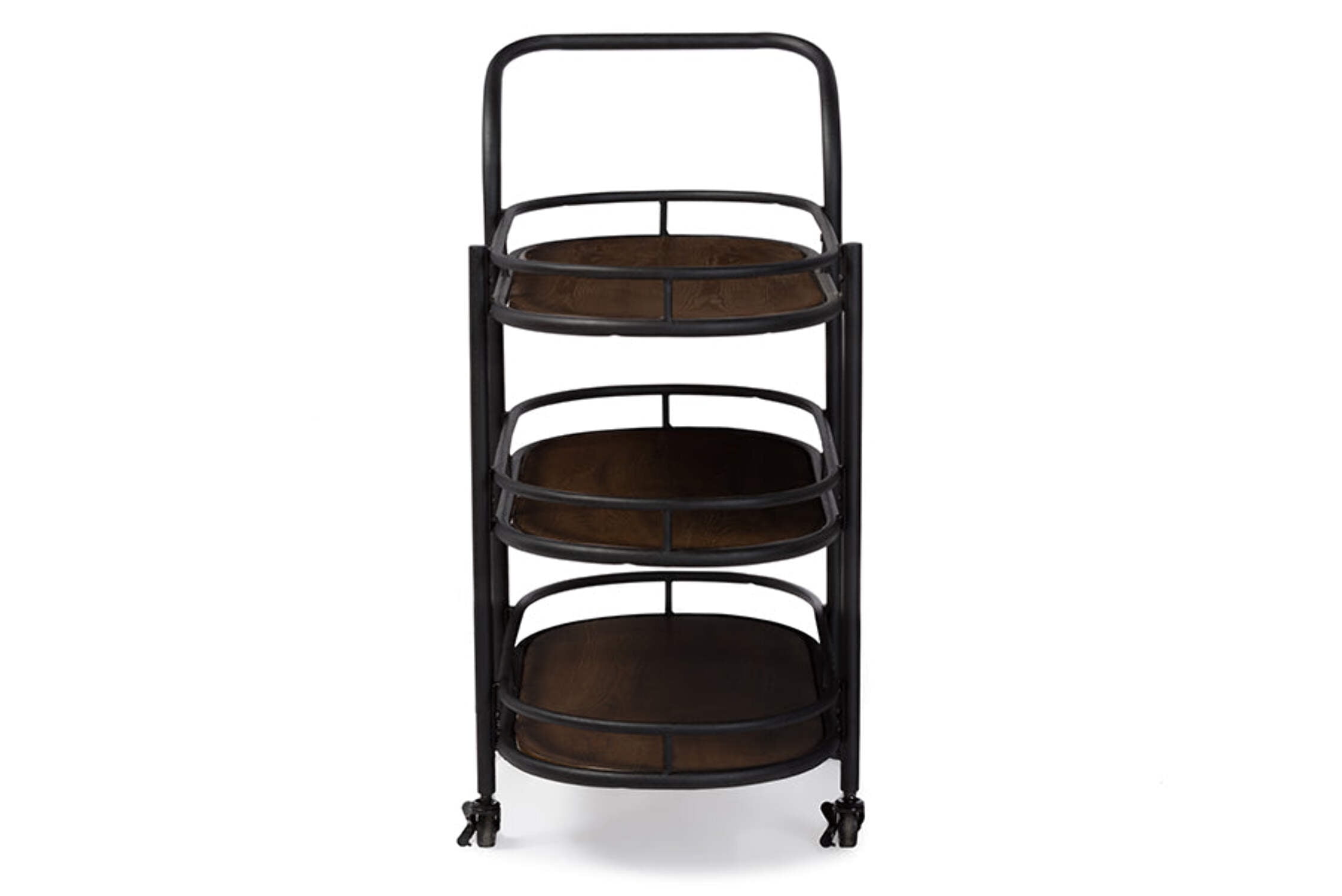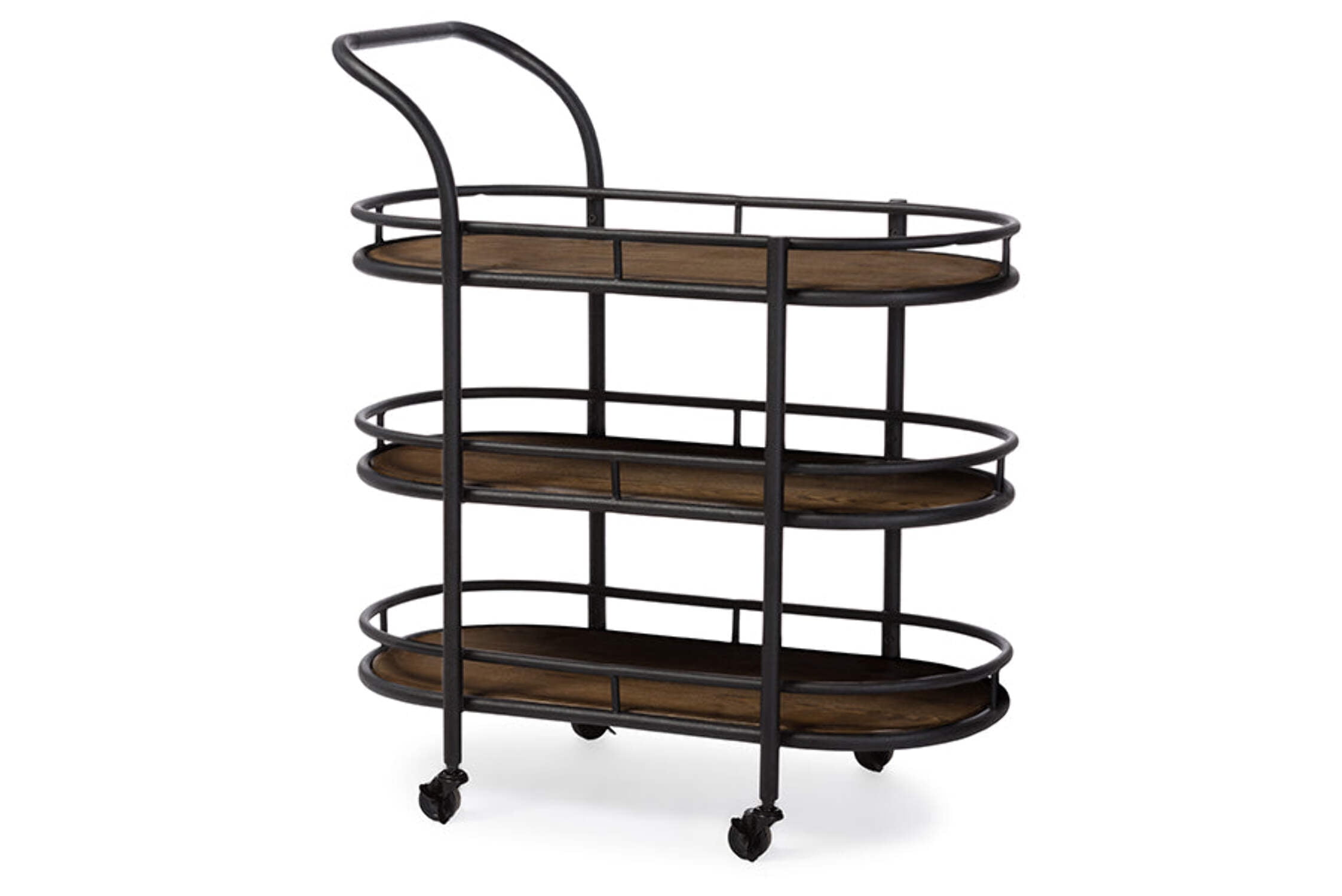 Wood Mobile Kitchen Bar Serving Wine Cart Black/Brown Rustic and industrial in design, this Karlin Rustic Industrial Style Antique Black Finishing Metal and Wood Mobile Kitchen Bar Serving Wine Cart adds the perfect amount of extra storage to small dining rooms, kitchens and other spaces. This rolling bar serving kitchen cart has a weathered and timeworn finishing. Constructed of sturdy metal frame in antiqued bronze finishing with MDF and distressed ash veneer, the Karlin features three spacious storage shelves for your wine bottles, glasses and kitchen utensils. The shelves are strengthened with the metal rails for your practical use. The caster wheels allow for easy mobility, in addition to the push handle. Made in China, the Karlin kitchen rolling cart requires assembly. Rustic industrial style kitchen bar serving wine cart Materials: Metal, Wood, MDF veneer and hardware Antiqued black finished textured metal frame Three open shelves guarded by metal rails Ample space for wine glass, wine bottles, utensils and plates – Composition: Metal/MDF/Wood – Color: Black/Brown – Product Width: 33 – Product Depth: 18 – Product Height: 37 – Product Weight: 37.84 – Style: Rustic Industrial – Care Instruction: Wipe with a dry cloth – Dimension: Dimensions: 37″ High x 33″ Wide x 18″ Long; Shelves (Upper): 31.5″ Wide x 14.5″ Long; (Middle): 9.5″ High (Between Selves) x 31.5″ Wide x 14.5″ Long; (Lower): 9.5″ High (Between Selves) x 31.5″ Wide x 14.5″ Long