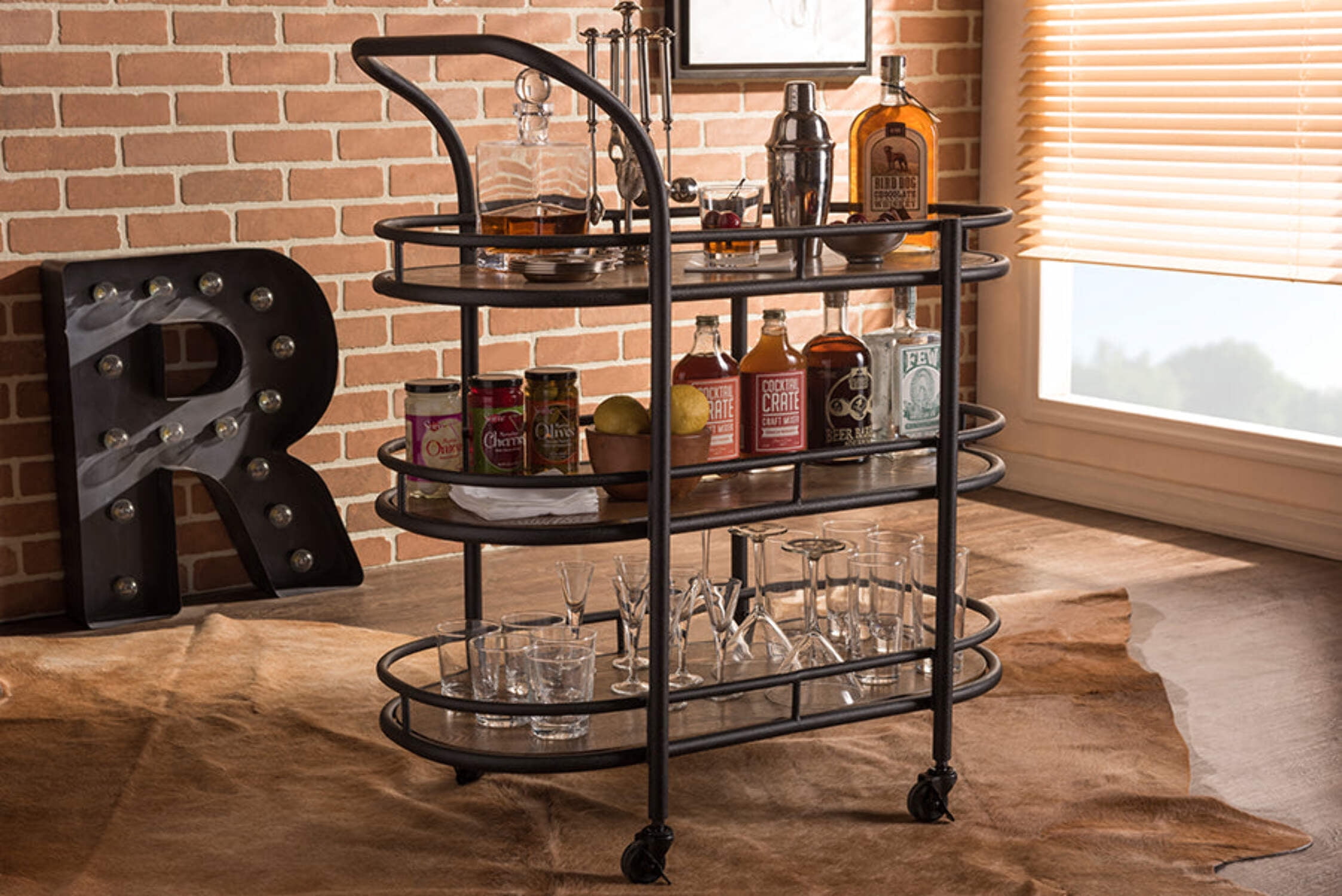 Rustic industrial style kitchen bar serving wine cart Materials: Metal, Wood, MDF veneer and hardware Antiqued black finished textured metal frame Three open shelves guarded by metal rails Ample space for wine glass, wine bottles, utensils and plates