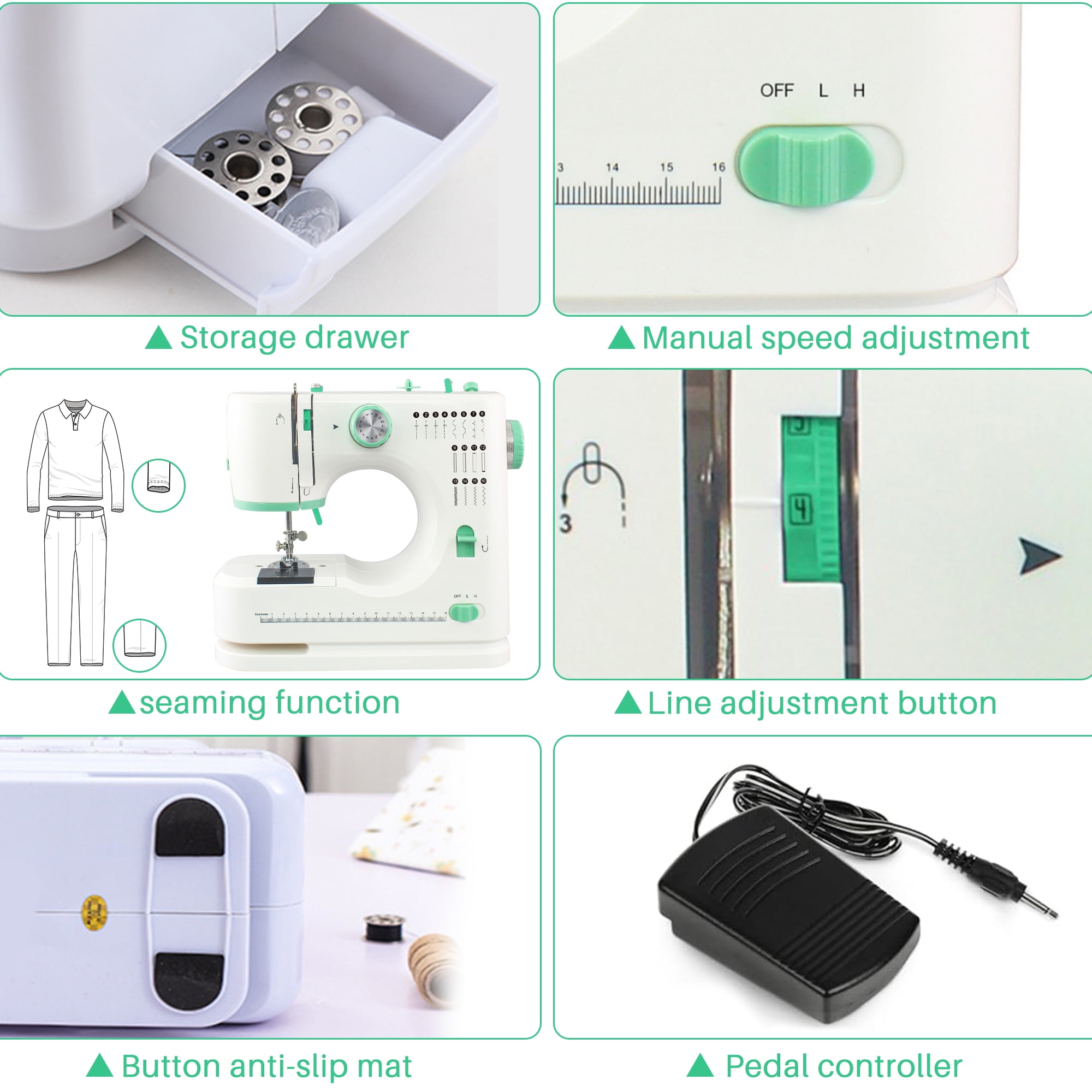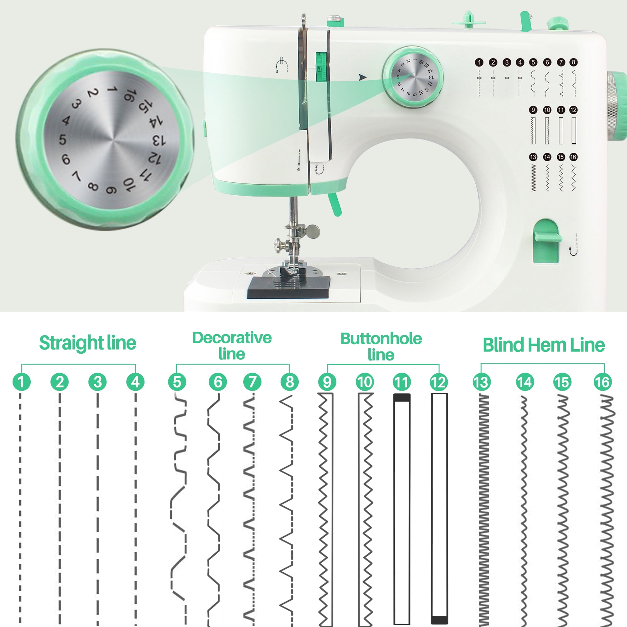 16 KIND OF STITCHES AND REVERSE STITCHING: Stitch options are clearly displayed on the Stitch Selector Dials, just turn the dial to select your stitch. ELECTRIC SEWING MACHINE:Supports AC/DC power supply or battery power supply (wireless), easy to turn on with a button or foot pedal (included) AUTOMATIC FOUR-STEP BUTTONHOLE:Just place the button in the buttonhole foot and the machine sews a buttonhole perfectly sized for that button, delivering consistent results every time. INCLUDED ACCESSORIES:We provide a useful sewing accessory kit which includes bobbins (28pcs), needles (10pcs), scissors, threader, tape measure, seam ripper, thimble. Additionally, a storage bag is included. DUAL POWER AND DUAL SWITCH: BCOOSS sewing machine can be controlled by foot switch and button switch, whether you are a beginner or a sewing enthusiast, you can easily operate it, AC adapter and 4 AA batteries two power modes, battery mode is suitable for you to use when going out, remember not to use two power modes at the same time, otherwise the motor will be damaged. PRECAUTIONS FOR USE OF SEWING MACHINE1.There is a piece of cloth on the machine of this product. It is used by the factory for testing. It is not a used product 2.Incorrect operation will cause jamming or broken needles, please watch the video carefully and read the instructions before use.3.If you have any questions, please feel free to contact us.
