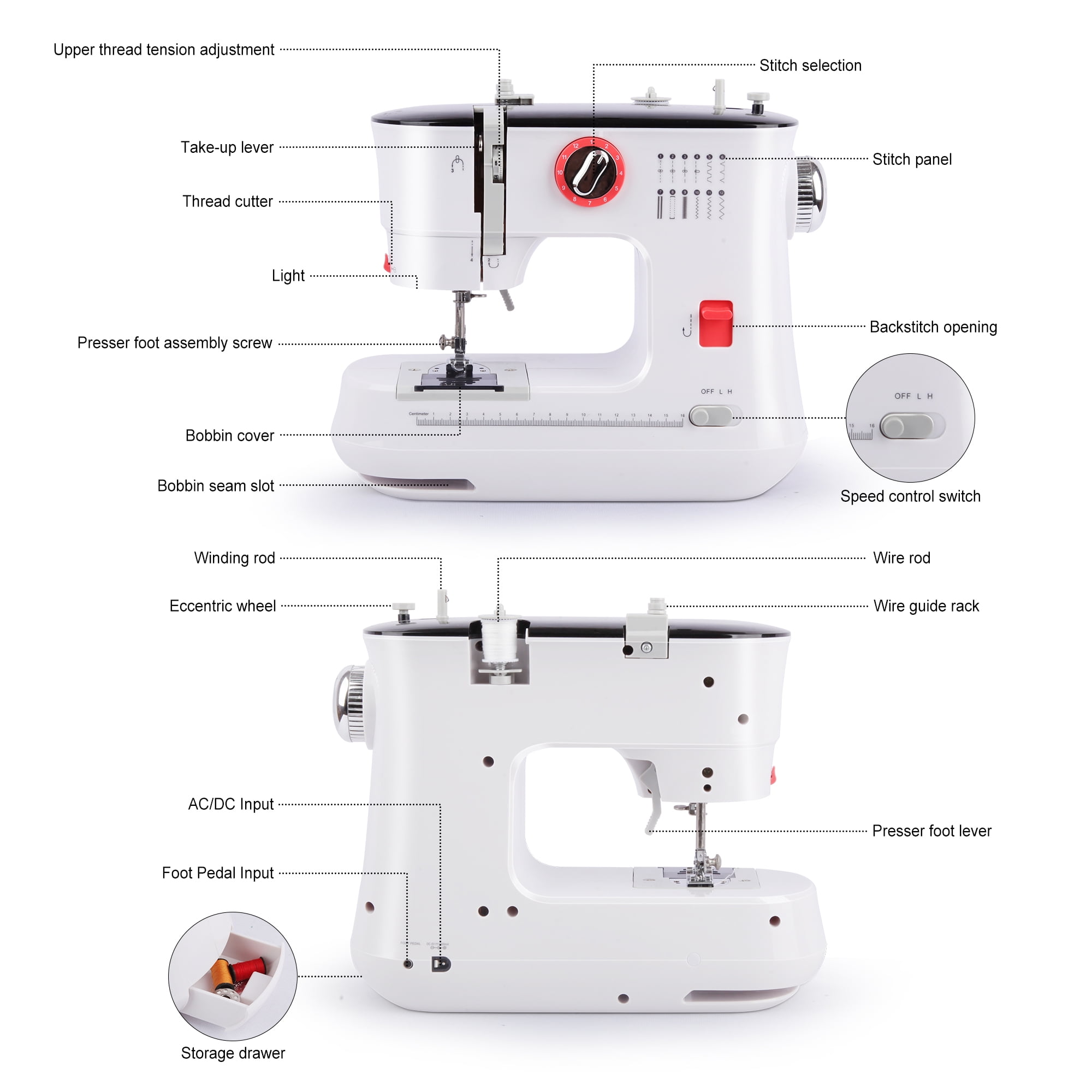 Full Tool Kits-It comes with abundant sewing tools to help start sewing as bobbins, scissor, measuring tape, thimble, needle threader and needles. Extension Table & Built-in Light- An extension table makes the sewing machine more stable and works better on larger projects. Also, the sewing machine is equipped with built-in light and thread cutter, providing enough light source and straight cutting on sewing. The Best Gift- Suitable for a Mother, Grandmother, Wife, Daughter, or Niece. Because seeing the sewing machine at first glance will produce a strong interest. A great gift for Christmas, and birthdays. Electric Sewing Machine-Supports AC/DC power supply or battery power supply (wireless), easy to turn on with a button or foot pedal (included). It’s very convenient to start sewing jobs. High or Low Control-Double Threads design make the stitching stronger and ends sewing without tying the thread. There is a Speed button on the product to turn the speed in “high” or “slow” according to your demand.