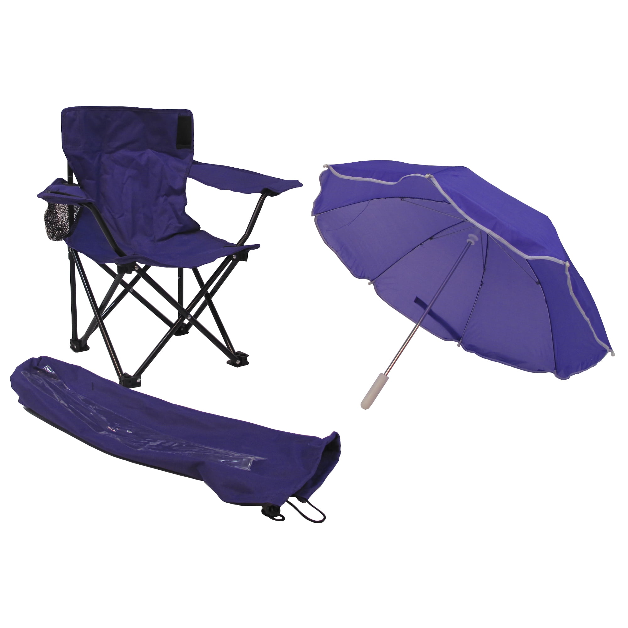 Complete folding camp chair with removable shade umbrella and matching tote bag Matching tote bag with draw string and shoulder strap Dual safety chair locks to prevent inadvertent closing Provide protective shade for little ones in their own sized chair Convenient cup holder and arm rests Powder-coated steel frame Heavy-duty polyester fabric seat and umbrella Choose from available colors Recommended for ages 2 to 5 or 50# – Meets all US safety requirements Dimensions: 22W x 21.75D x 39.5H in.