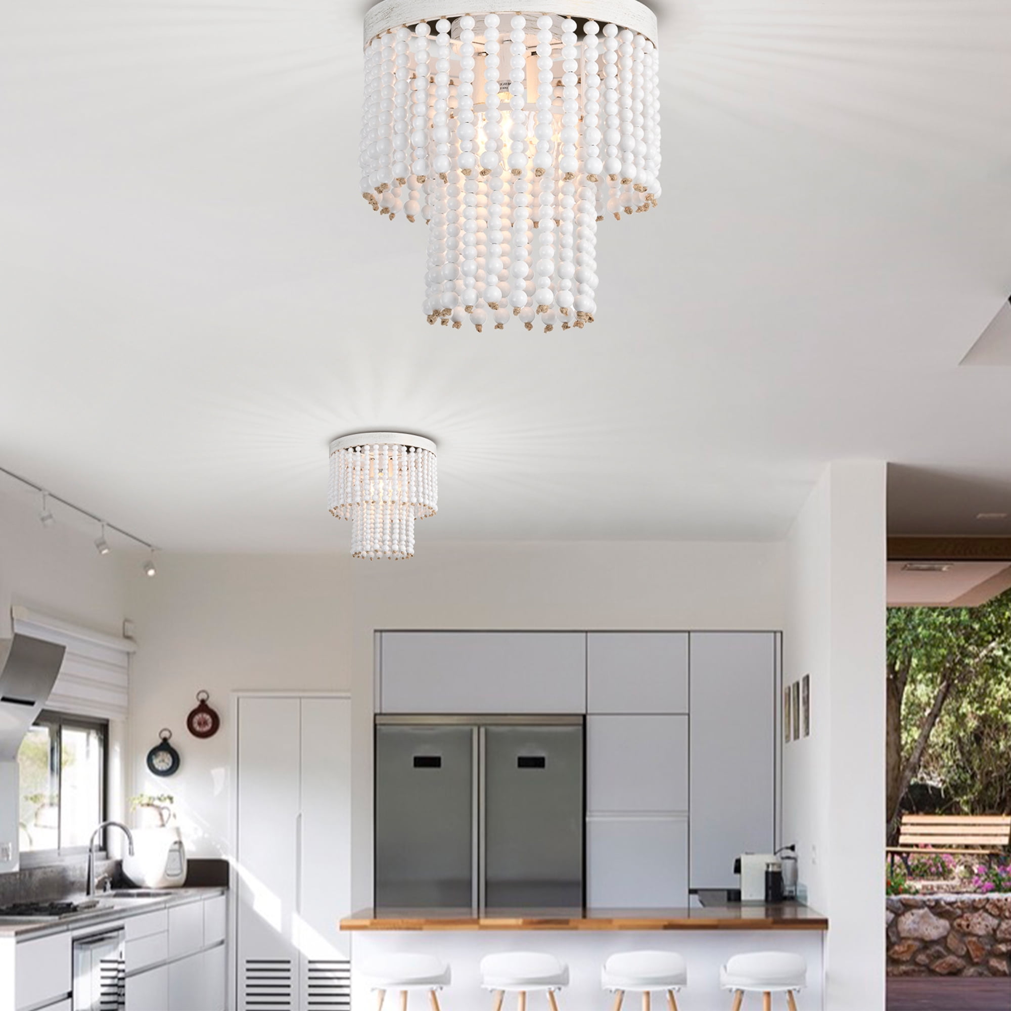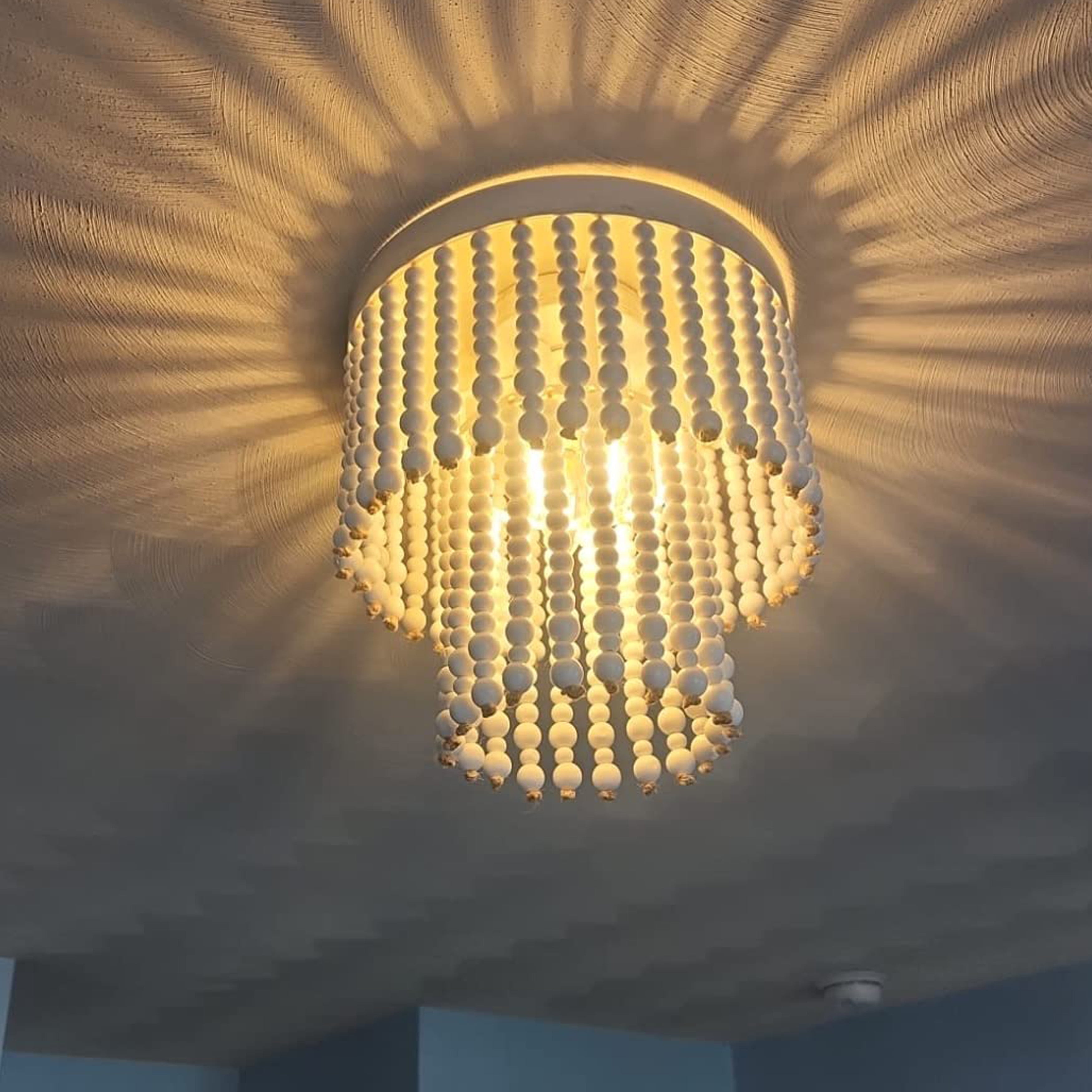Flush mount ceiling light with whitewashed solid wood beads painted by hand, heavy-duty metal backplate, which meets the sustainability standards with rust-proof, fade-proof. So that the bohemia style of this dining room chandeliers can be maintained as much as possible. The infinitely graceful look of the wood bead light work well with your existing décor from rustic farmhouse to modern contemporary, lend vibrancy to your space and increase the value of your home. Farmhouse light fixtures does not need to splicing wooden beads by hand, we have fixed it in advance to save your time and prevent the wooden beads from missing, you just need to follow the instructions in the package for quick installation. Good service: if you have any question about boho light fixtures ceiling, feel free to let us know and we will give the best solution within 12 hours. Premium Material: Wood Beads and Metal Dimmable: Fully dimmable with compatible dimmer switch Bulbs Specifications: Requires 3 x E12 bulbs (bulbs not included), compatible with LED, Edison, Incandescent, Compact Fluorescent etc. Fixture Dimension: 11.6 inches in diameter x 11.6 inches high