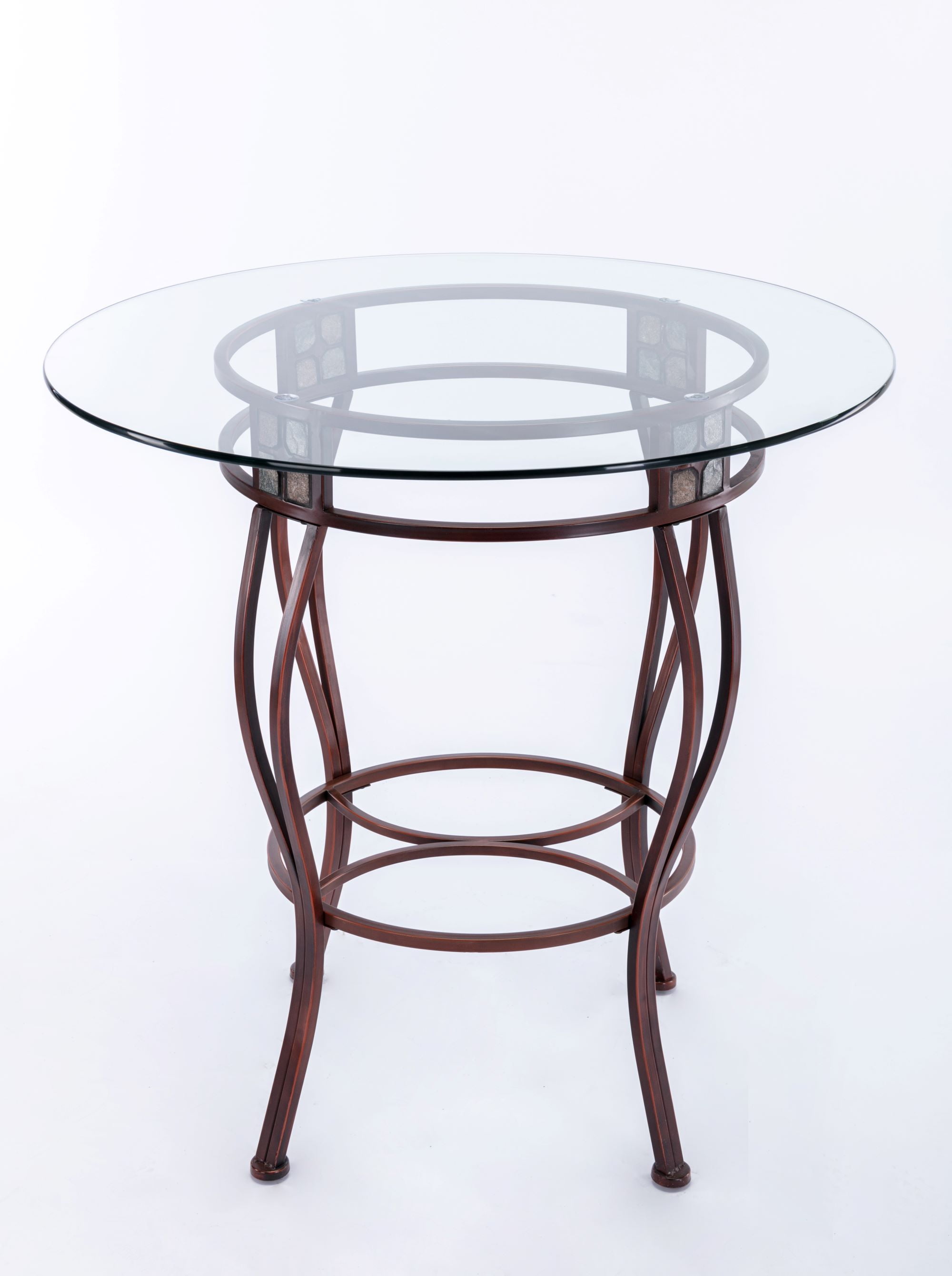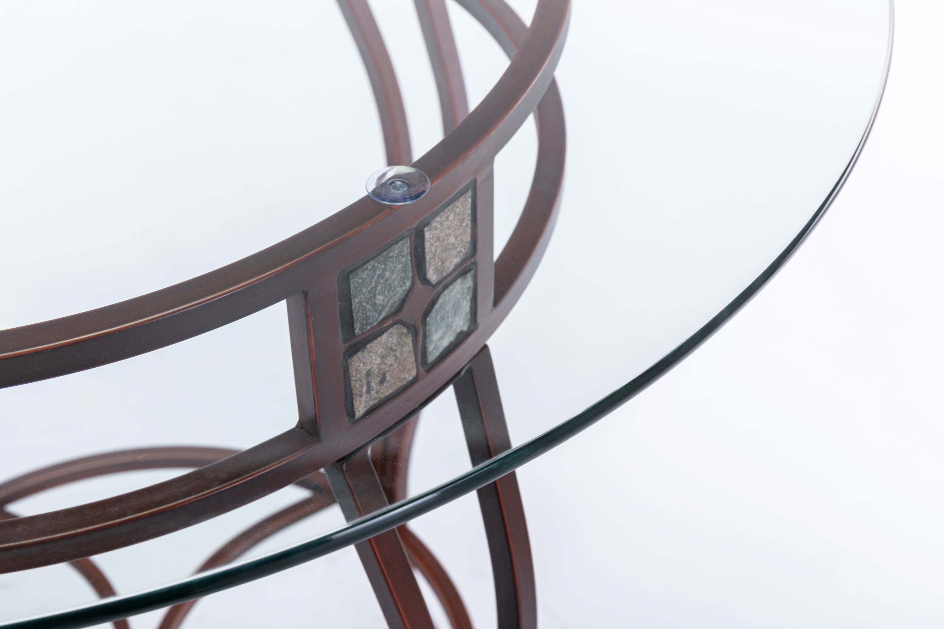 Constructed with a sturdy metal frame Metallic bronze finish Round beveled glass tabletop Slate mosaic accents Lightly tapering legs