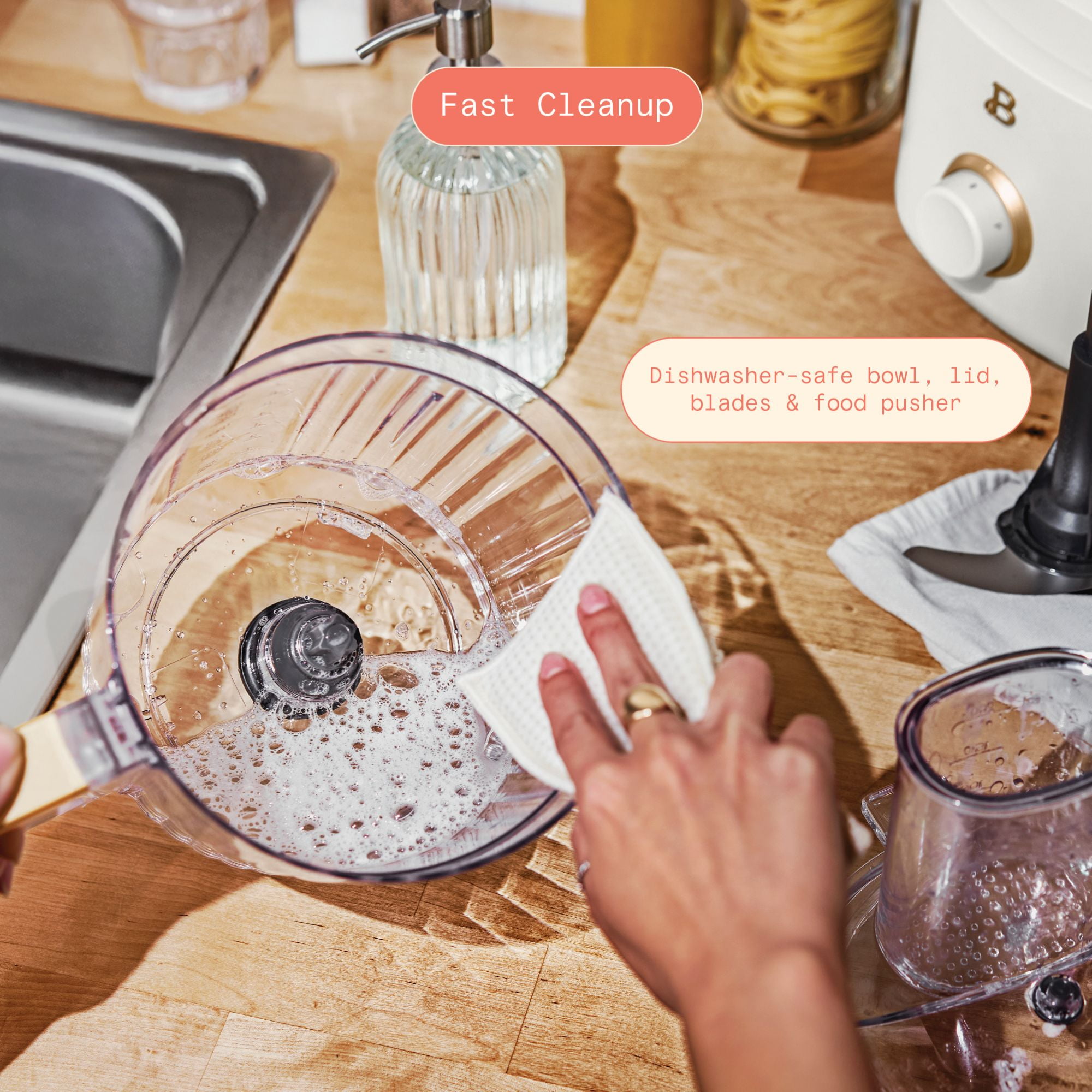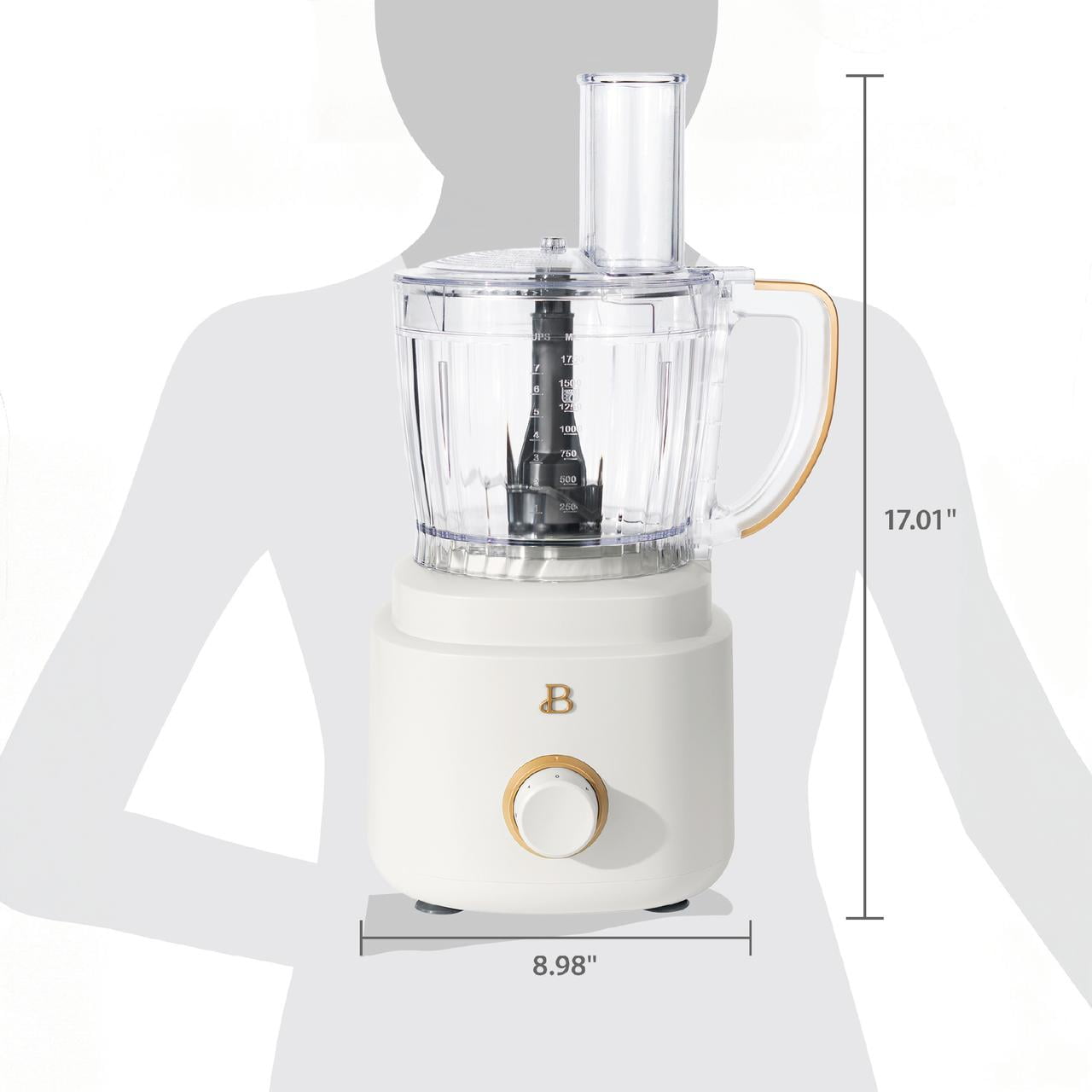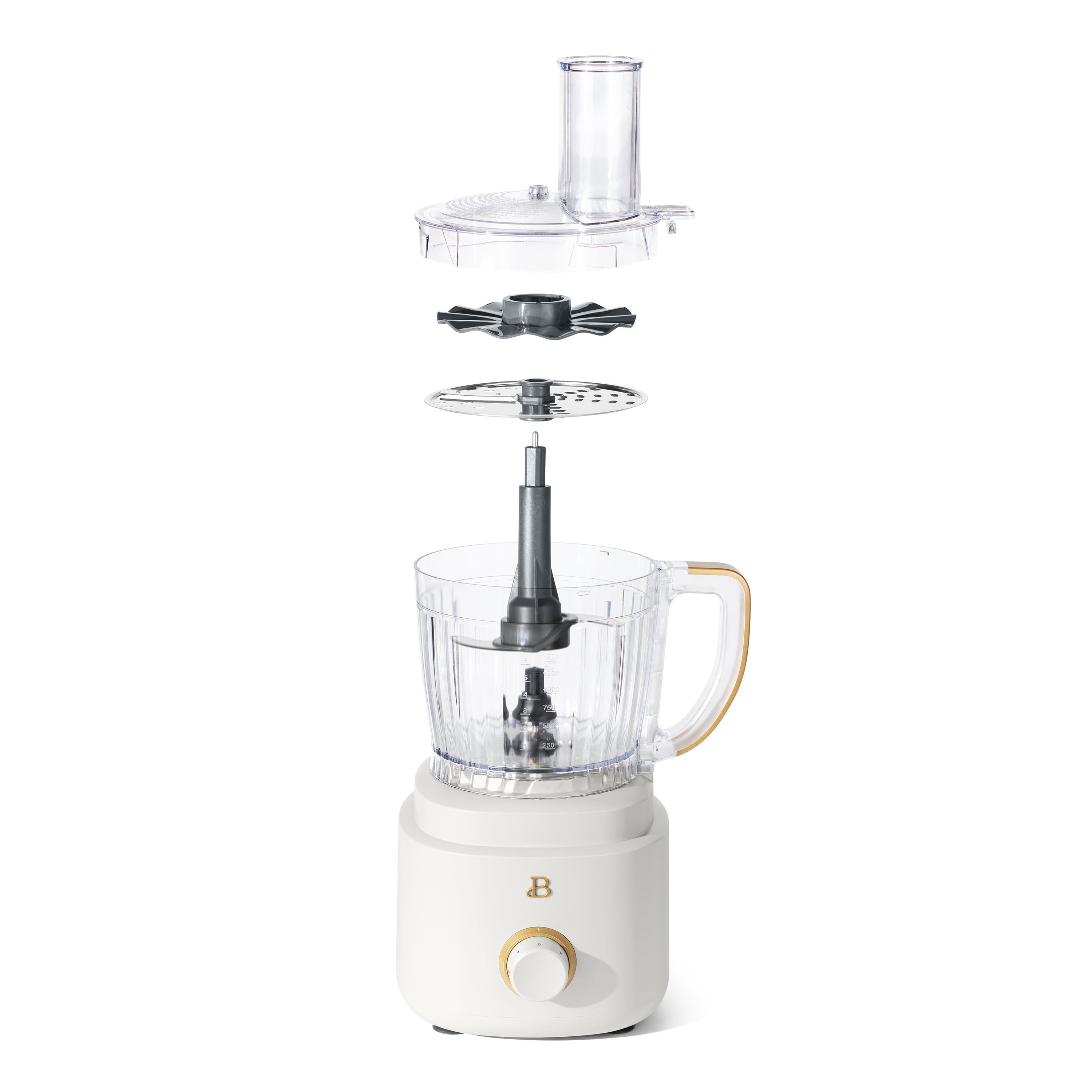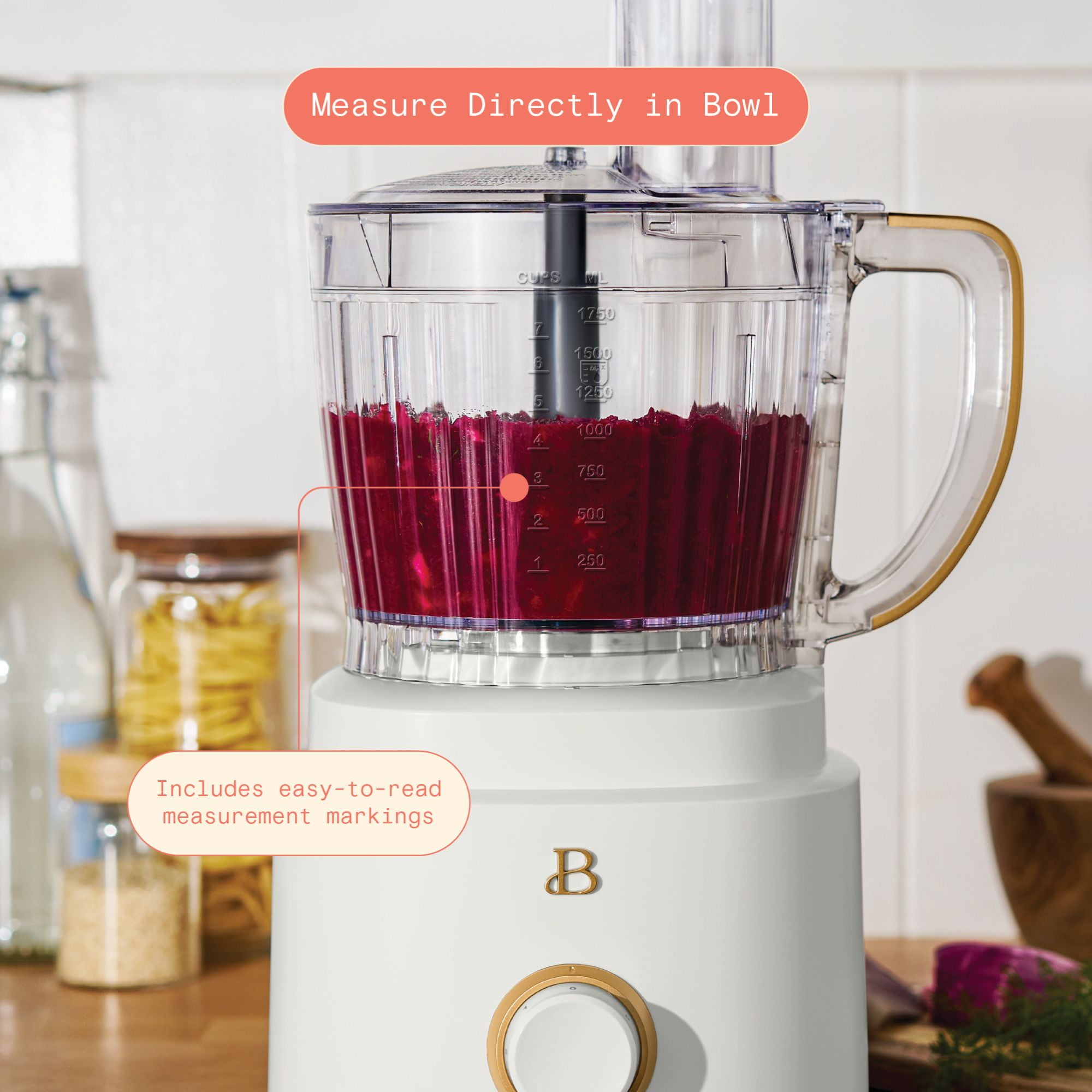 10-cup capacity makes it easy to prep large meals 500-watt motor delivers powerful performance for precision processing Variable speed control dial with Low, High, and Pulse settings for ultimate control 3-inch extra-wide feed tube allows you to add ingredients without stopping the process Twist-and-lock system ensures secure, safe operation Measurement markings in the bowl make it easy to measure directly while processing Dishwasher-safe parts make cleanup a breeze All accessories fit inside the bowl for space-saving storage Beautiful by Drew Barrymore available exclusively at