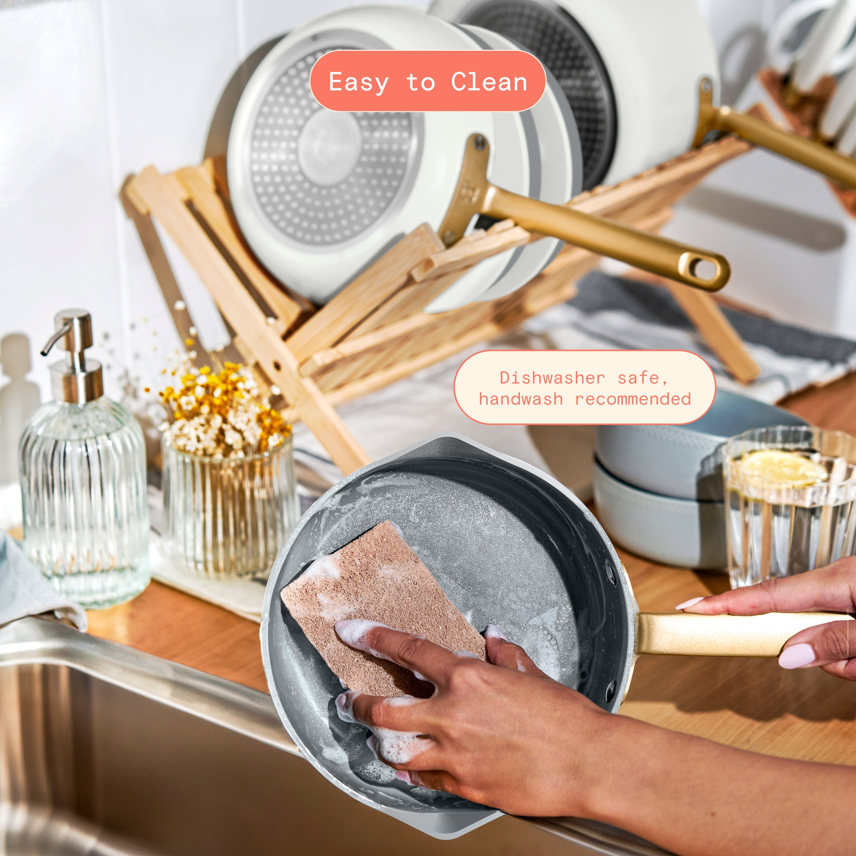 Sophisticated cookware with a thoughtful design? Yes, please. Meet the Beautiful 12-Piece Ceramic Nonstick Cookware Set. Our set includes a 3qt sauté pan, 2qt saucepan and 5qt casserole pan that all come with integrated pour spouts and lids with strainers built right in to minimize messy pours. All the cooking vessels are made with EverGood™ Ceramic Nonstick Coating. The cookware and lids are oven safe to 500°F and compatible with all stovetops—including induction. The pieces are dishwasher safe, we recommend hand washing.