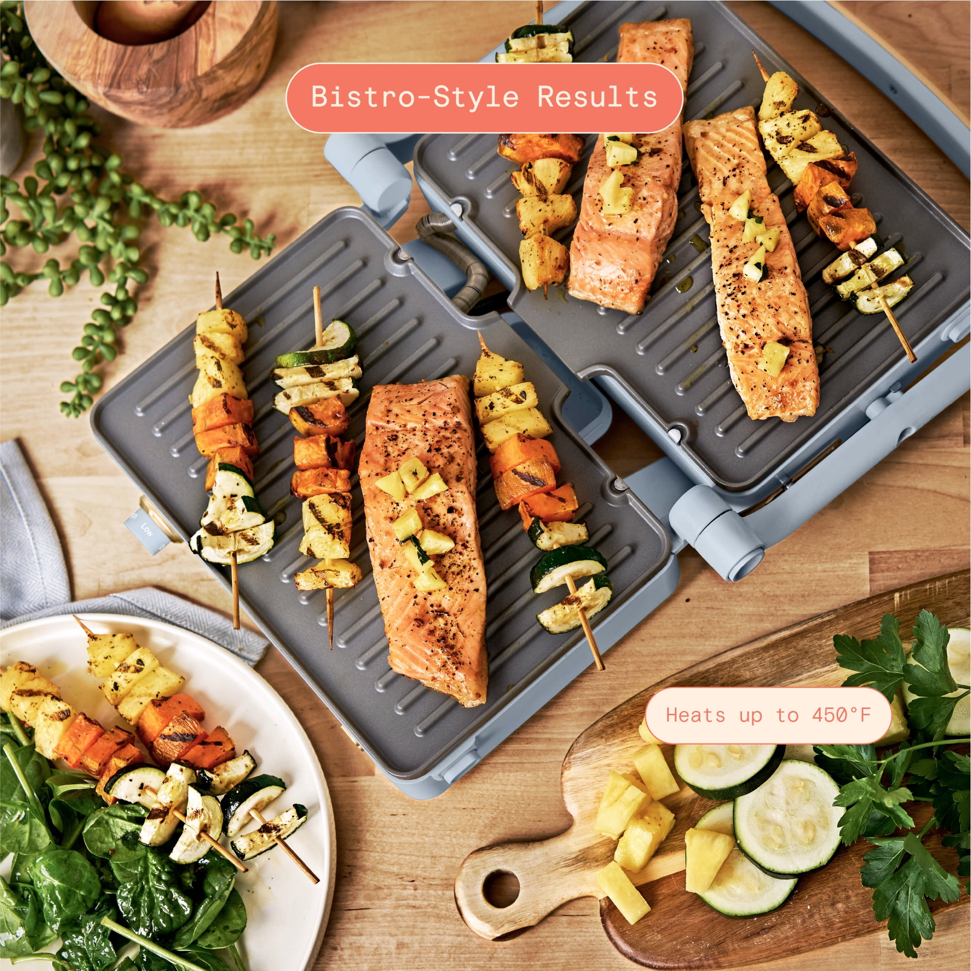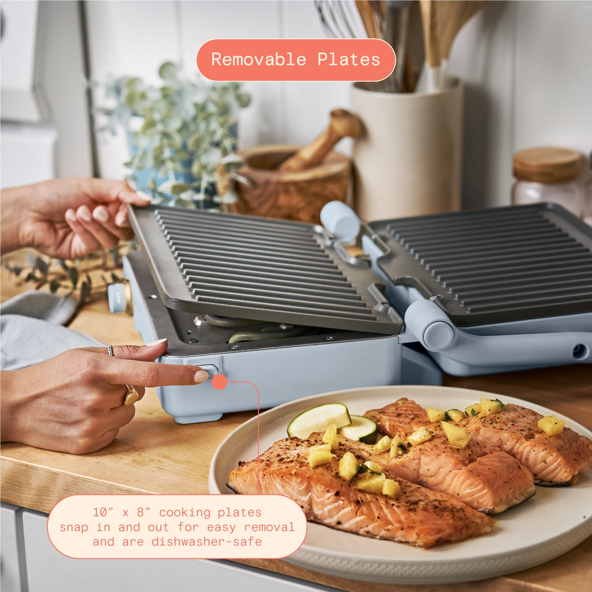 2-in-1 cooking appliance makes crispy panini sandwiches or opens to use as an indoor grill 10.25” x 7” cooking plates fits two paninis at one time Powerful 1200 watt system heats up to 450° F Removable plates feature non-stick coating made with non-stick coating 2” floating hinge automatically adjusts for thick or thin sandwiches Adjustable temperature control dial Cool-touch handle for safe use Long-lasting metal top housing with matte premium finish Comes in Cornflower Blue Available exclusively at Condition: new