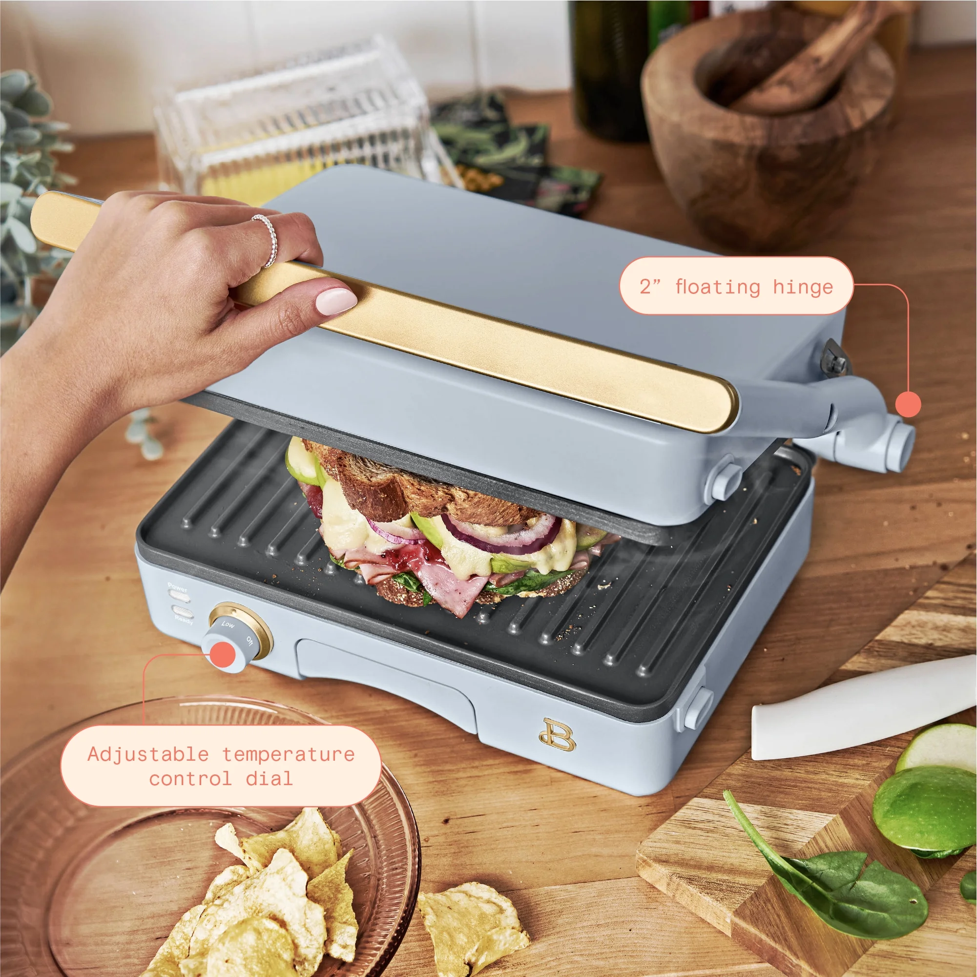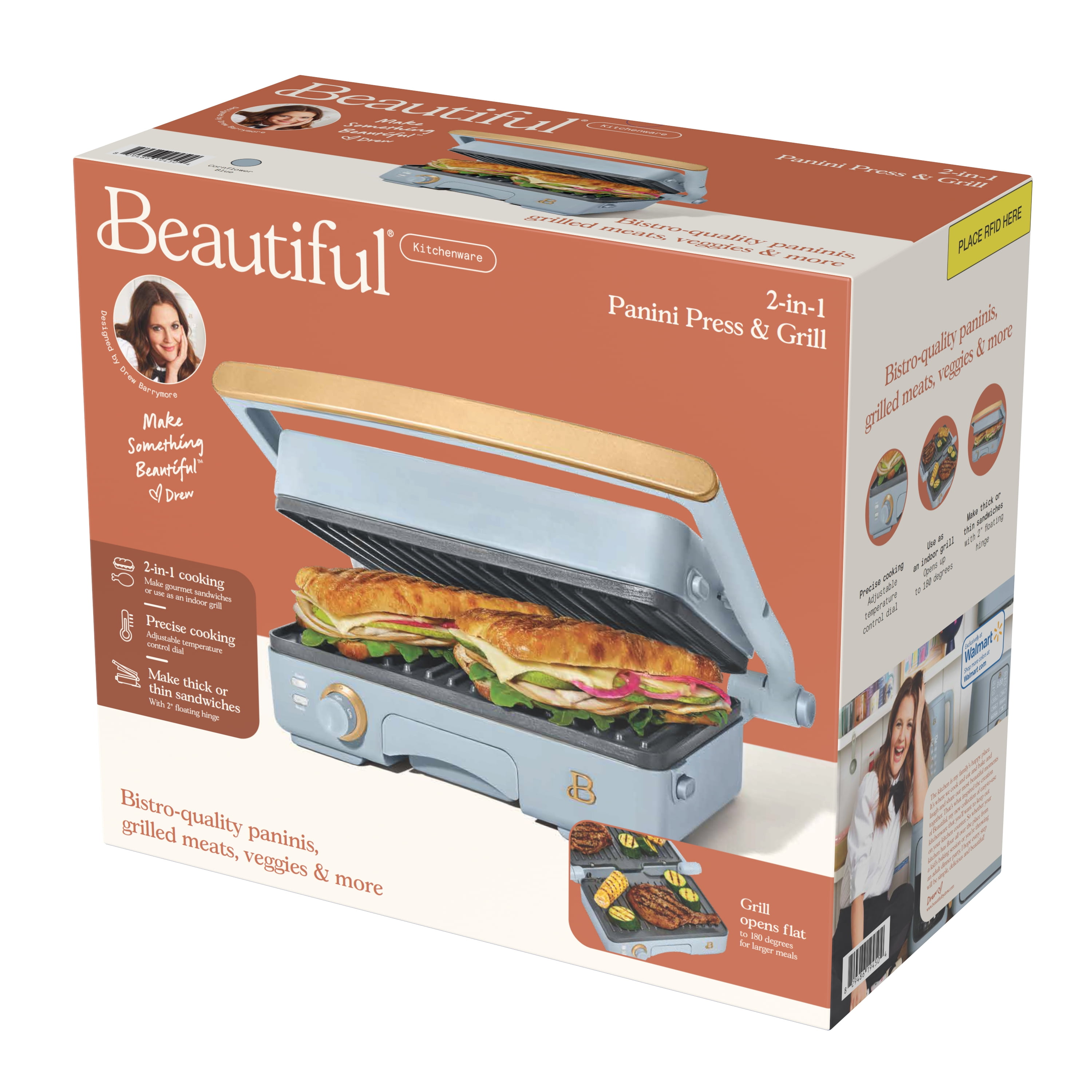 Who doesn’t love a crunchy, toasty and gooey treat? Create bistro-quality panini sandwiches at home anytime a craving hits with the Beautiful 2-in-1 Panini Press & Grill. This genius multitasker features a powerful 1200 watt heating system so you can press delicious, evenly cooked panini sandwiches or open it up for use as an indoor grill for cooking chicken, veggies, smashburgers and more. The generously sized 10.25” x 7” cooking plates fit two paninis at once and made with non-stick coating for easy food release and clean-up. The 2” floating hinge automatically adjusts for thick or thin sandwiches, while the adjustable temperature control dial and ready indicator light combine for a perfect cooking experience. Built-in extras like the cool-touch handle and removable dishwasher-safe drip tray keep safety and effortless cleaning top of mind. Available in Cornflower Blue with signature gold accents. Exclusively at . Condition: new.