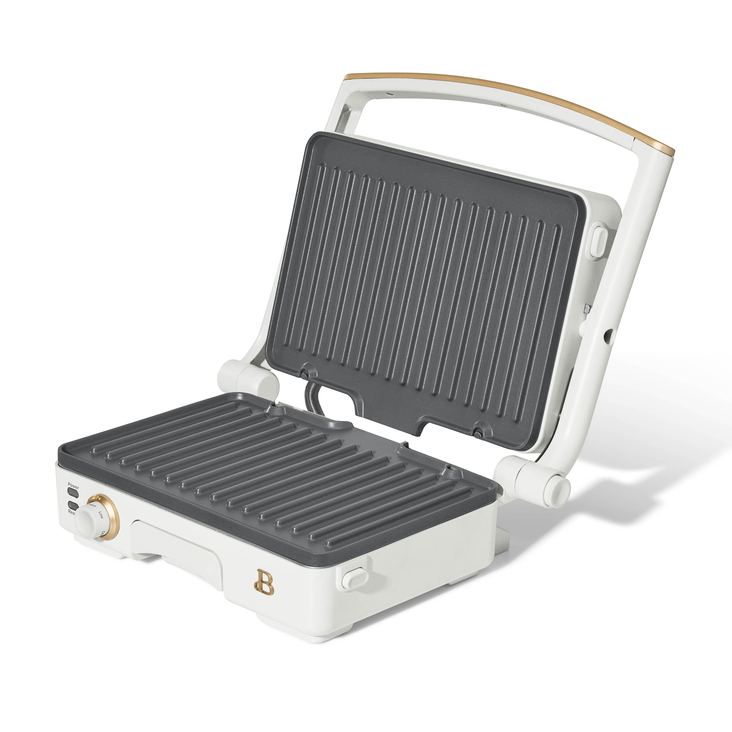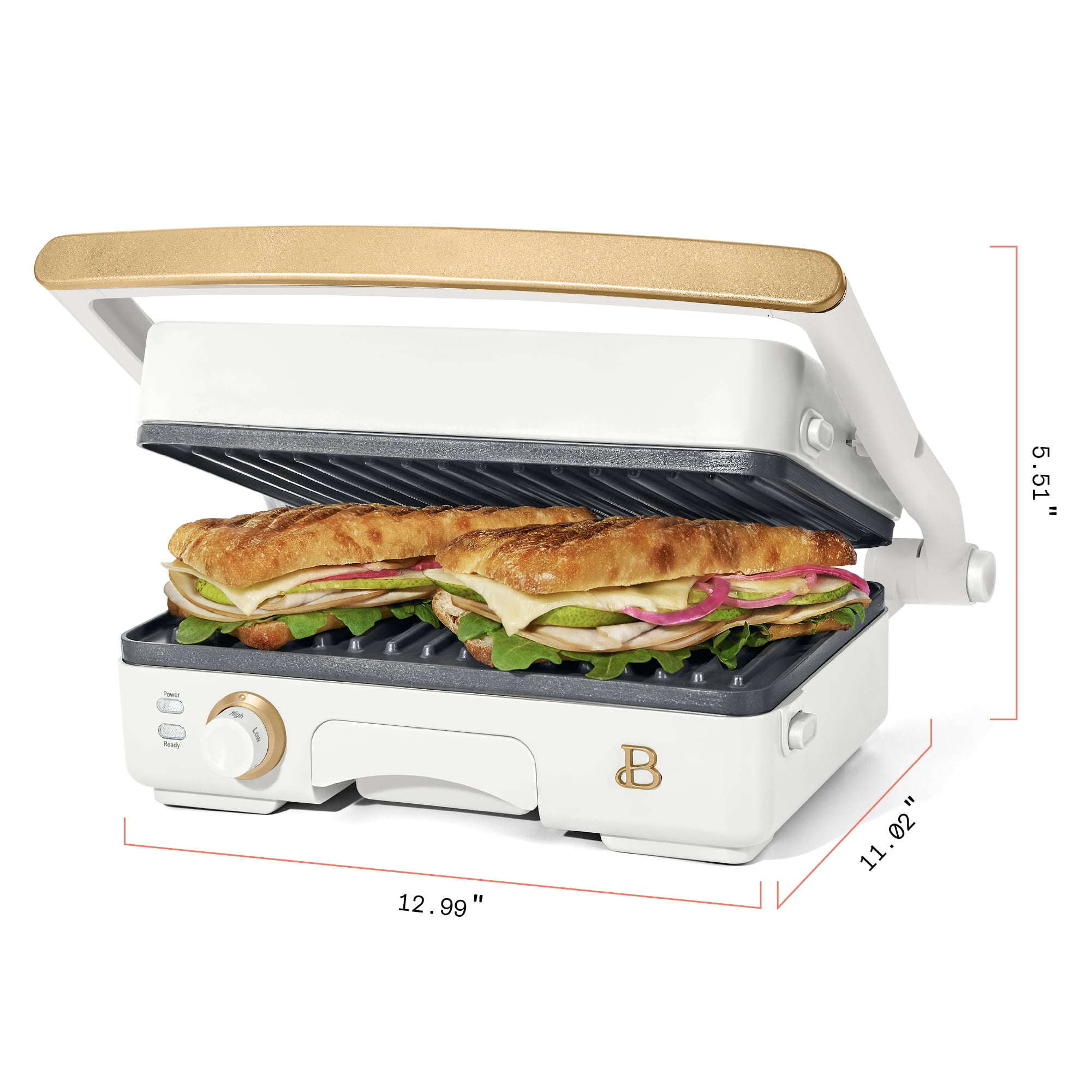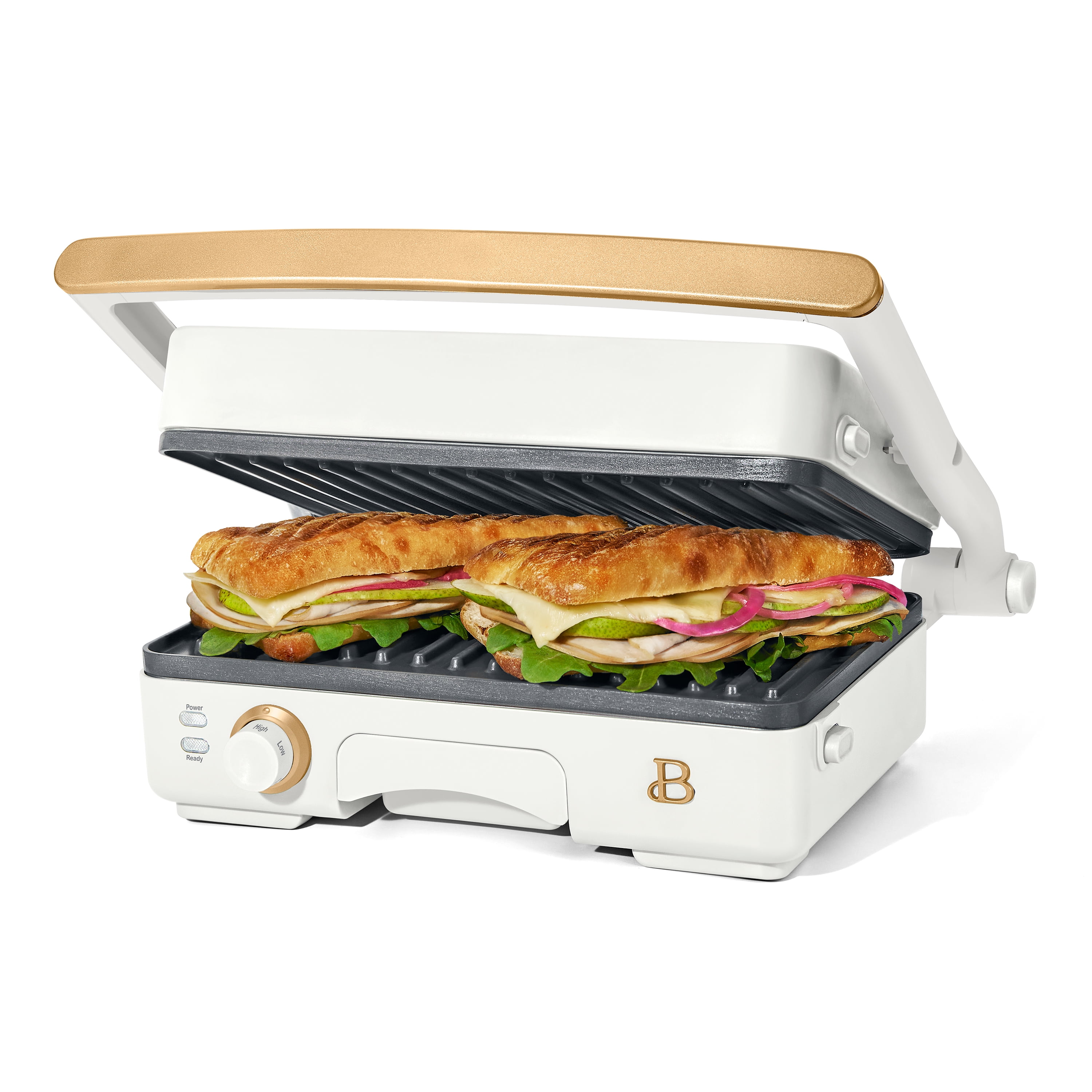 Who doesn’t love a crunchy, toasty and gooey treat? Create bistro-quality panini sandwiches at home anytime a craving hits with the Beautiful 2-in-1 Panini Press & Grill. This genius multitasker features a powerful 1200 watt heating system so you can press delicious, evenly cooked panini sandwiches or open it up for use as an indoor grill for cooking chicken, veggies, smashburgers and more. The generously sized 10.25” x 7” cooking plates fit two paninis at once and made with non-stick coating for easy food release and clean-up. The 2” floating hinge automatically adjusts for thick or thin sandwiches, while the adjustable temperature control dial and ready indicator light combine for a perfect cooking experience. Built-in extras like the cool-touch handle and removable dishwasher-safe drip tray keep safety and effortless cleaning top of mind. Available in White Icing with signature gold accents. Exclusively at . Condition: new.