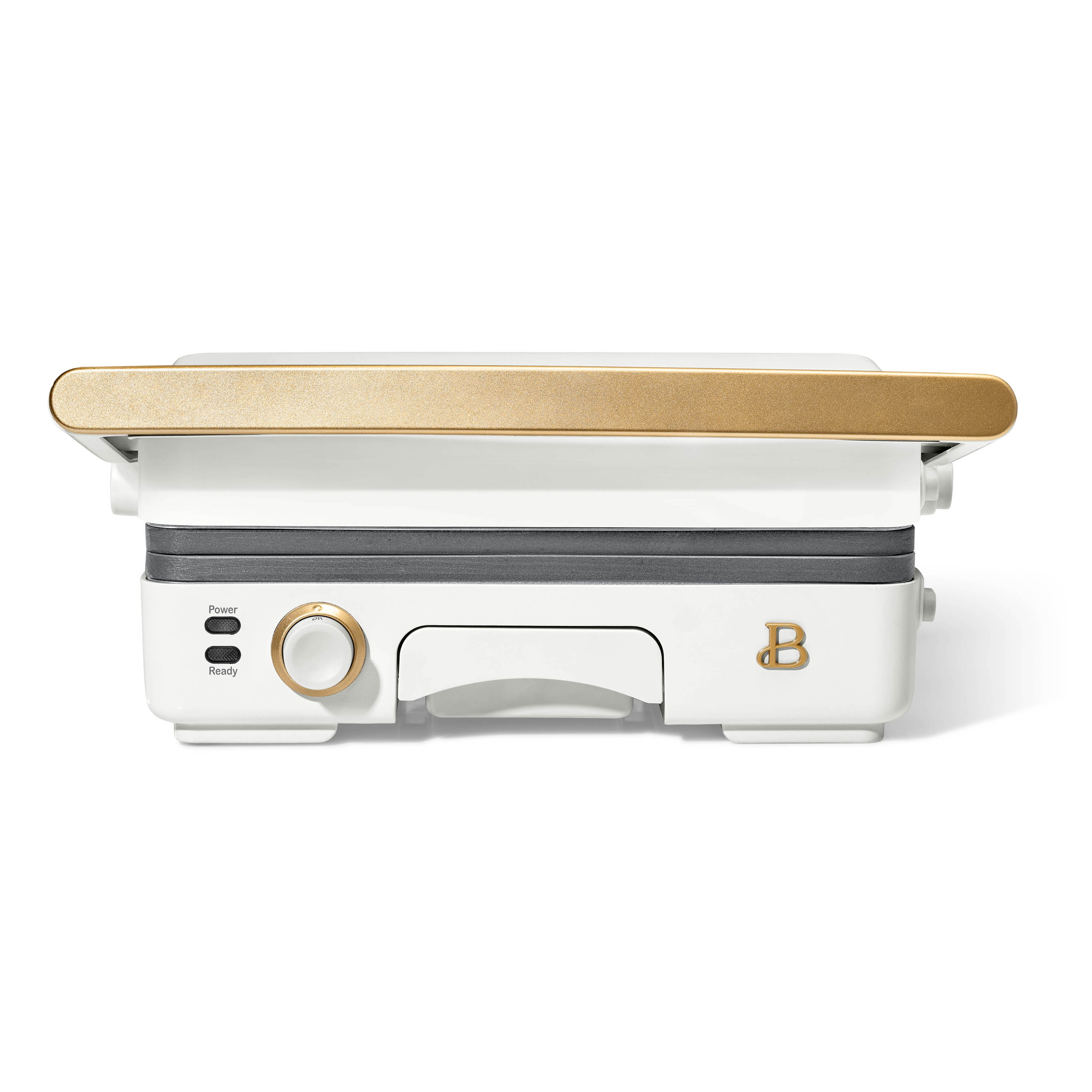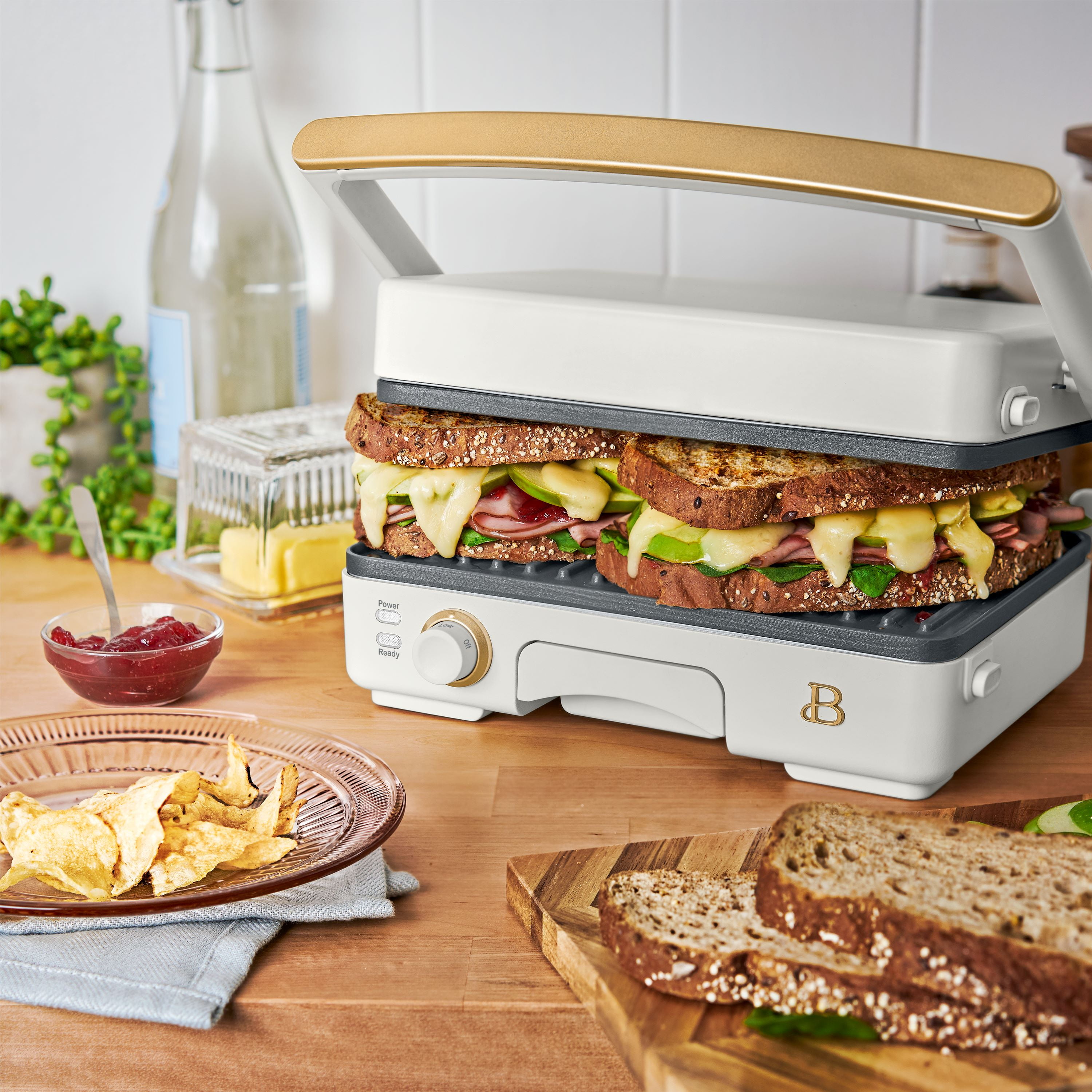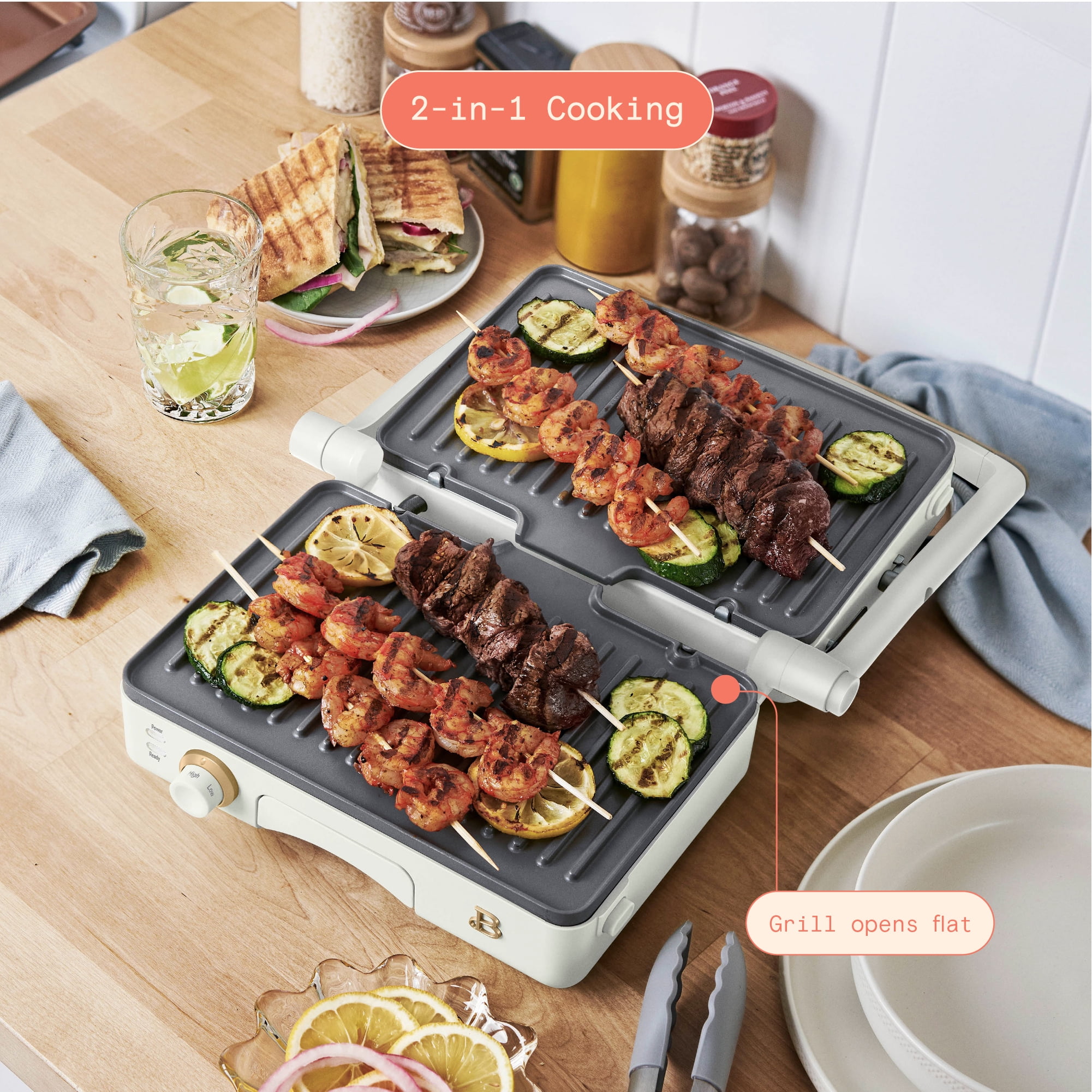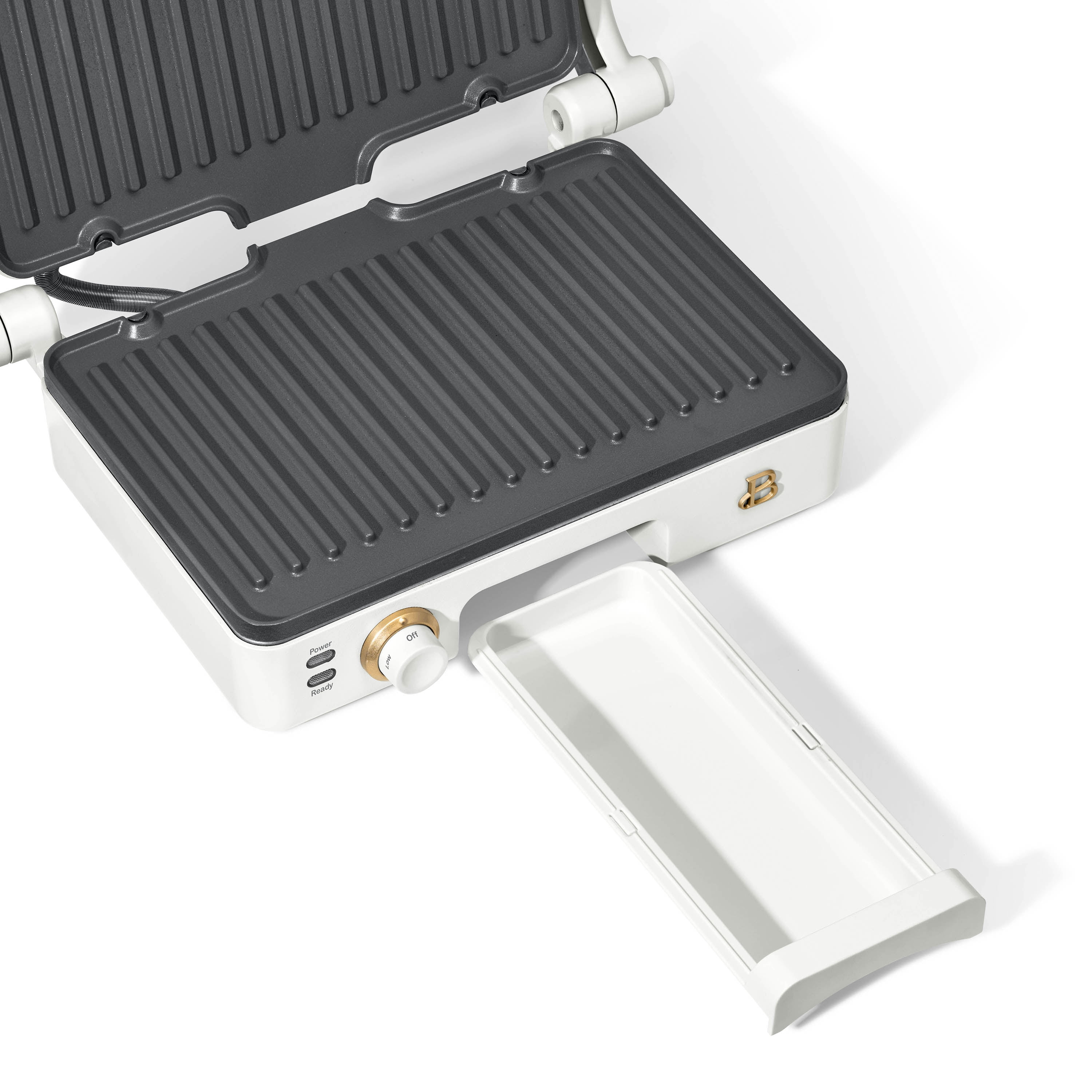Who doesn’t love a crunchy, toasty and gooey treat? Create bistro-quality panini sandwiches at home anytime a craving hits with the Beautiful 2-in-1 Panini Press & Grill. This genius multitasker features a powerful 1200 watt heating system so you can press delicious, evenly cooked panini sandwiches or open it up for use as an indoor grill for cooking chicken, veggies, smashburgers and more. The generously sized 10.25” x 7” cooking plates fit two paninis at once and made with non-stick coating for easy food release and clean-up. The 2” floating hinge automatically adjusts for thick or thin sandwiches, while the adjustable temperature control dial and ready indicator light combine for a perfect cooking experience. Built-in extras like the cool-touch handle and removable dishwasher-safe drip tray keep safety and effortless cleaning top of mind. Available in White Icing with signature gold accents. Exclusively at . Condition: new.