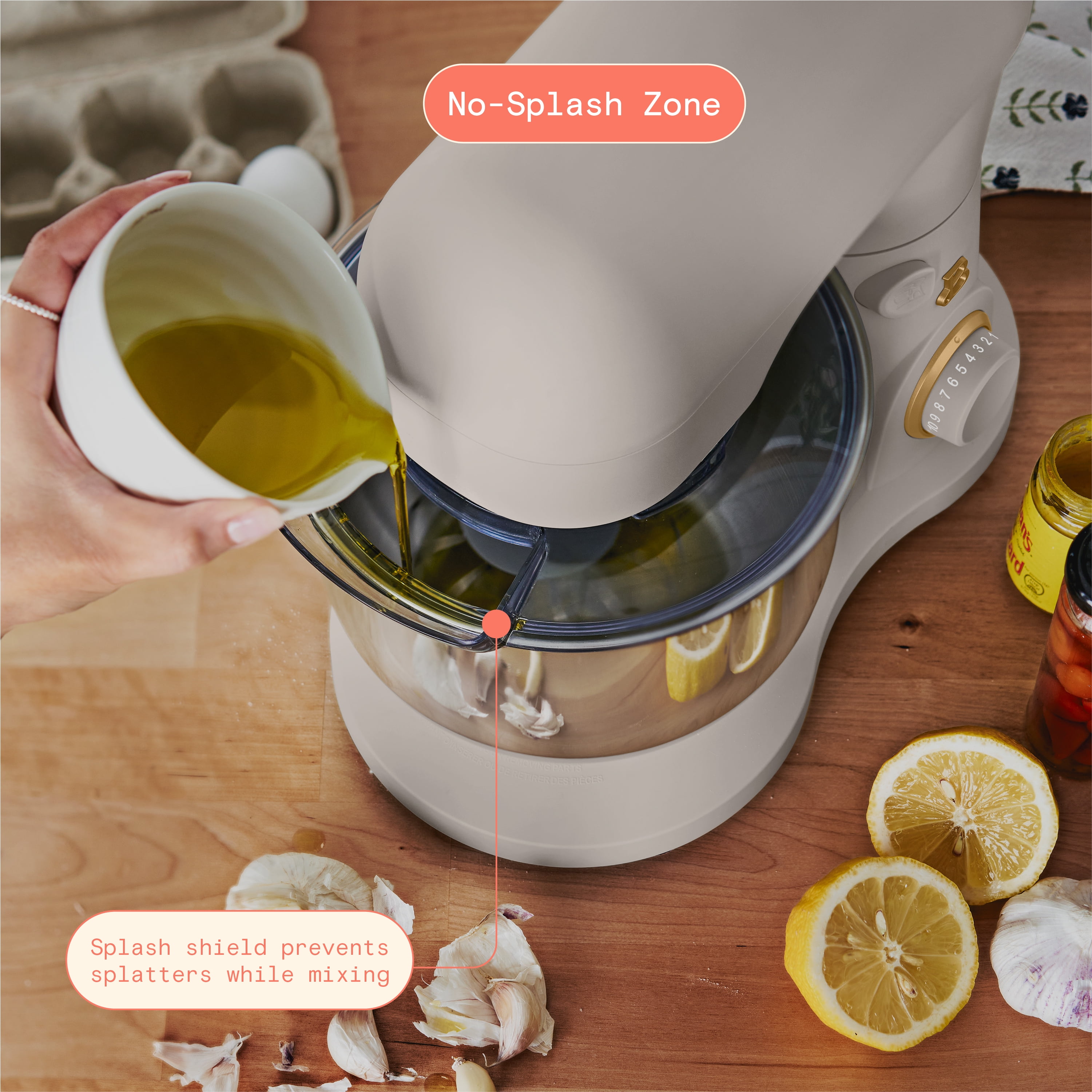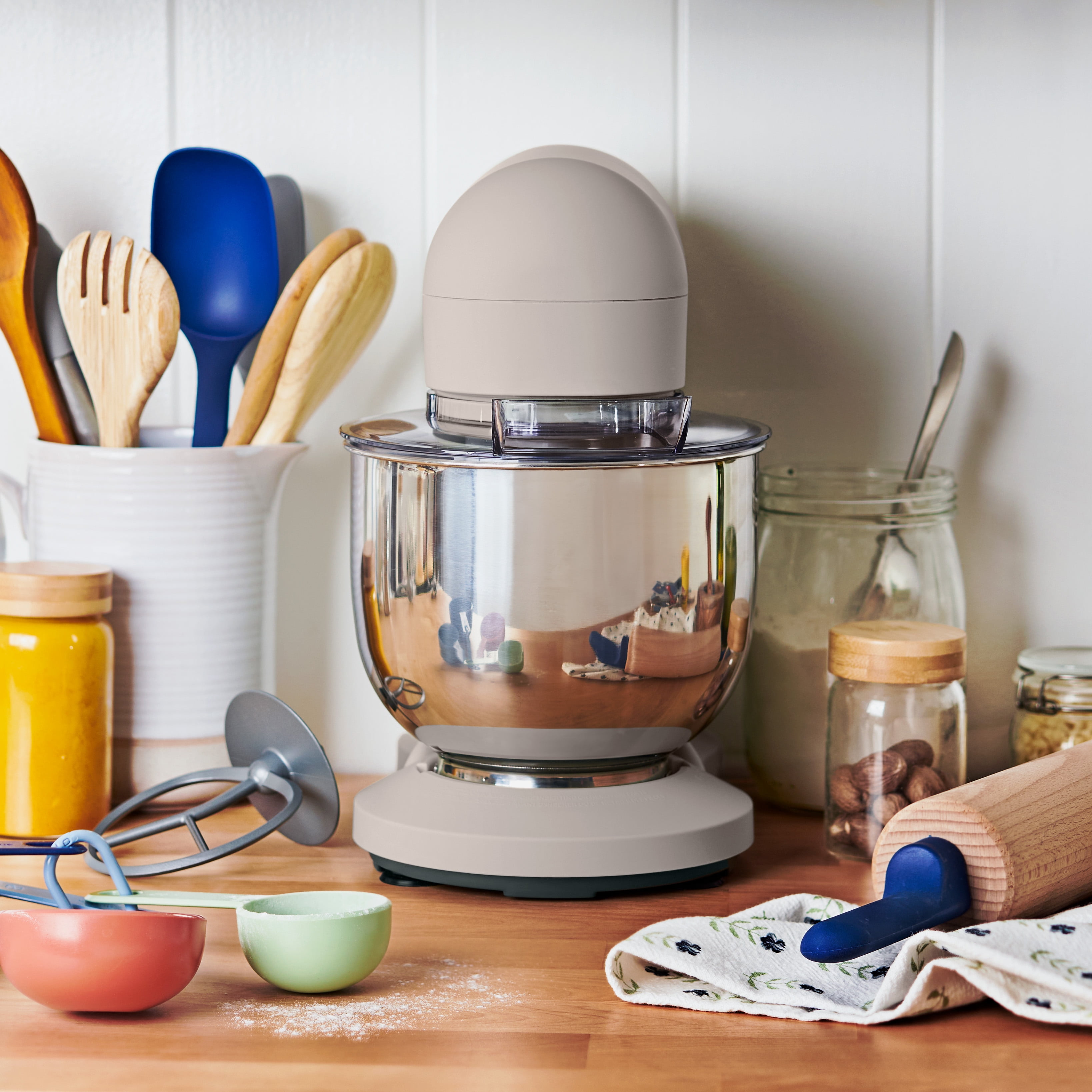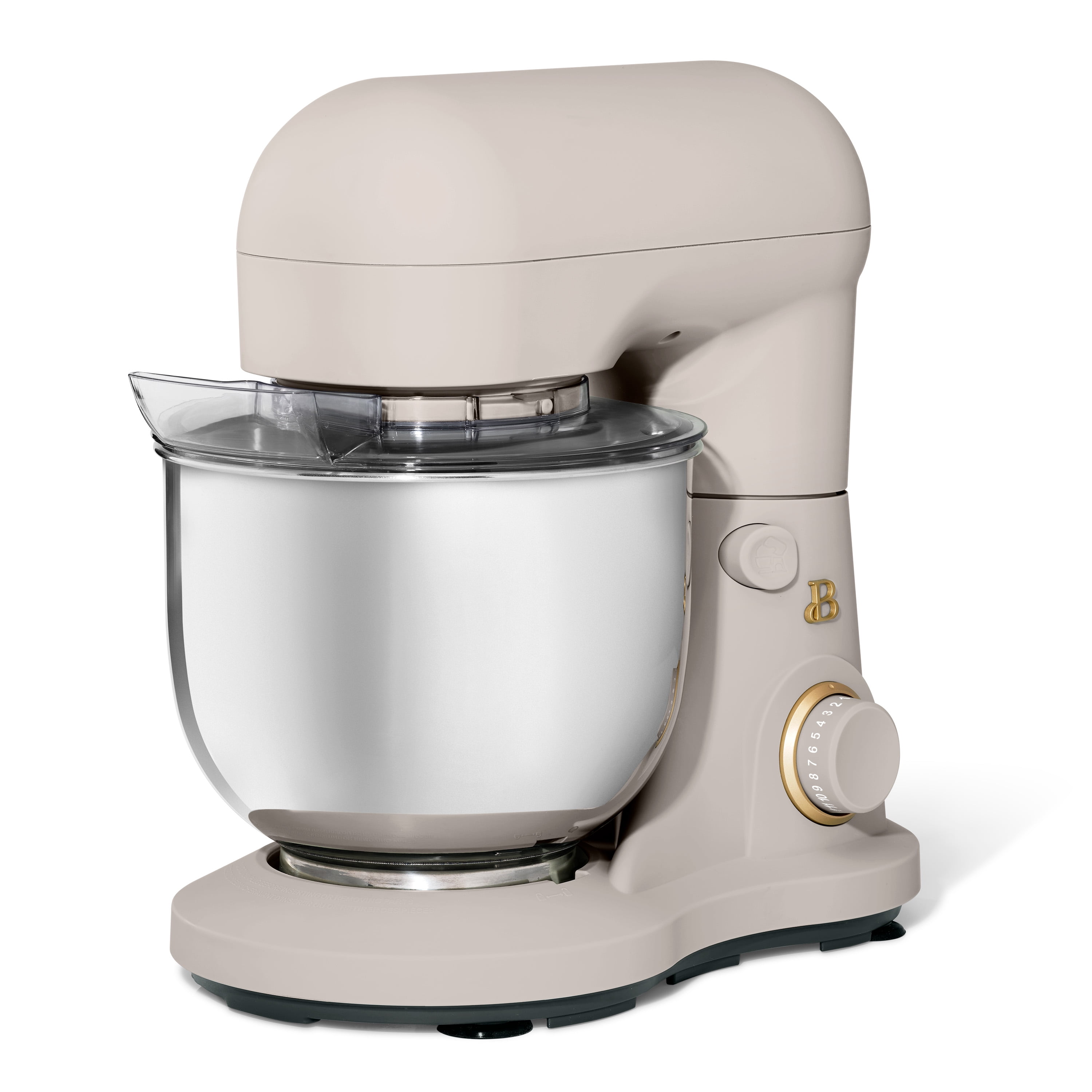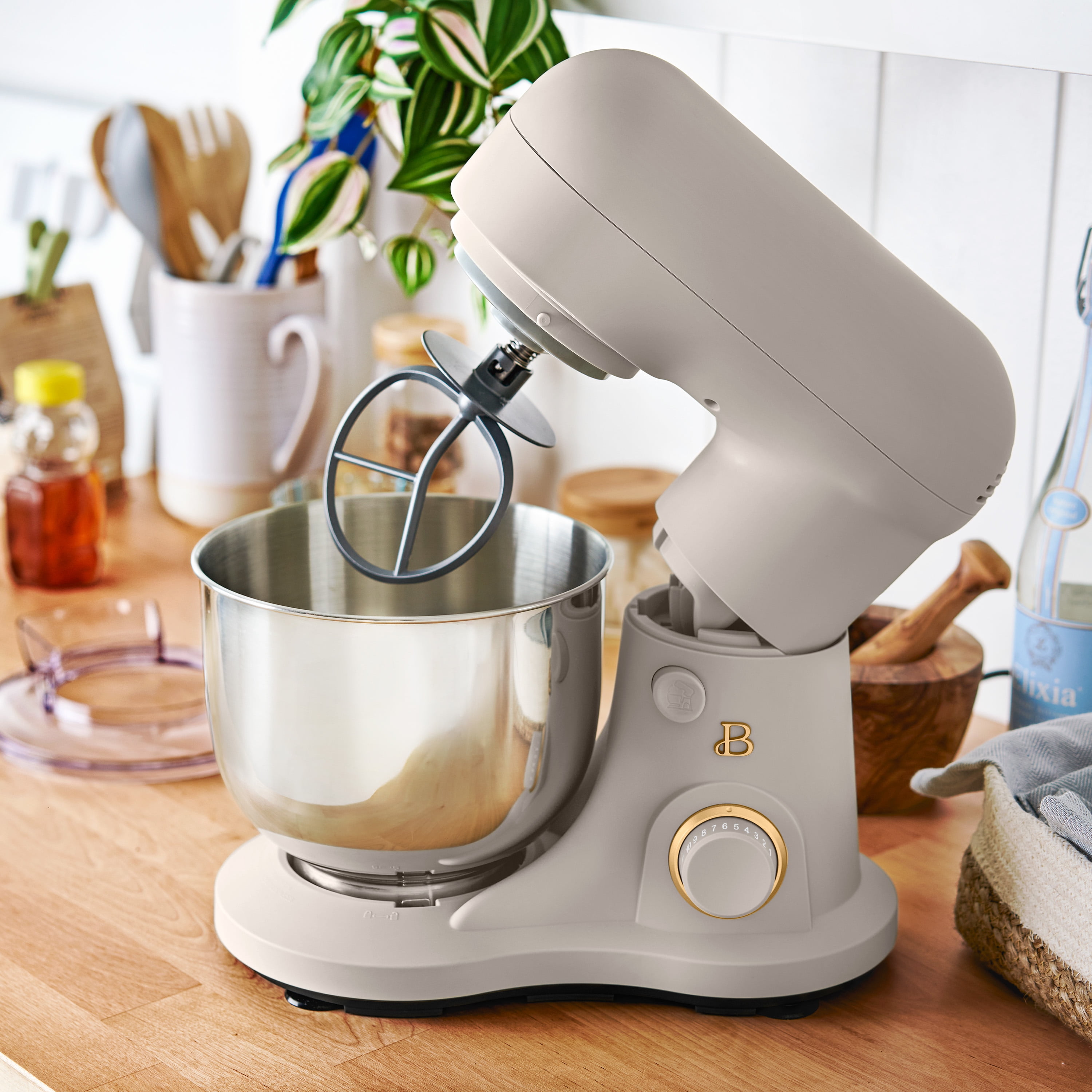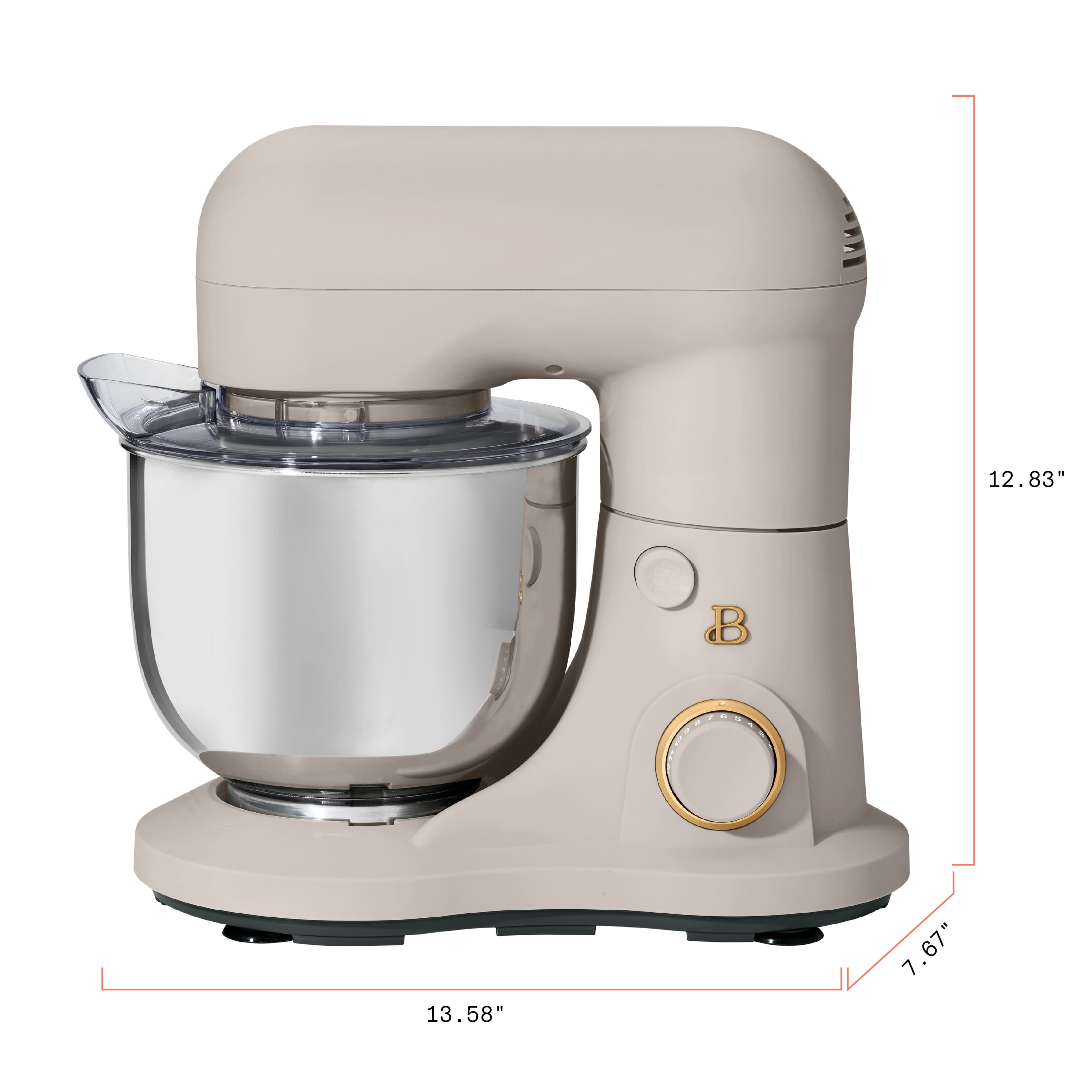 Beautiful 3.5 qt Stand Mixer, Porcini Taupe with Flat Beater, Dough Hook, Balloon Whisk 3.5qt high polished stainless steel mixing bowl with splash guard Can mix up to 5 dozen cookies Powerful 300-watt mixing system 12 optimal speed settings for all your mixing needs Easy-to-use tilt-head design to add ingredients while mixing All accessories are removable, dishwasher safe, and BPA free for safe and easy cleanup Long-lasting material with soft matte premium finish Accessories included: Coated metal flat beater, dough hook, and stainless steel wire balloon whisk