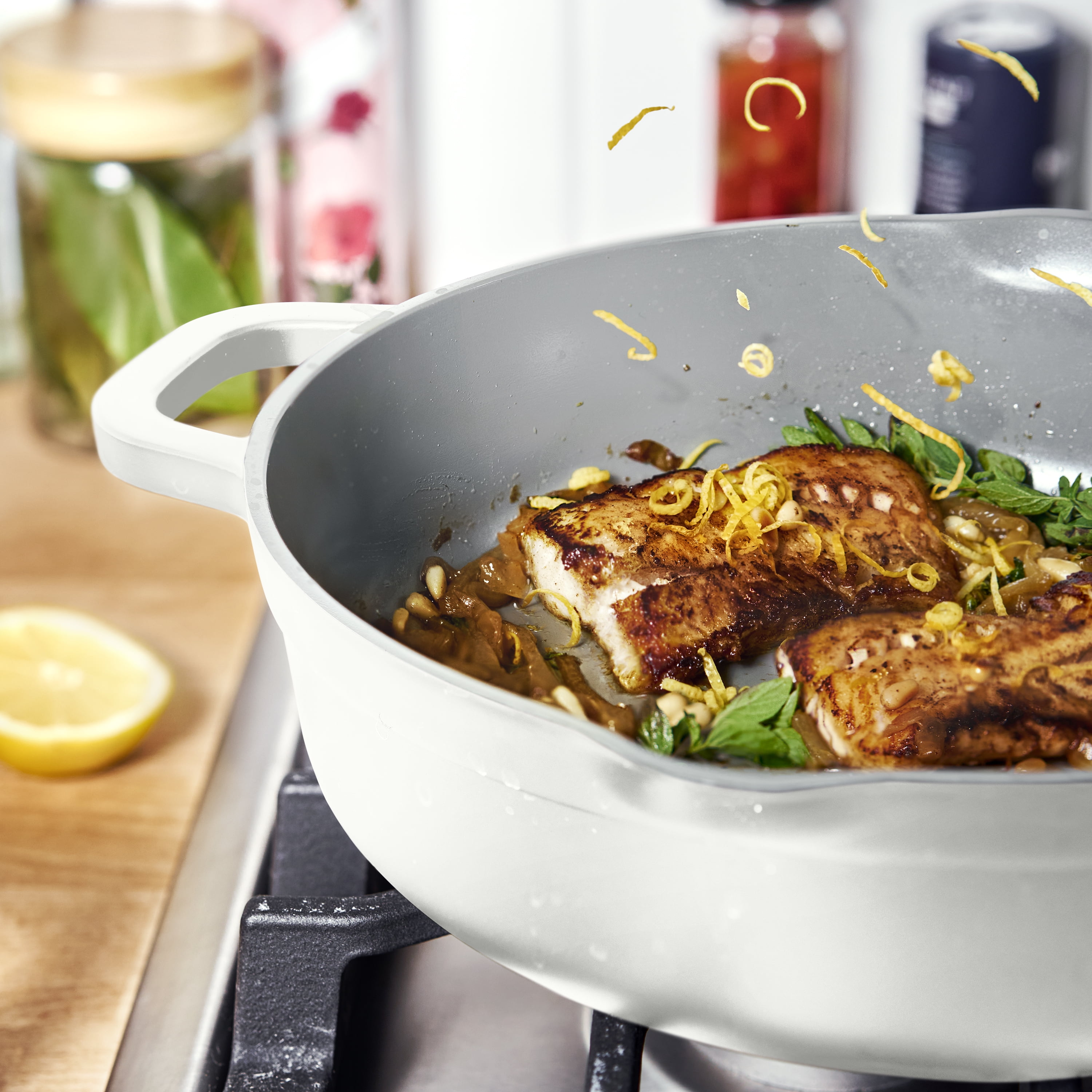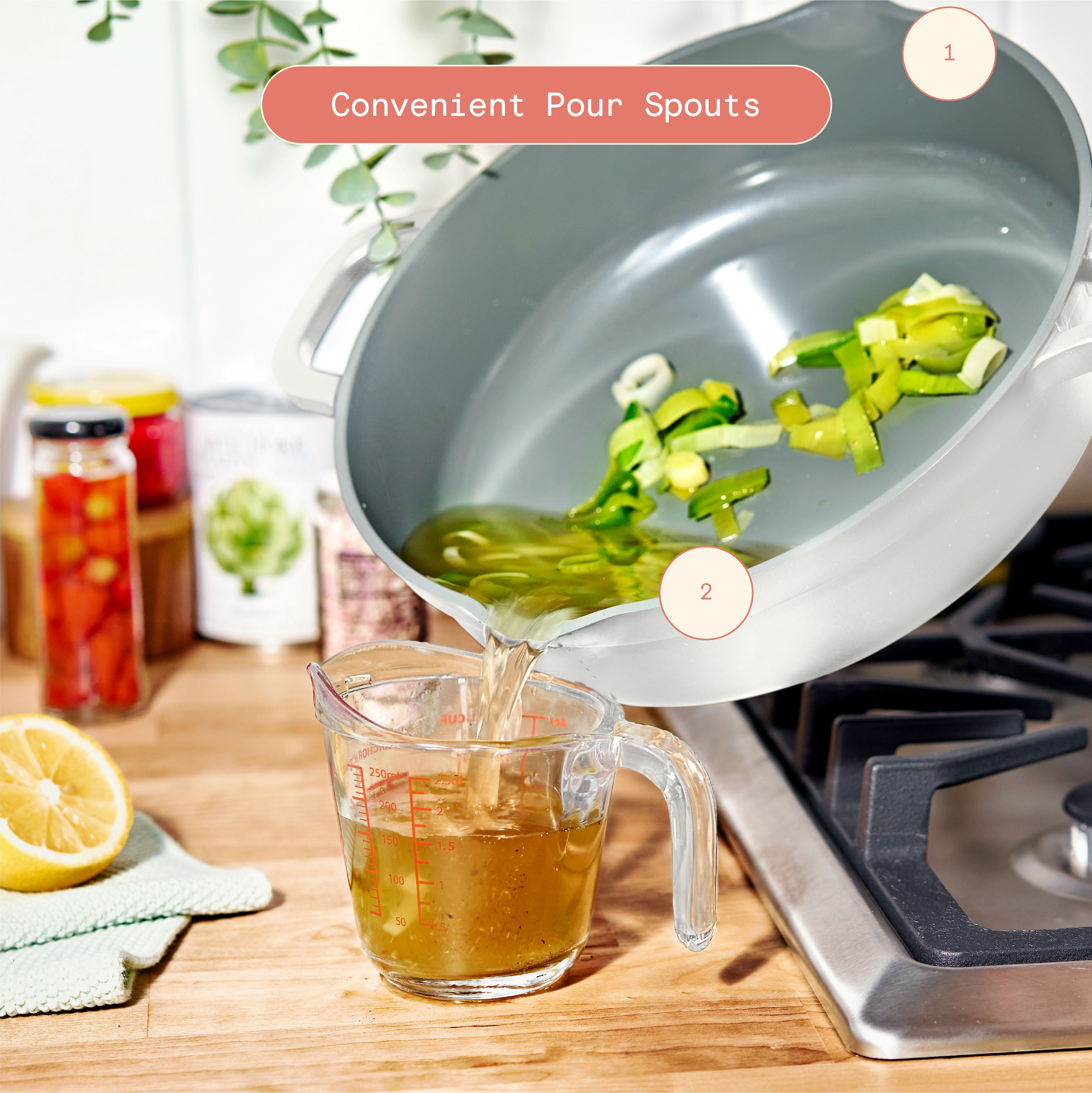 Elevate your everyday meals with the Beautiful 4qt Cast Aluminum Non-Stick Hero Pan, the perfect one pot solution for any kitchen. Boil, Strain, Sauté, Simmer, Pan Fry, Sear, Braise, Steam, Stir Fry, and Serve. The Hero Pan is your versatile all-in-one cooking solution that empowers you to be the hero of your kitchen. The ceramic non-stick coating makes clean-up a breeze. With its lightweight design and convenient pour spouts, this pan is ideal for easy maneuvering. From stovetop to tabletop, simplify your cooking process and impress your guests with delicious meals cooked in just one pan.