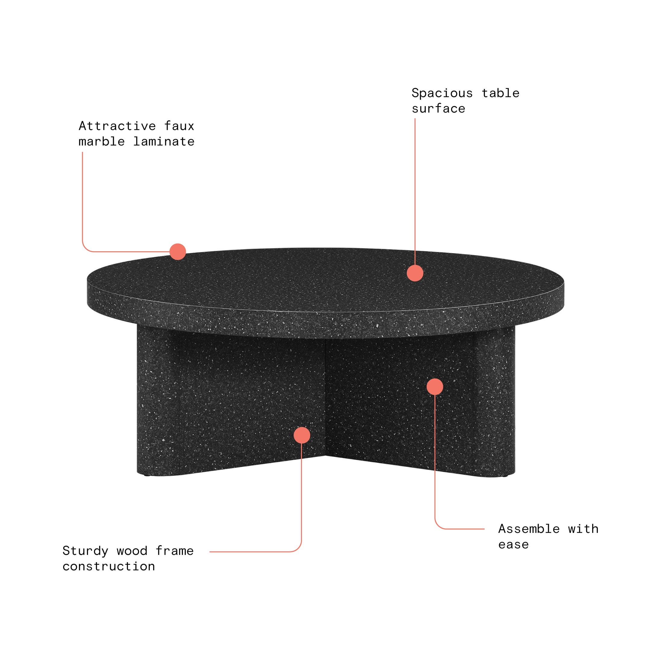 Attractive black faux speckled marble finish Spacious tabletop surface Sturdy wood construction Three-leg style base Assembly required Load Capacity: 100 lb (45.4 kg) Dimensions: 40 in W x 40 in D x 15.25 in H Product Weight: 50.6 lb (22.9 kg) Packaging Dimensions: 43.375 in x 43.375 in x 8.75 in Packaging Weight: 83.7 lb (38 kg) Model# WL-BT-010