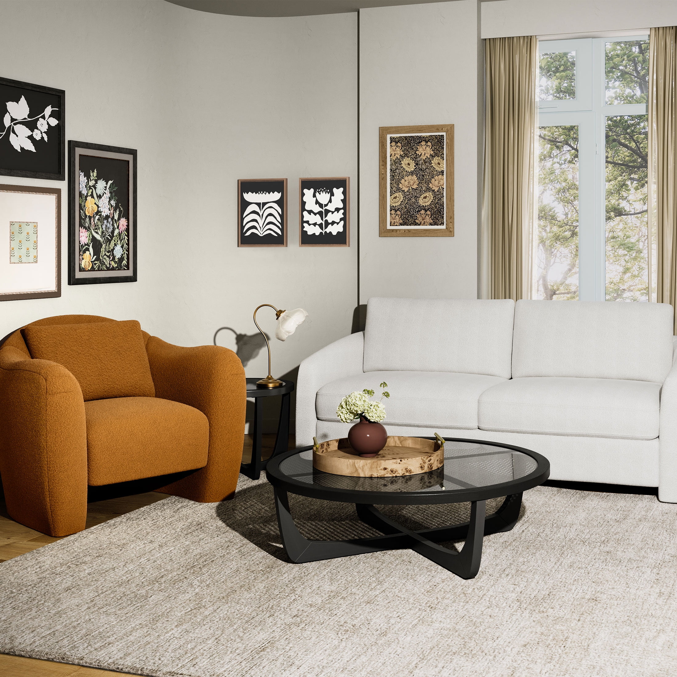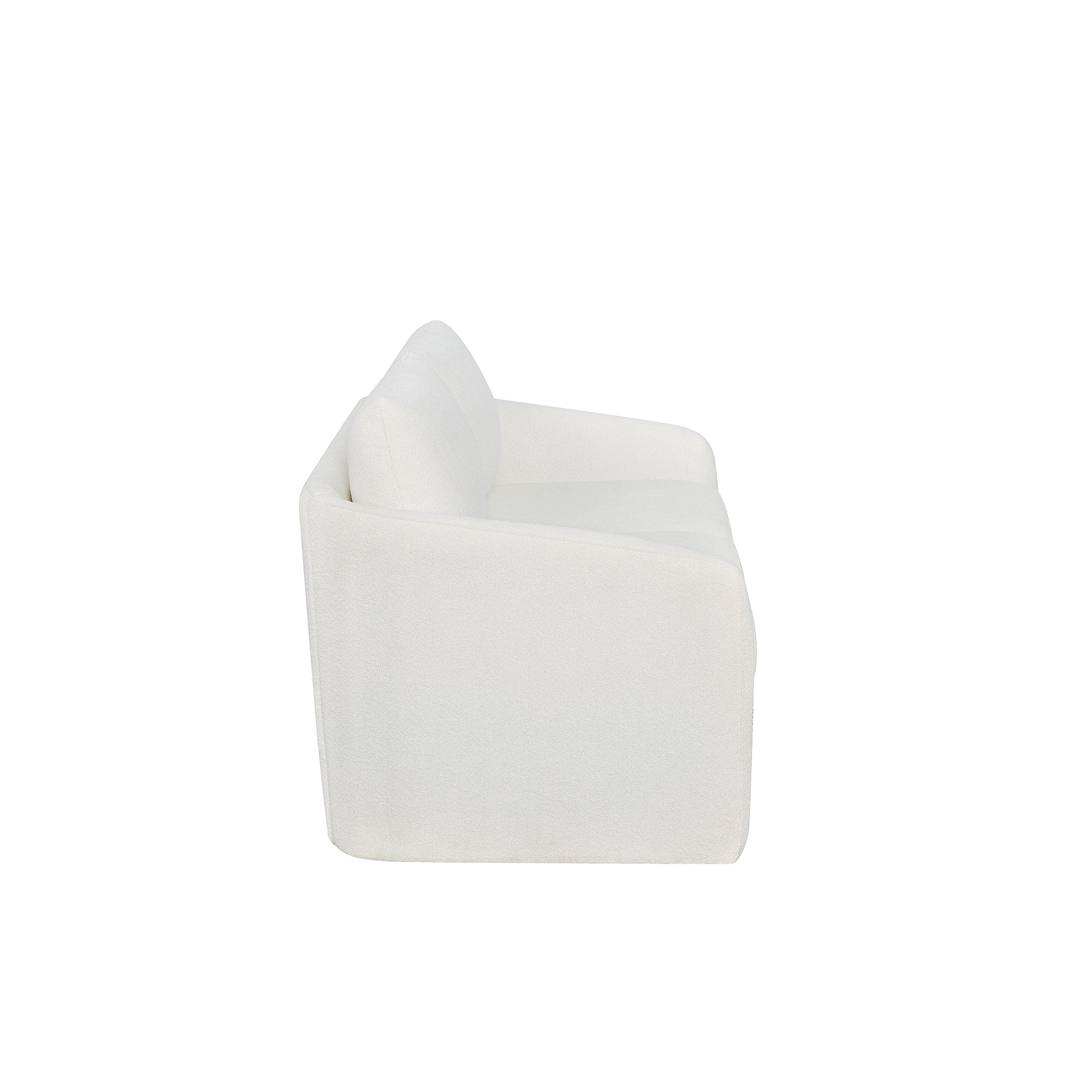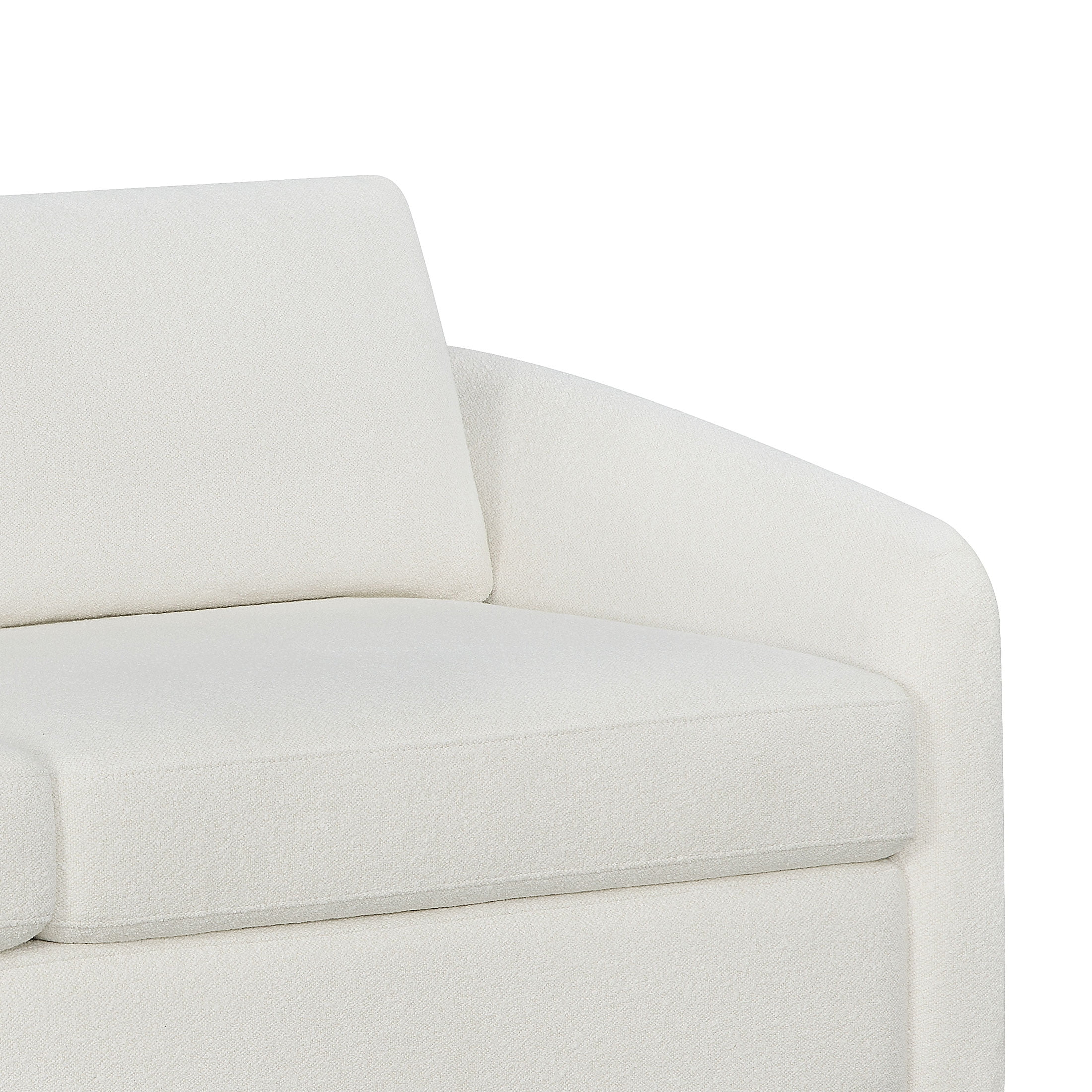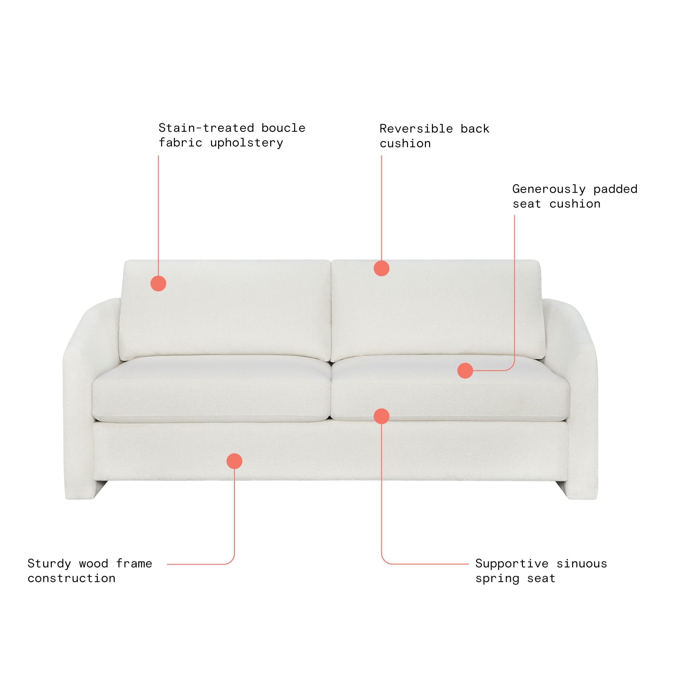 Stain-treated bouclé or linen fabric upholstery Reversible back cushion Sinuous spring seat support Stylish, rounded armrests Available in cream boucle, charcoal boucle or beige striped linen Age Group: Adult Recommended Location: Living room, lounge area or family room Assembly required Product Dimensions: 72.125 in W x 31.5 in D x 31.5 in H Packaging Dimensions: 65 in W x 26.5 in D x 21 in H