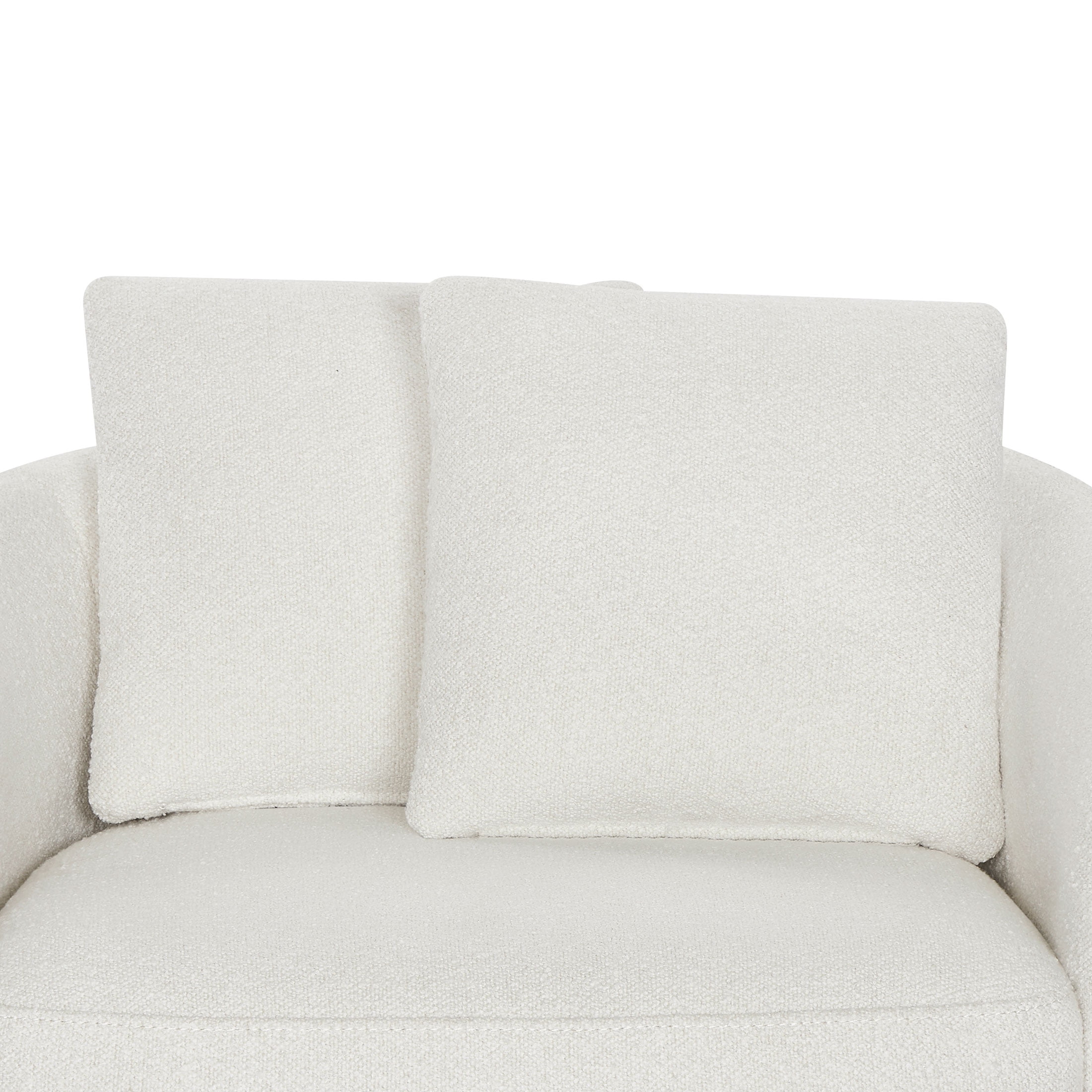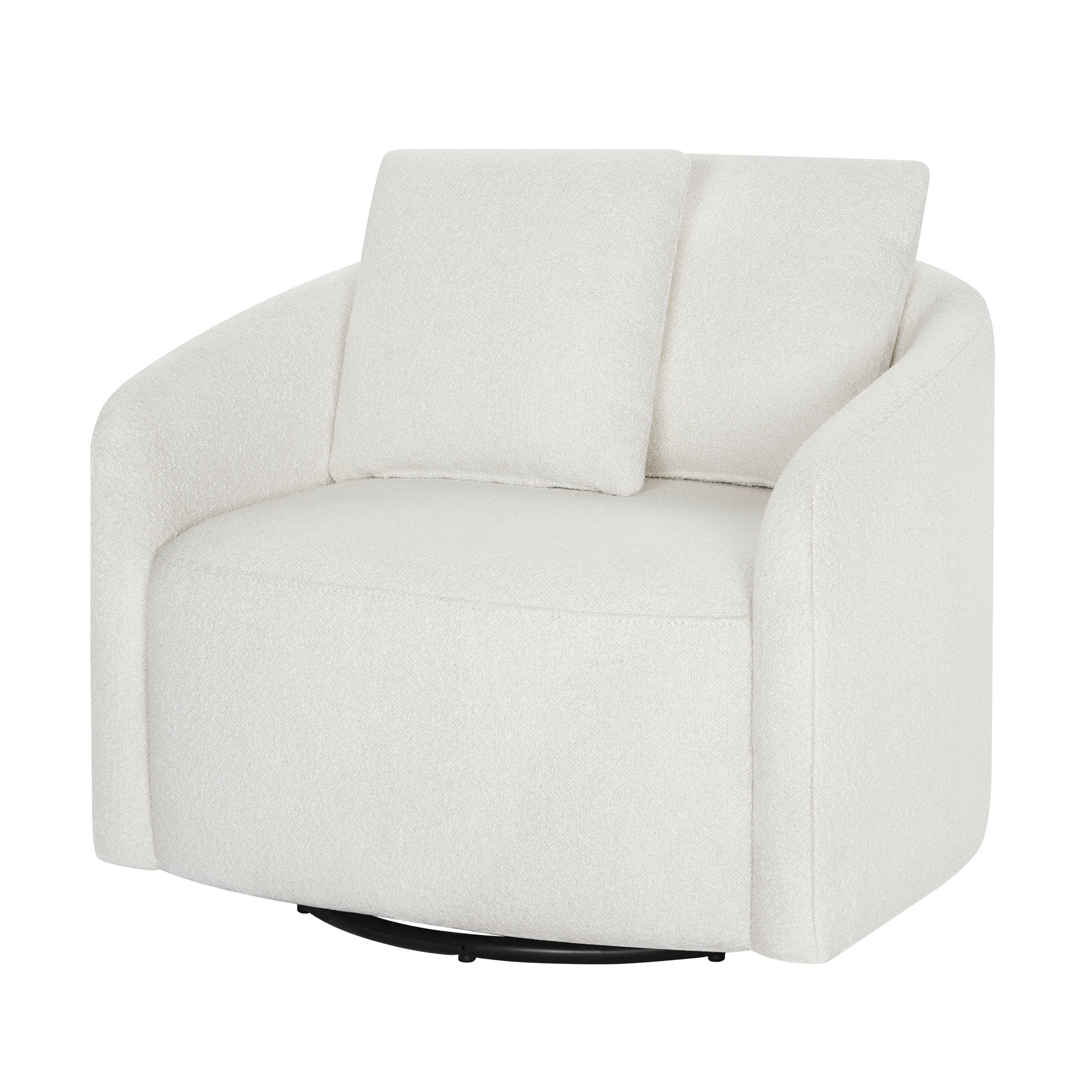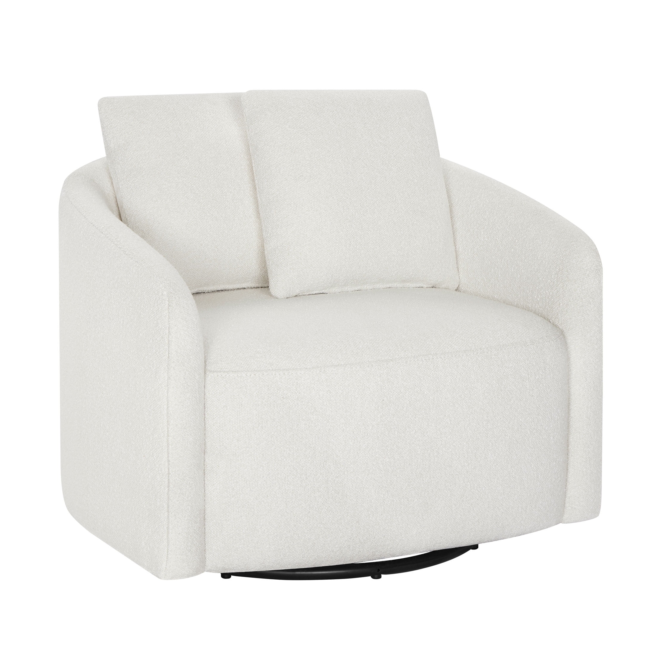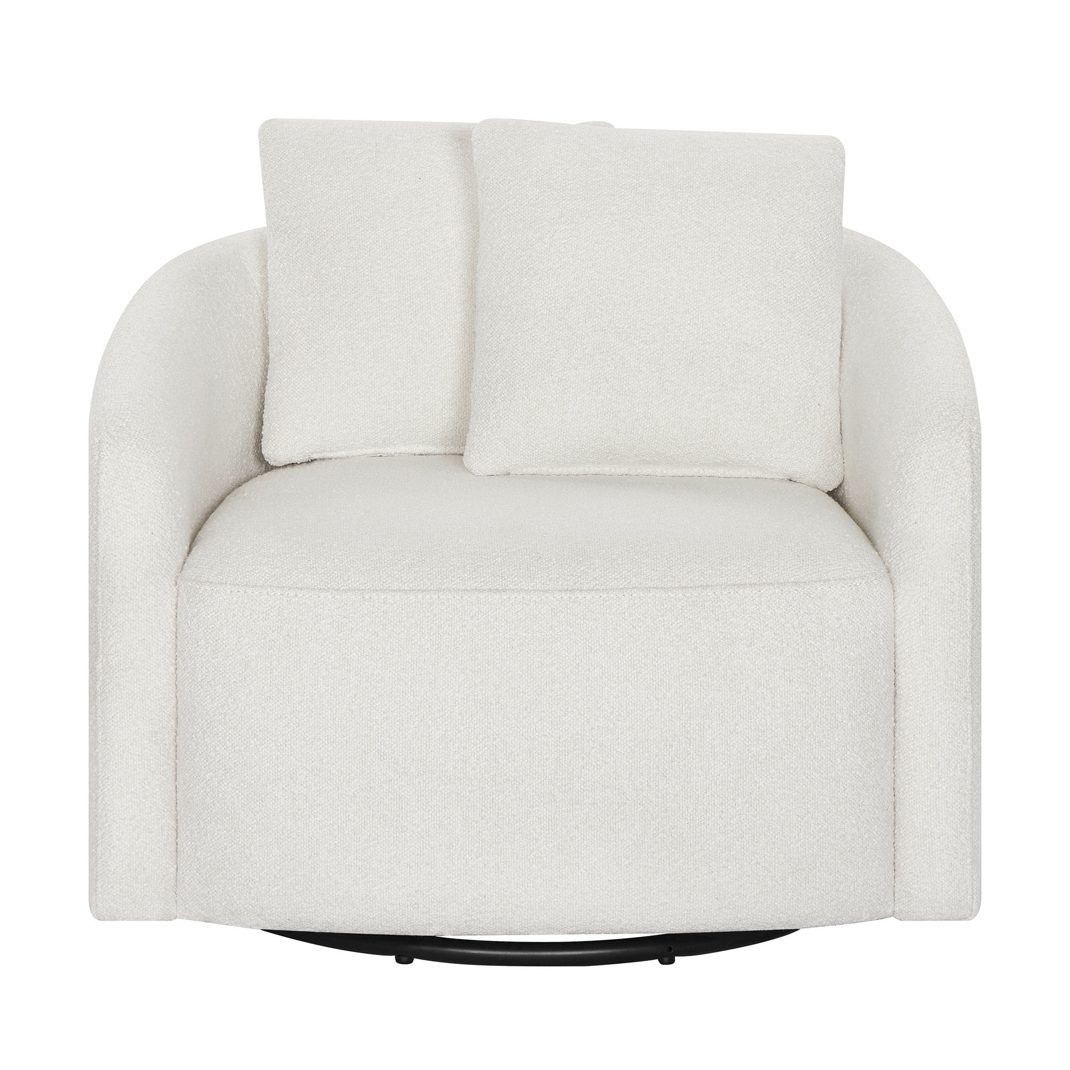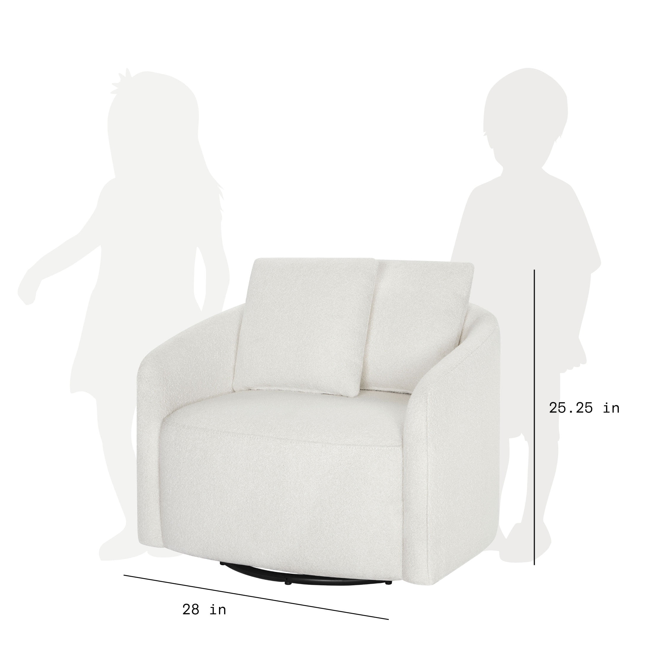 Stain-treated boucle fabric upholstery 2 plush, accent pillows 360 degree metal swivel base Supportive sinuous spring seat Great for use in living room, reading nook, or lounge space Generously padded seat cushion Sturdy wood frame construction Available in cream and charcoal Assembly required Dimensions: 28 in W x 25 in D x 25.25 in H (71.1 cm x 63.5 cm x 64.1 cm) Packaging Dimensions: 29 in W x 25.9 in D x 22.5 in H Packaging Weight: 51.7 lb Model# LS-BT-029, LS-BT-030, LS-BT-031, LS-BT-032
