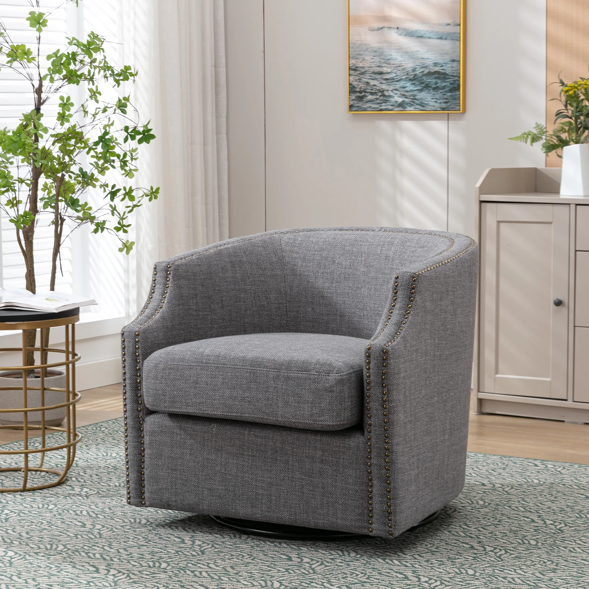 Stain-treated boucle fabric upholstery 2 plush, accent pillows 360 degree metal swivel base Supportive sinuous spring seat Great for use in living room, reading nook, or lounge space Generously padded seat cushion Sturdy wood frame construction Available in cream, rose, cornflower and charcoal Assembly required Dimensions: 28 in W x 25 in D x 25.25 in H (71.1 cm x 63.5 cm x 64.1 cm) Packaging Dimensions: 29 in W x 25.9 in D x 22.5 in H Packaging Weight: 51.7 lb Model# LS-BT-029, LS-BT-030, LS-BT-031, LS-BT-032