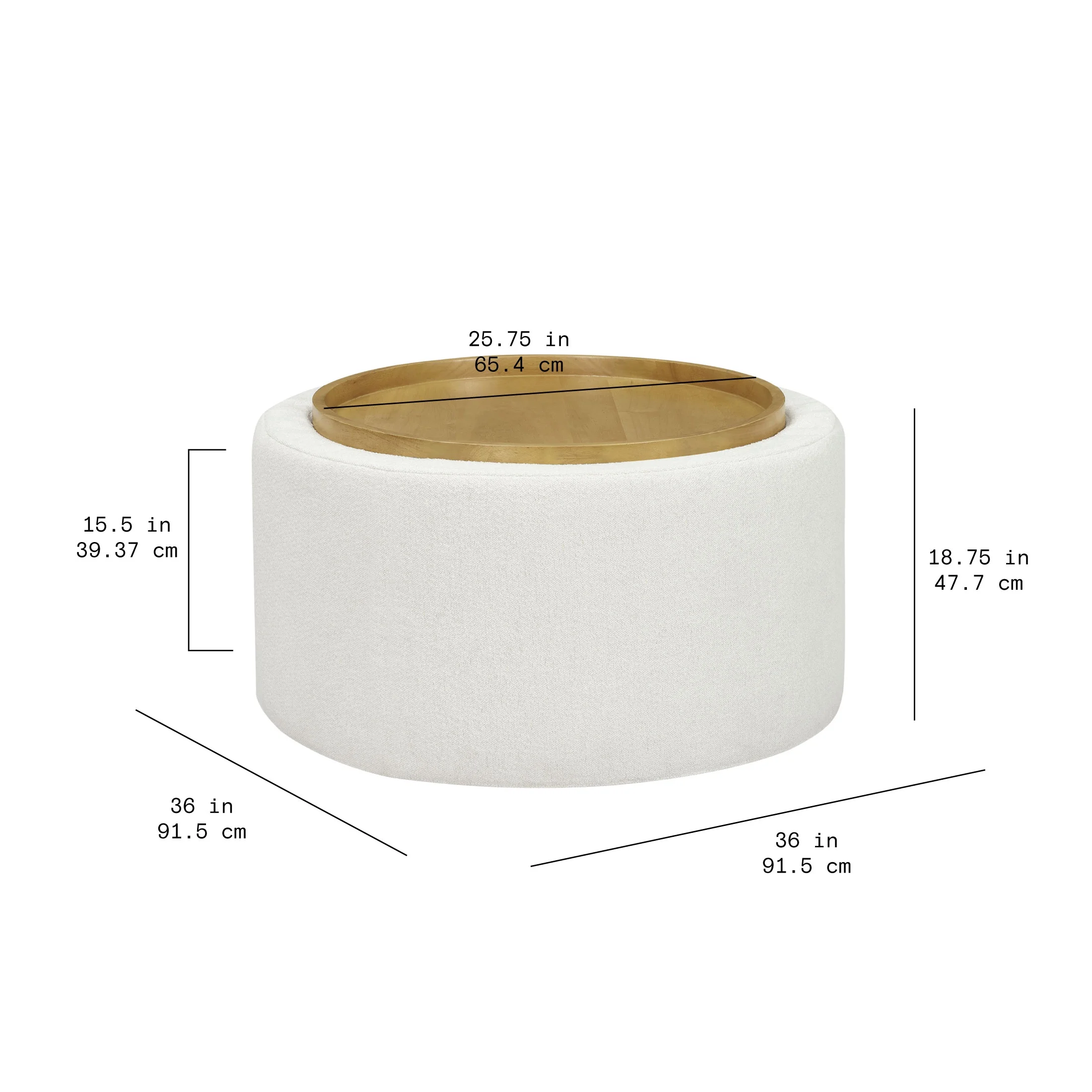 Convenient hidden storage for books, blankets or other accessories Sturdy wood frame construction Removable, wooden table top Pair with the popular Drew Chair by Beautiful (sold separately) Available in Cream or Sage Product Dimensions: 36 in. W x 36 in. D x 18.75 in. H (91.5 cm x 91.5 cm x 47.7 cm) Inner Storage Space Dimensions: 25.75” x 25.75” x 15.5” Packaging Dimensions: 31.5 in x 30 in x 21 in Packaging Weight: 53 lb (24 kg)