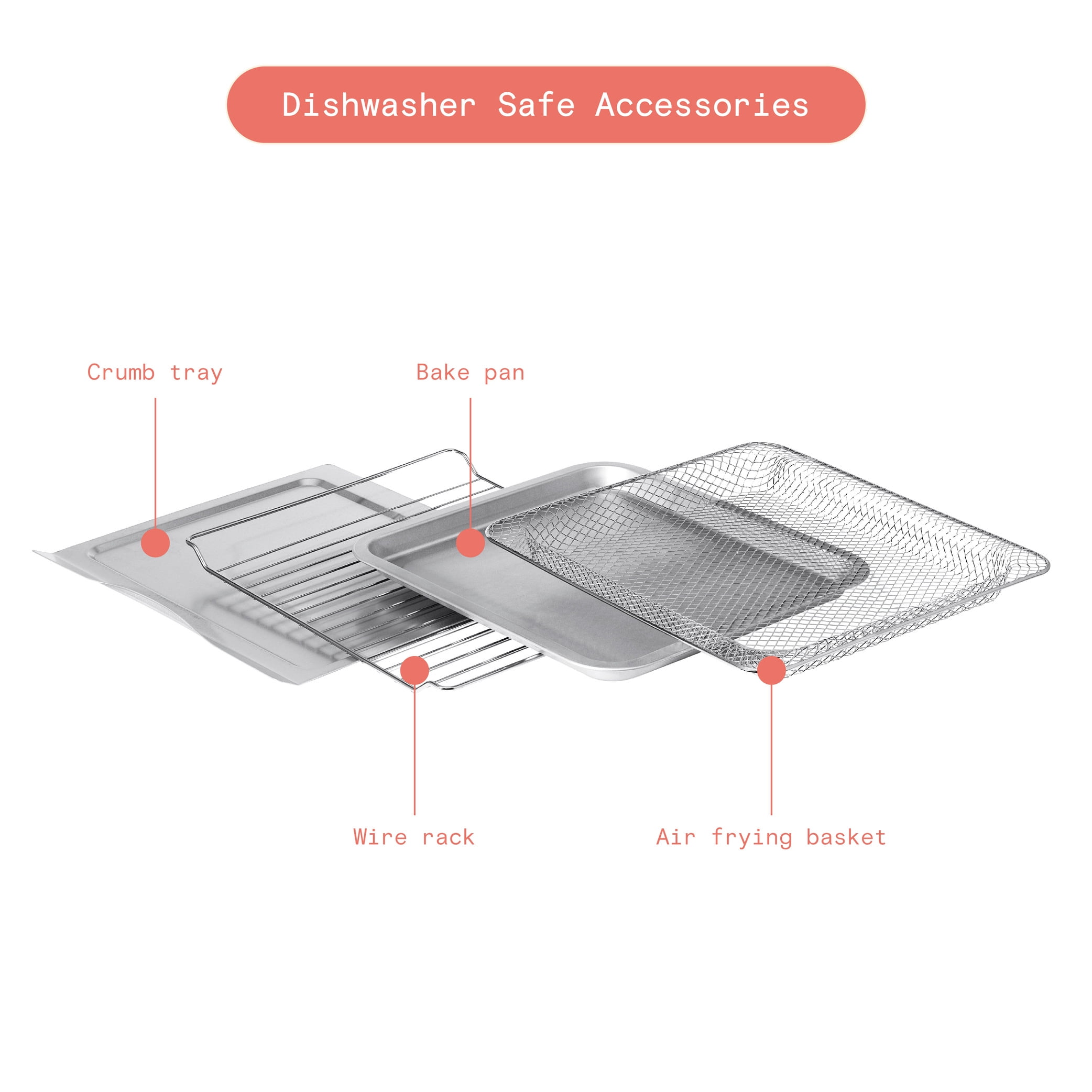 Quartz-Infrared heating with convection and air fry technology for 80% faster preheat compared to a conventional oven. Saves you time on meal preparation. Low profile space saving design fits a 12″” pizza, 9 slices of toast, or a 9×13″” casserole dish 10 preset cooking functions: Toast, Bagel, Air fry, Broil, Bake, Pizza, Reheat, Cookies, Slow cook, Dehydrate Large 15 L capacity serves 5-7 people Air Fry function combines intense heat and super convection for delicious crispy fried favorites without the fat! Powerful 1800-watt cooking system Touch-Activated Display: A screen that illuminates only when you need it Adjustable 3 speed convection fan settings from low to turbo Removable crumb tray for easy cleanup Accessories include: air frying basket, bake pan, and wire rack Condition: new Beautiful by Drew Barrymore available exclusively at