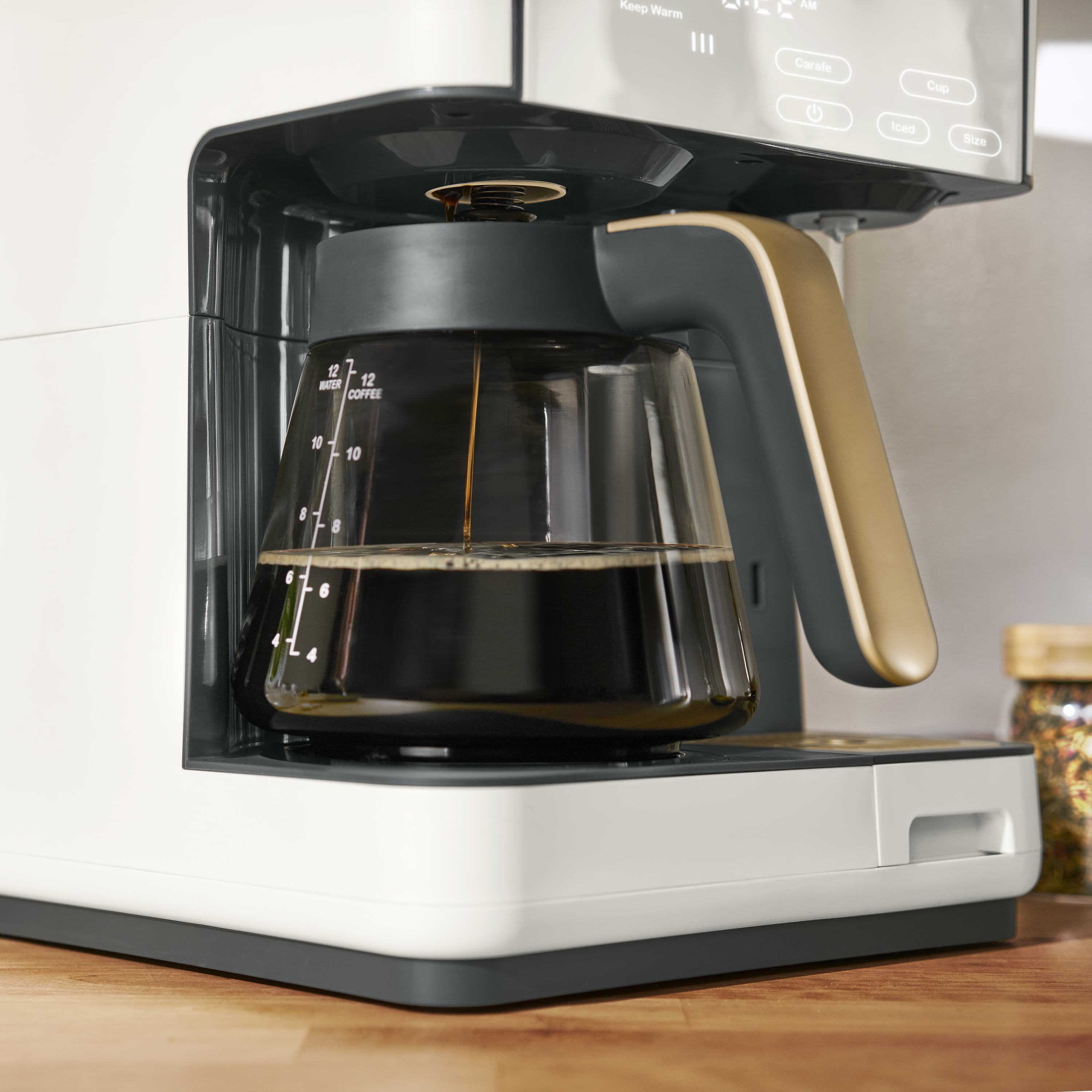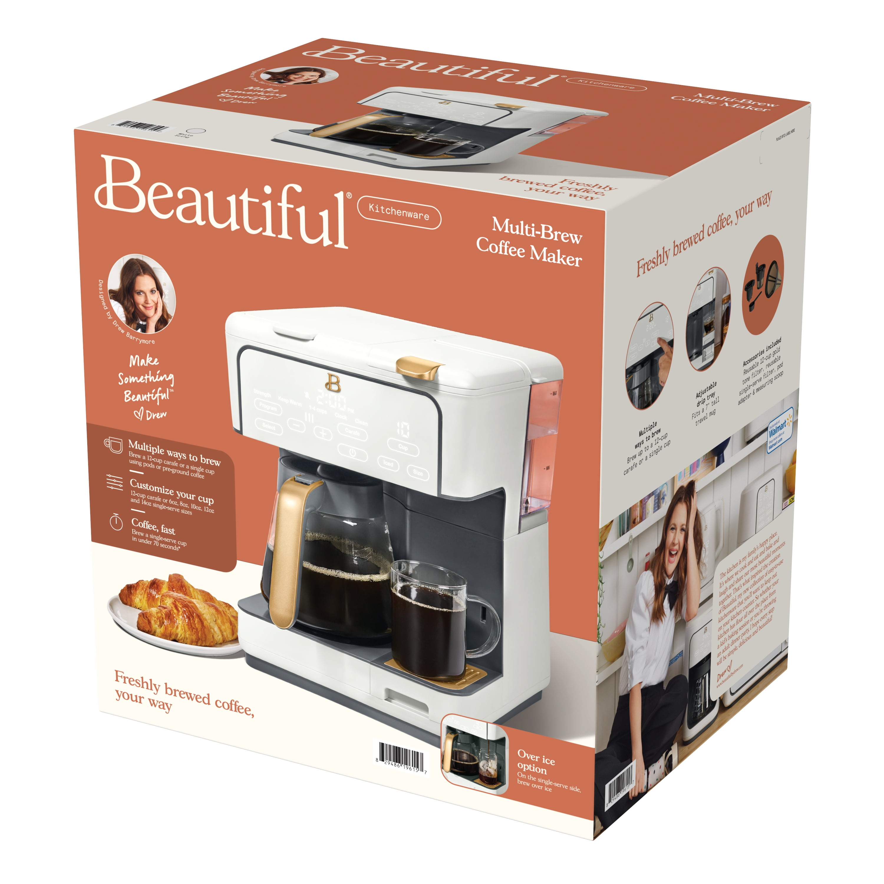 Brew a 12-cup carafe or a single-serve cup (6oz, 8oz, 10oz, 12oz and 14oz) using pods or pre-ground coffee Fast brewing: brew a single-serve cup in under 70 seconds Programmable: set the carafe to brew automatically the next morning Over Ice option for perfect single-serve iced coffee Choose from 3 brew strength settings for a 12-cup carafe Removable water tank holds 40oz of water for less refills on the single-serve side Adjustable drip tray fits a 7″ tall travel mug for a single-serve cup Carafe stays warm for up to 4 hours in Keep Warm mode Touch-activated display illuminates when needed and wipes clean Each accessory is dishwasher safe Includes reusable 12-cup gold tone filter, reusable single-serve filter, pod adapter, and measuring scoop Check out other small appliances from Beautiful by Drew Barrymore