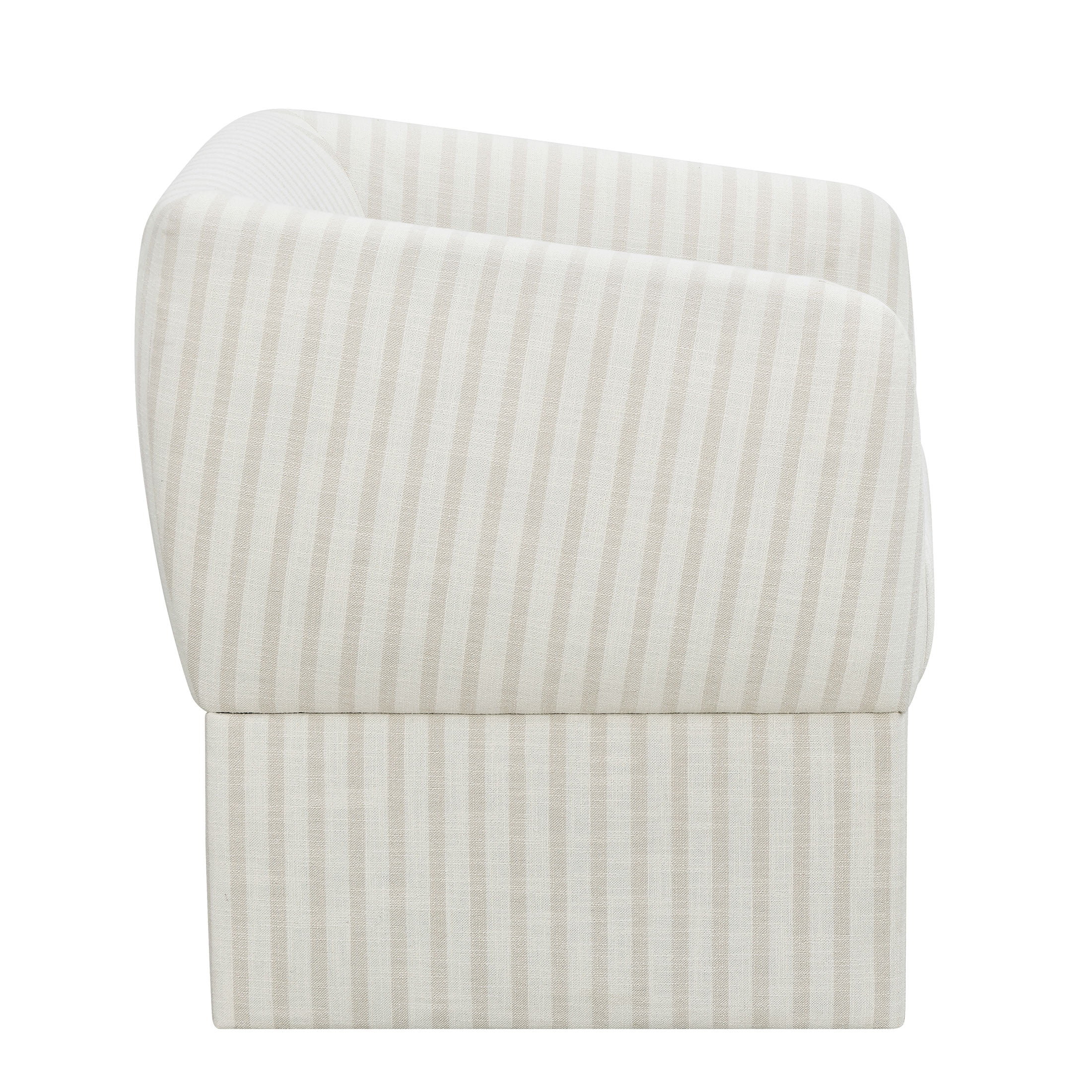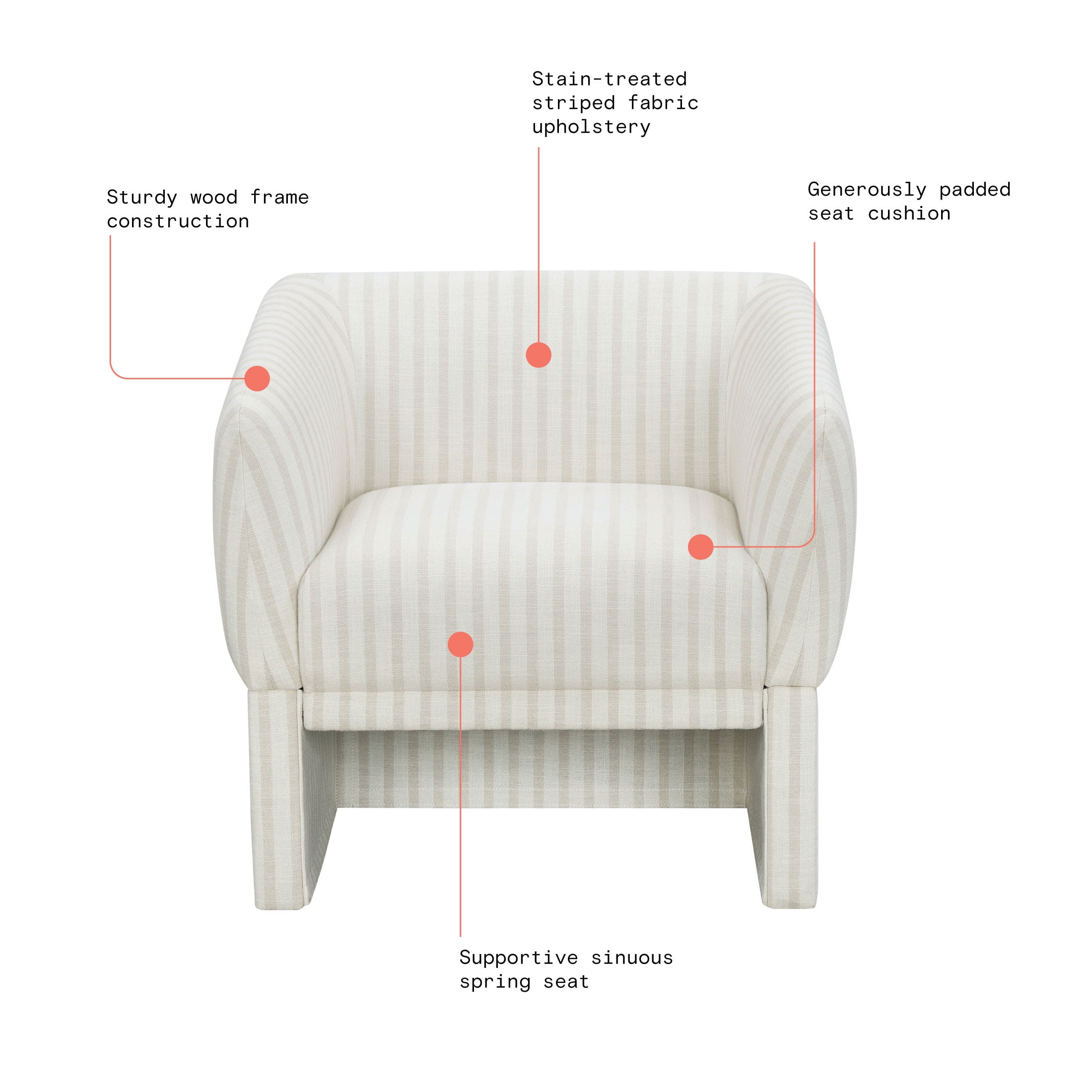 Stain-treated, stripe fabric upholstery Sturdy wood frame Supportive sinuous spring seat Modern, squared arm style Assembly required Product Dimensions: 30 in W x 26 in D x 28 in H (76.2 cm x 66 cm x 71.1 cm) Packaging Dimensions: 30.8 in W x 26.8 in D x 22.5 in H Model# LS-BT-018