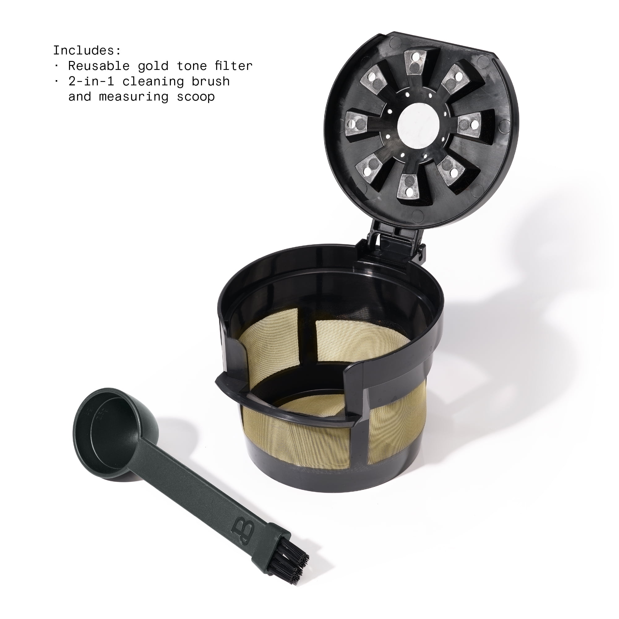 Exact-Xtract ™ technology extracts 2x more flavor vs Keurig Classic Model #5000068875 using Keurig’s Dunkin Donuts Original Blend Medium Roast pods at the 10oz brew cup size setting Integrated burr grinder auto-grinds the precise amount of coffee for any cup size or brew strength selected Grinds enough coffee for up to 16 cups before having to refill No pods, less waste: Grind fresh whole beans or use pre-ground coffee Gold tone reusable filter included–no paper filter required Choose from six brew sizes: 16 oz, 14 oz, 12 oz, 10 oz, 8 oz or 6 oz Select your strength: Regular, Bold, or Over Ice Programmable: Ready to brew fresh the next day Iced coffee setting: For optimal strength and flavor Touch-activated display is easy to use Space-saving slim design with a soft matte finish XL 64 oz removable water reservoir Removable drip tray adjusts to fits up to a 7″tall tumbler Includes: 2-in-1 cleaning brush with measuring scoop, charcoal filter, and holder Model: 19332 Condition: new