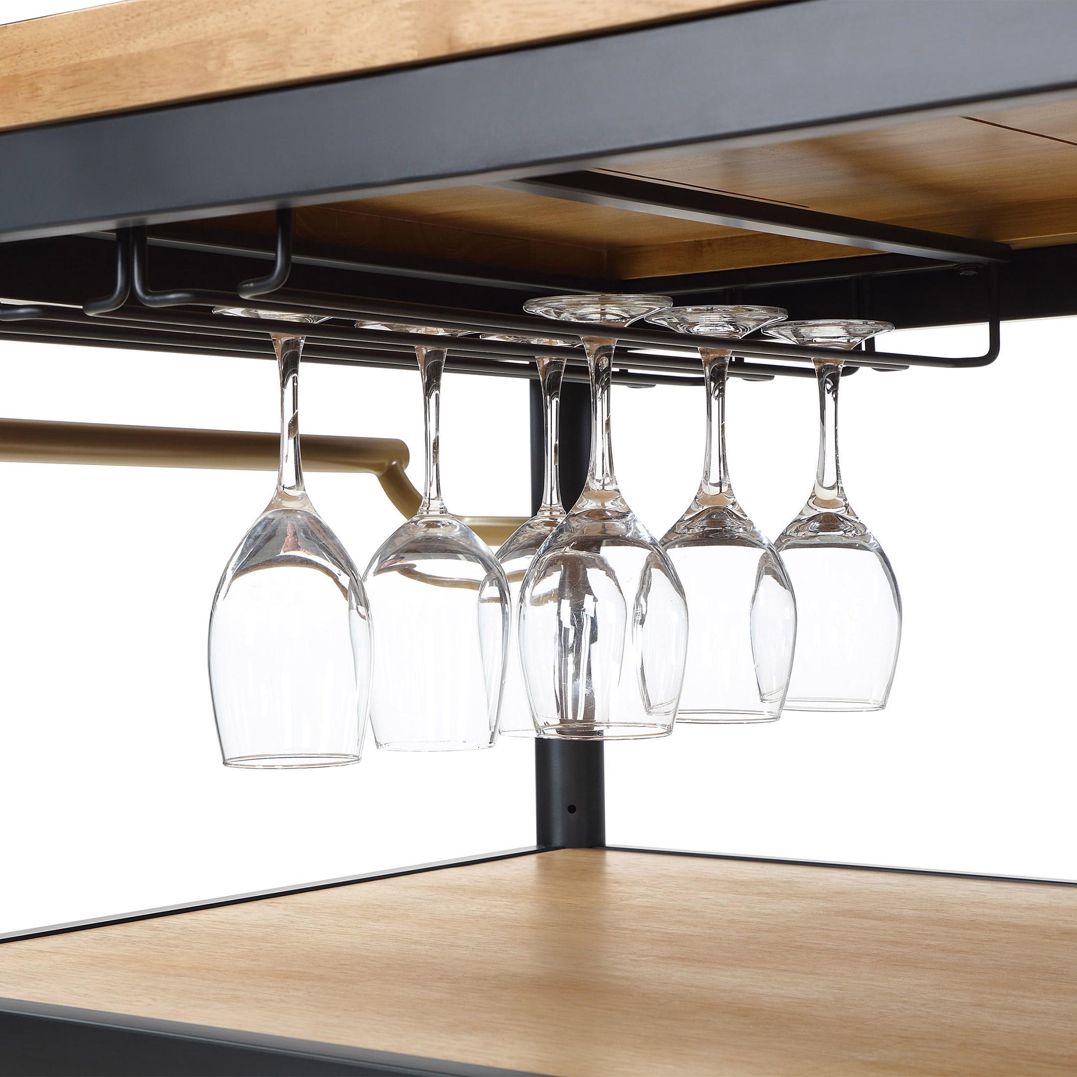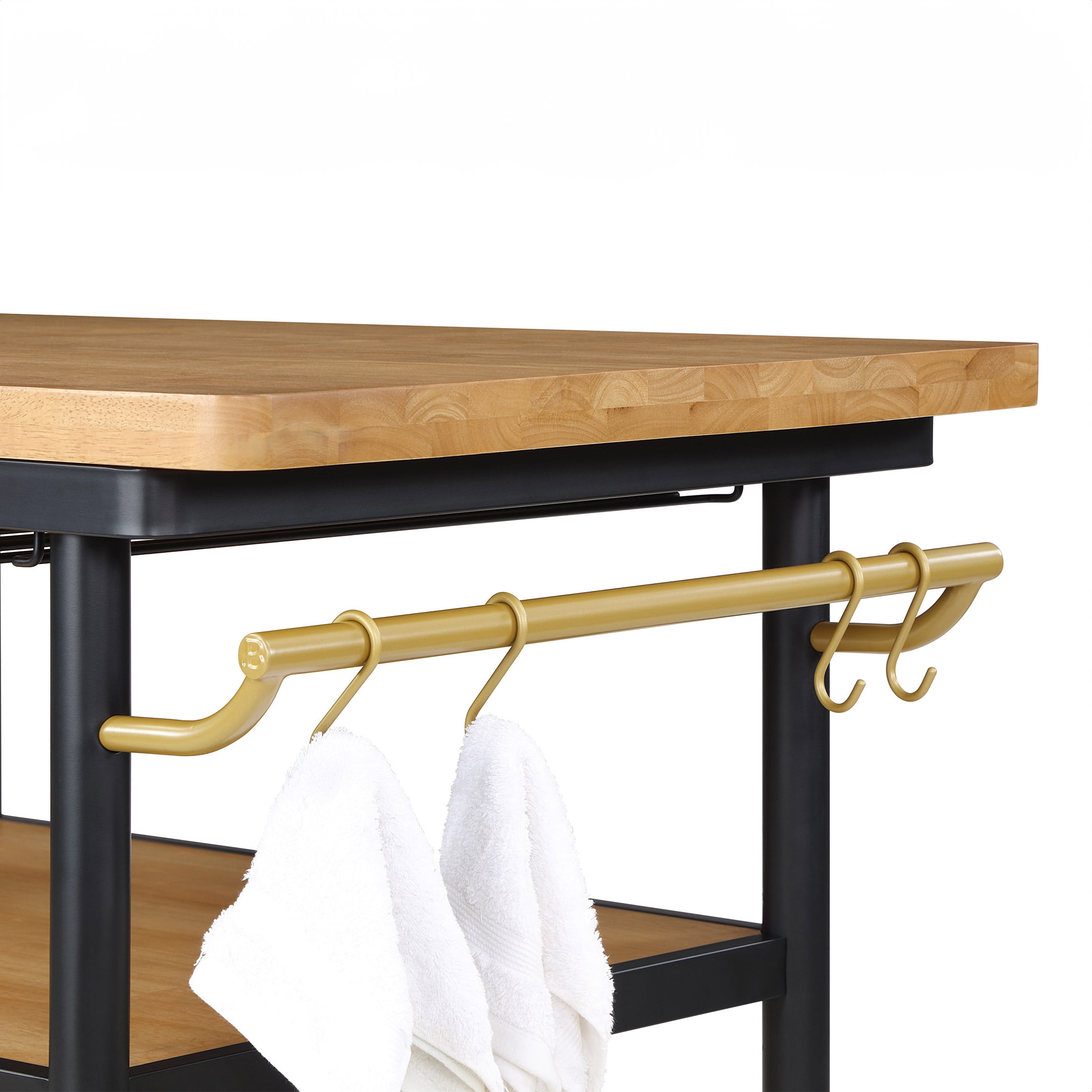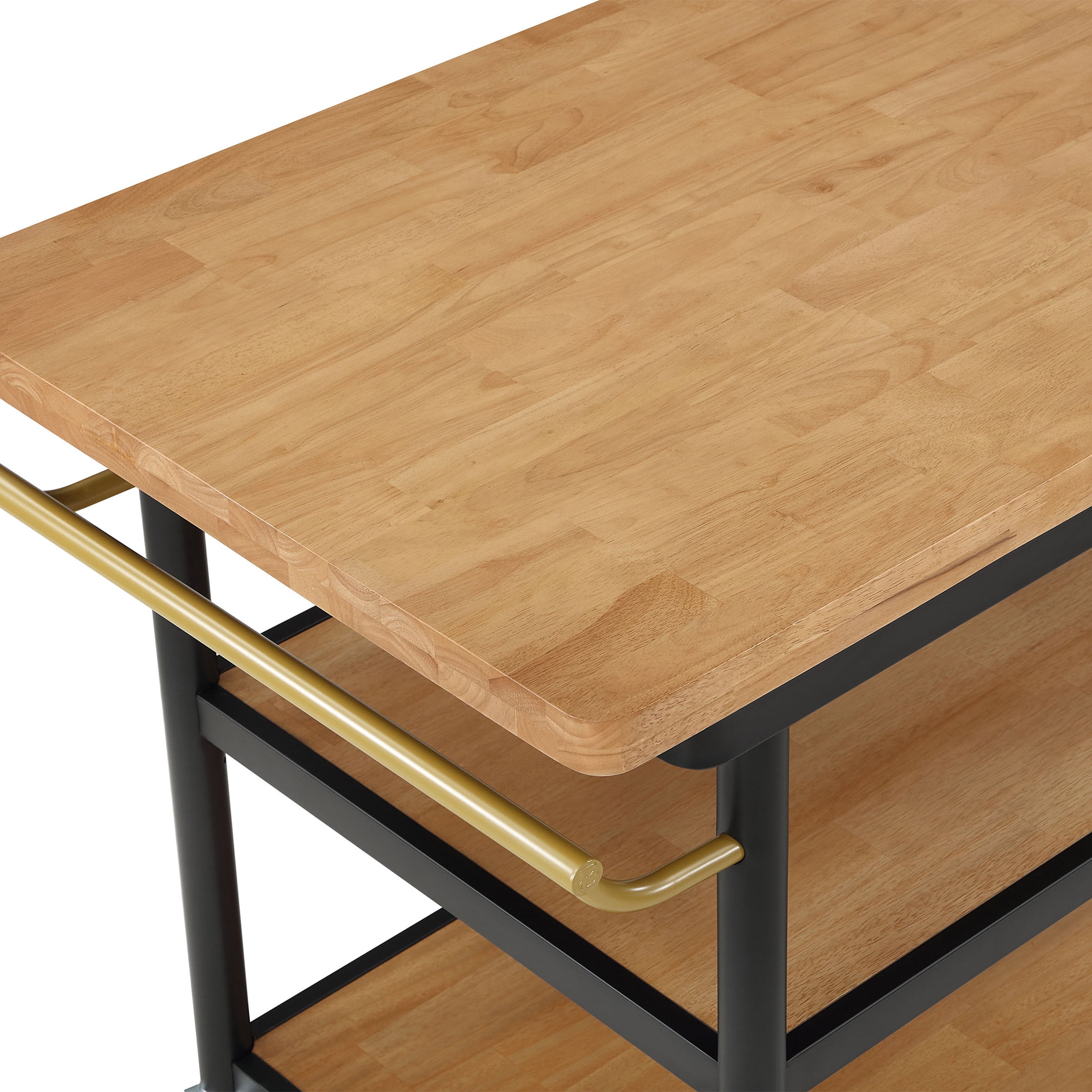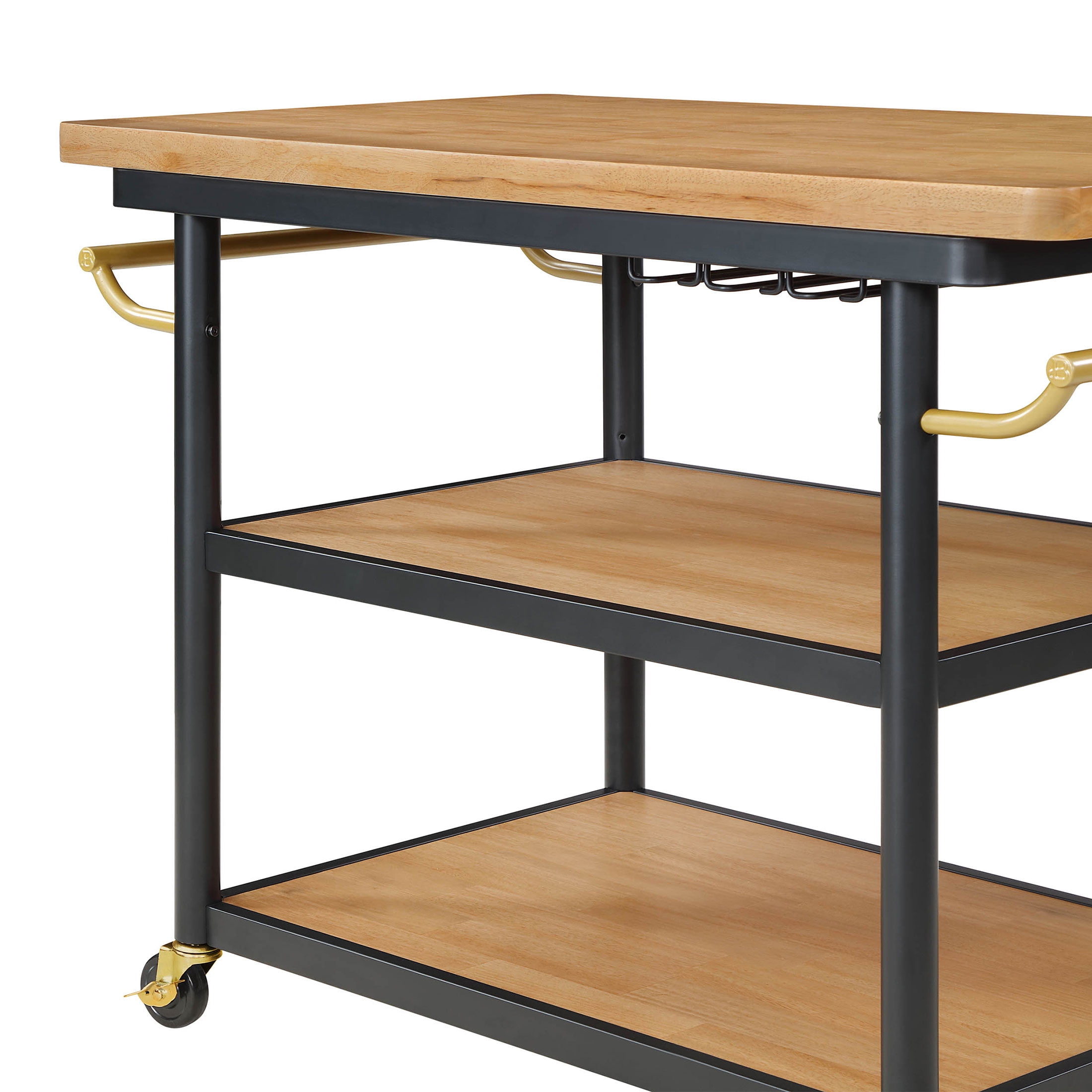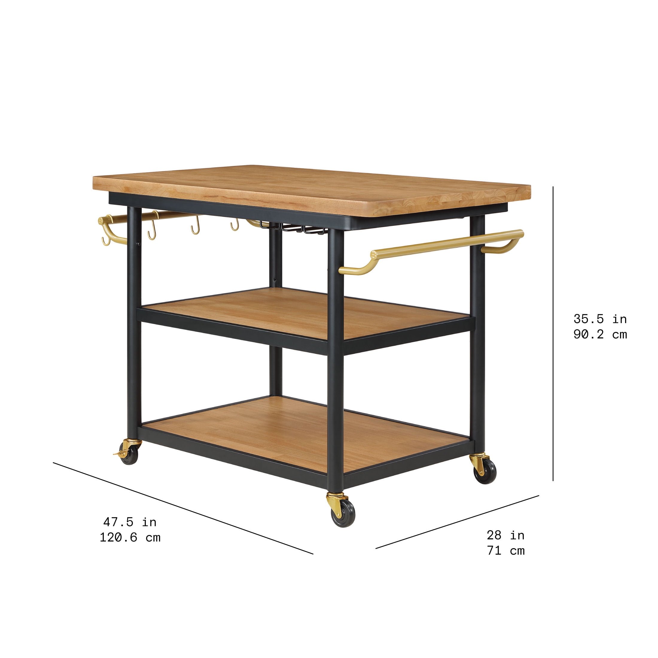 Rubber wood solid top 2 open shelves for storage and display 4 S-hooks for hanging towels, cooking utensils and more Sturdy Black Metal Frame with a Matte Black Finish Gold painted towel bars on both sides of the cart for pushing cart around the room or hanging towels Hanging wine glass holder 4 caster wheels for easy mobility around the room 2 wheels lock to help keep the cart secured in place for you when needed Can be used as kitchen island, wine cart or serving cart Complements other items in the Beautiful by Drew Barrymore Collection Assembly required Dimensions: 47.5 in W x 28 in D x 35.5 in H (120.6 cm x 71 cm x 90.2 cm) Packaging Dimensions: 51.5 in W x 31.25 in D x 9 in H Model# WL-BT-020