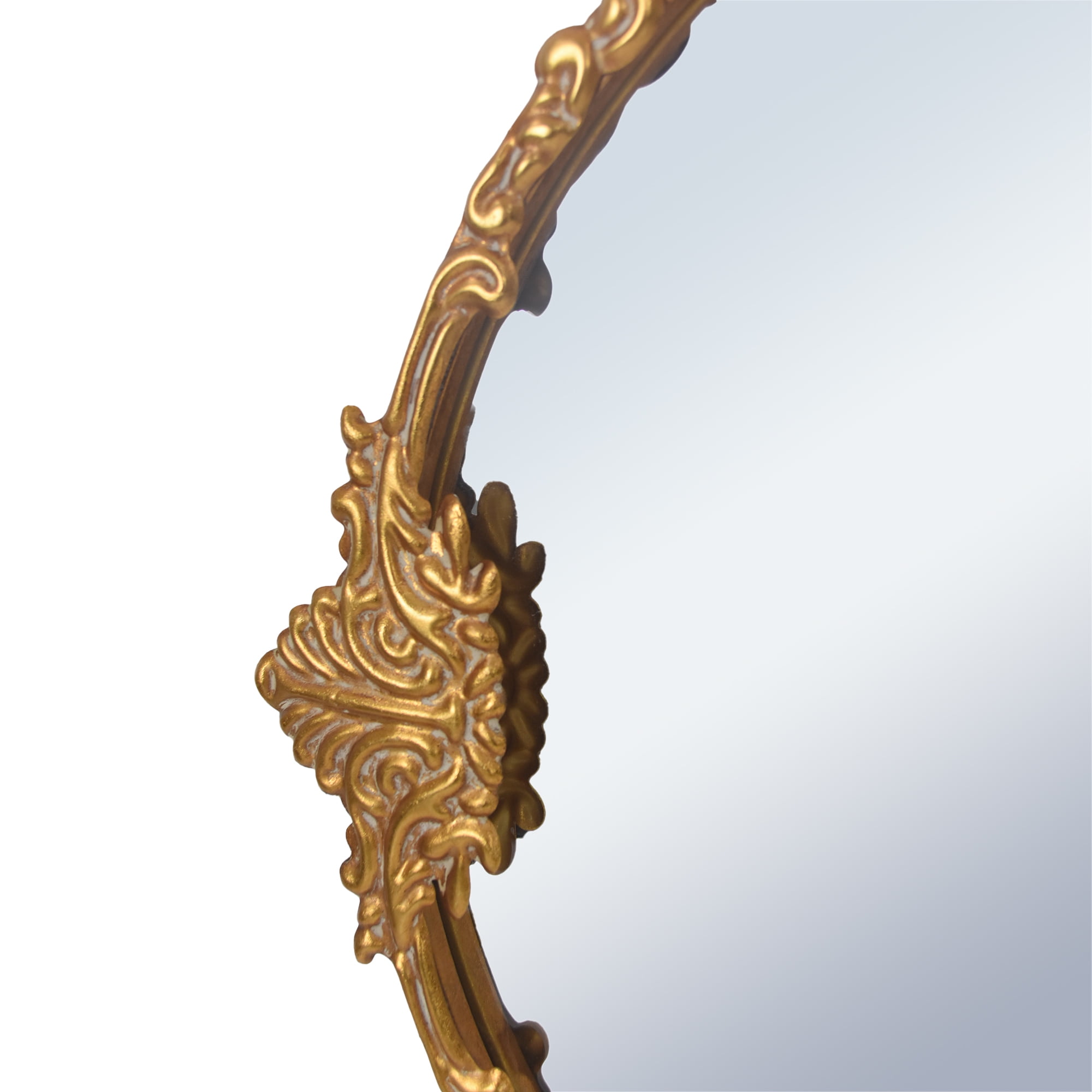 FRAMED ROUND WALL MIRROR- The round frame mirror boasts ornate scrollwork, intricate carvings, and flourishes that evoke a sense of drama and splendor. It transports you to a bygone era of grand palaces and indulgence, adding a touch of timeless elegance to your surroundings. BAROQUE DECOR STYLE- Inspired by the opulence of the Baroque era, this mirror features a meticulously designed frame adorned with intricate details and lavish embellishments. The gold finish, rich and gleaming, enhances the mirror’s overall allure. VERSATILE STYLING – Whether placed in an entryway, a grand living room, or a luxurious bedroom, the gold-framed mirror effortlessly captures attention and becomes a focal point of admiration and beauty. The mirror itself is a flawless reflection surface, providing a clear and crisp image. THOUGHTFUL HOUSEWARMING GIFT- This ornately framed mirror adds a sophisticated touch to any home, making it a thoughtful and memorable housewarming gift. The lustrous gold finish offers an air of regality, catching the light and casting a warm glow throughout the room. EASY TO HANG- Keyhole hangers placed discreetly on the back of the framed wall art allows for an easy, balanced hang.