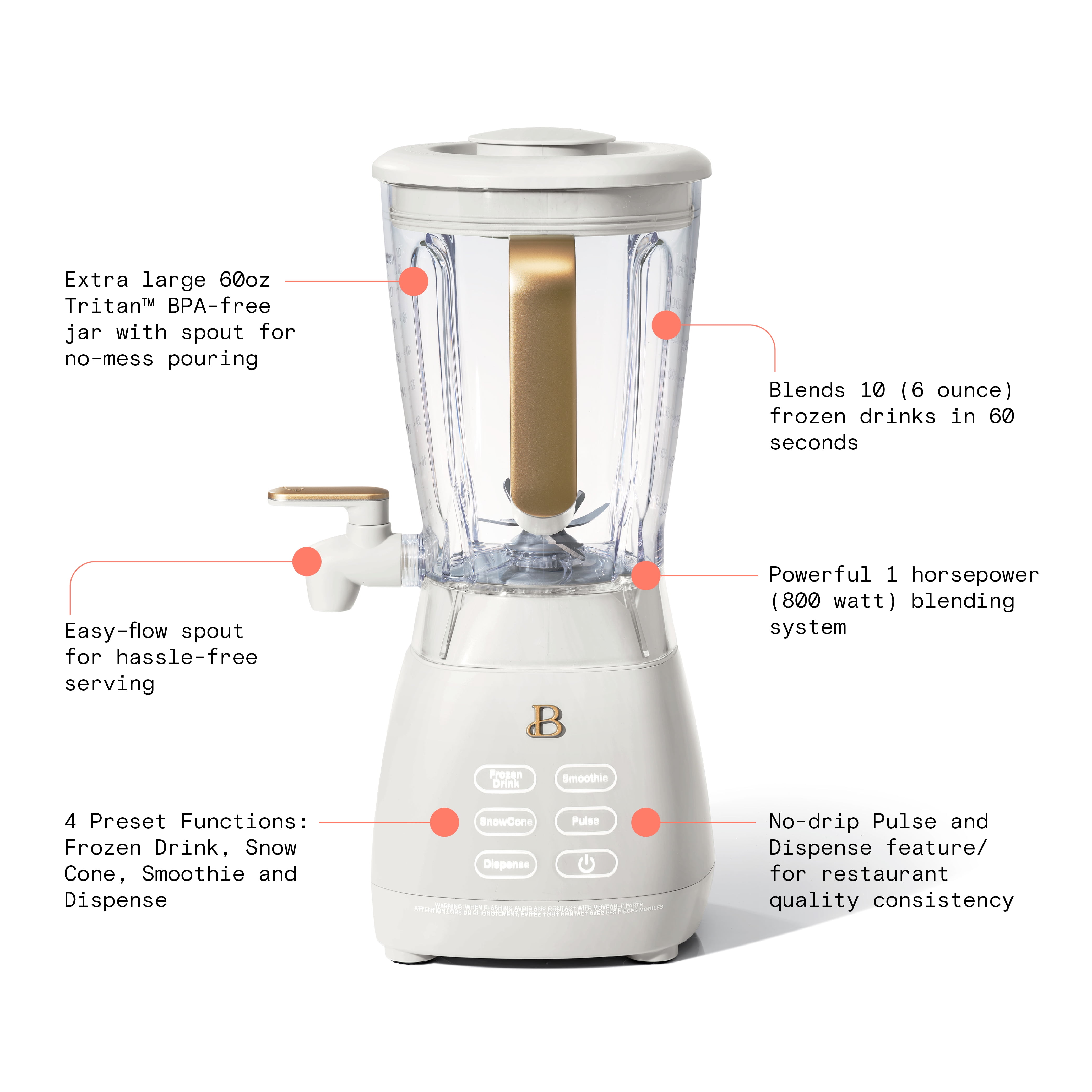 Blends 10 (6 ounce) restaurant-quality frozen drinks in 60 seconds Slush Crush is perfect for smoothies, snow cones, shaved ice and more Powered by patent pending PrecisionSense™ blade technology for optimal drink consistency No-drip Pulse and Dispense feature for hassle-free serving Extra large 60 oz Tritan BPA-free jar with spout for no-mess pouring Powerful, 6-point stainless steel blade system for high-performance ice crushing 4 preset functions; Frozen Drink, Snow Cone, Smoothie and Dispense Integrated 2 oz measuring cap for precise measuring Dishwasher-safe parts Model: 19260 Beautiful by Drew Barrymore available exclusively at 800 Watts