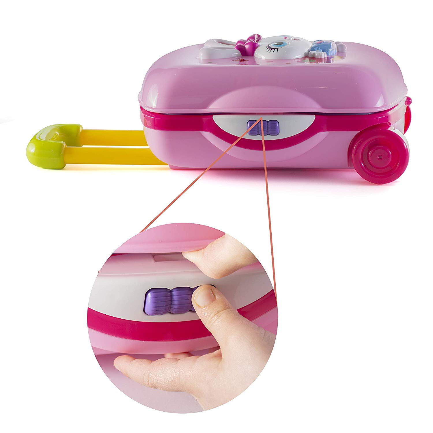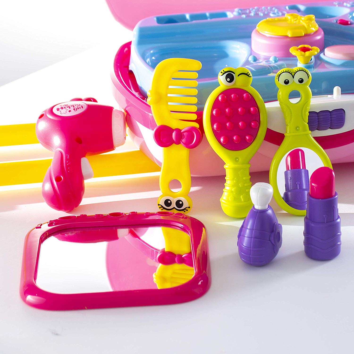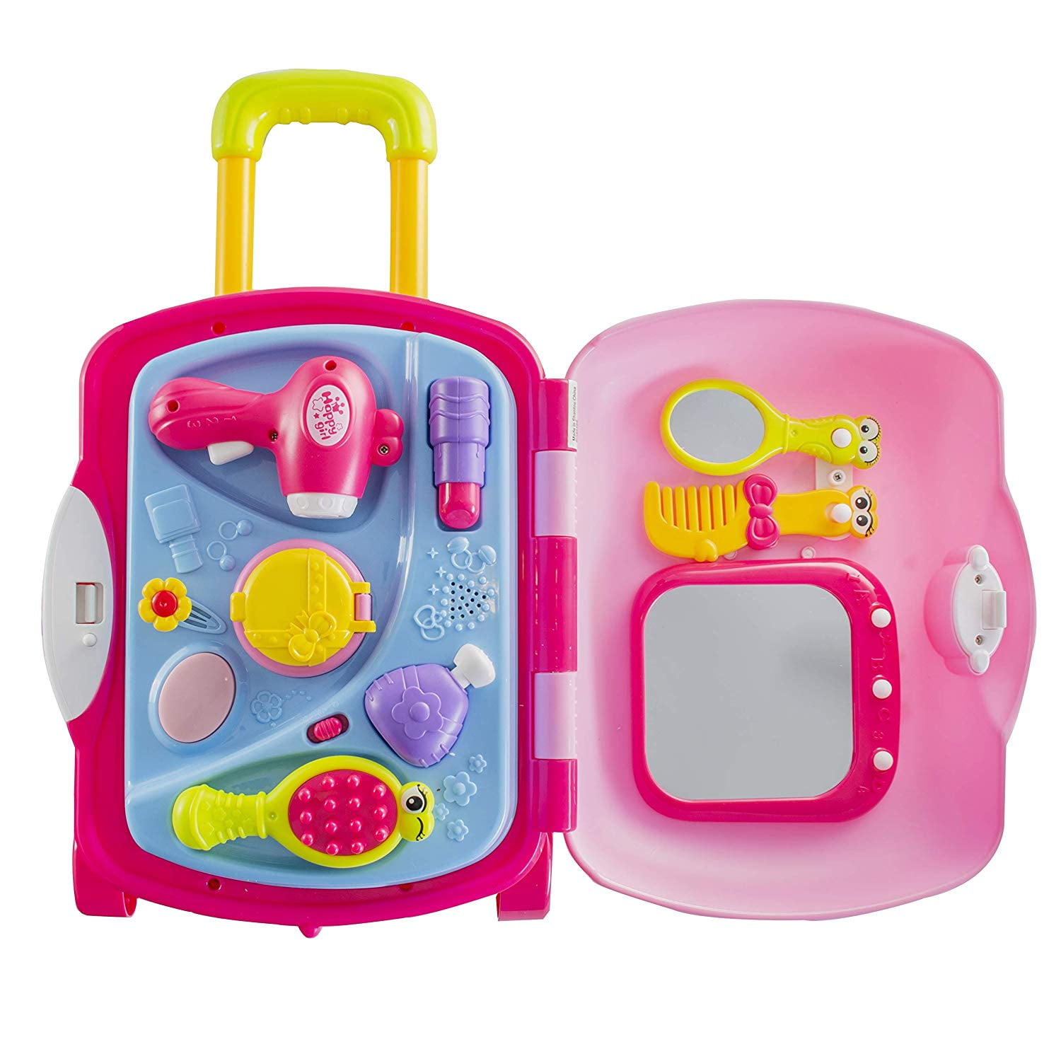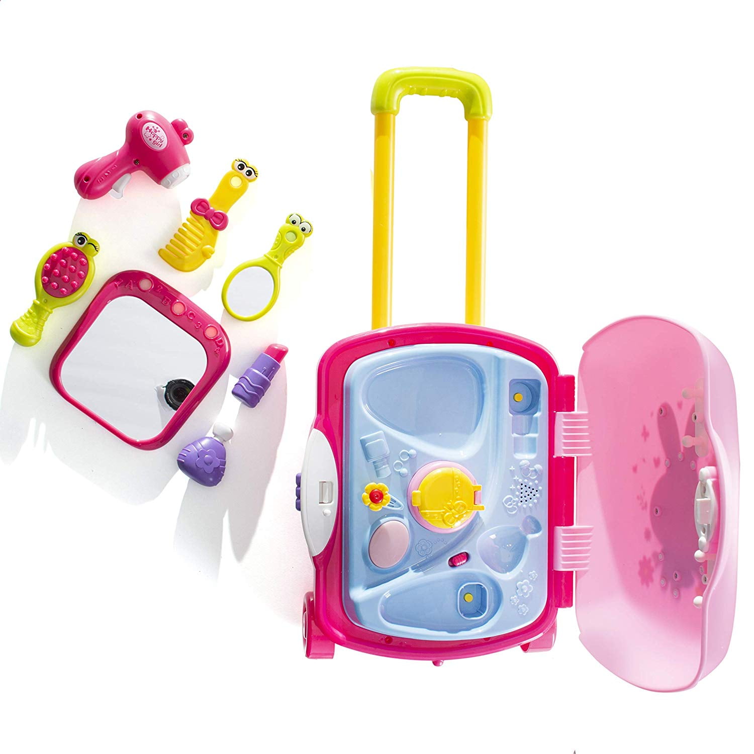 Prextex pretend vanity set is the perfect beauty fashion set for your little beauty Beauty fashion set includes: hair dryer , little comb , brush , cute little pretend makeup and perfume bottle and lots of other accessories Beauty fashion set includes: Beautiful detailed vanity set on wheels with realistic mirror and high quality accessories On/ Off switch for princess music and sound with adjustable handles for carry along suitcase for all ages This set will be the perfect gift for your little girl for Christmas, birthday, or any occasion!