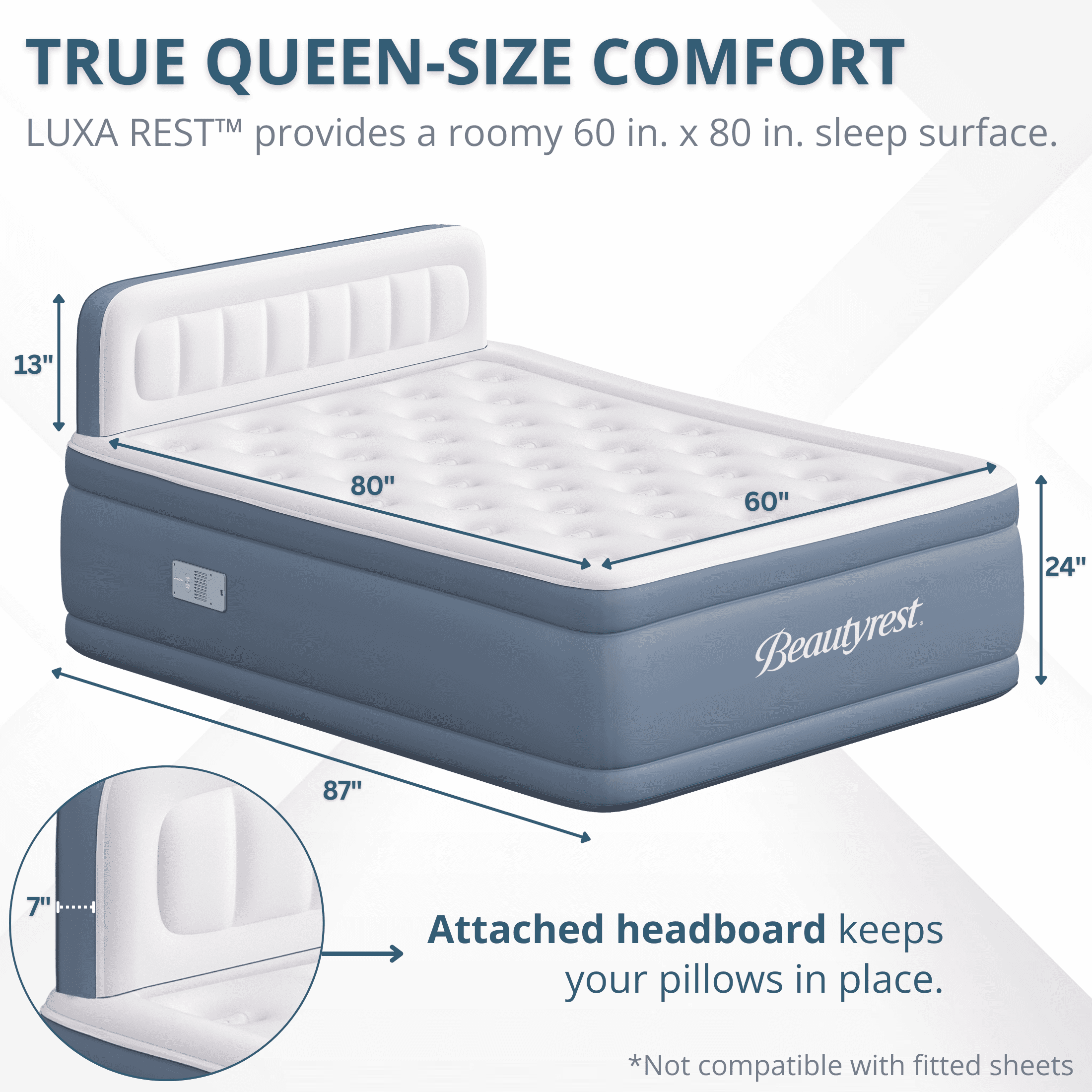 Queen Air Mattress with Headboard: This luxurious 24″ raised air bed features a 13″ high attached headboard to keep pillows in place and provide cushioned back support. Queen size sleep surface measures 80” by 60” for ultimate comfort. One-Touch Built-In Pump with Auto Shut-Off: Easily inflate, deflate, and adjust firmness with the touch of a button. This powerful pump auto-stops at full inflation, preventing vinyl stretching and fatigue and prolongs the life of the mattress. The pump is Pre-Set to the ideal firmness setting ensuring ideal firmness preventing overfilling, while auto shut-off on deflate prevents pump burnout. Located on the side of the bed for easy access and one-touch adjustability for your desired comfort level. Heavy-Duty 750 lbs. Weight Capacity: Puncture-resistant Dura-Vinyl construction supports up to 750 lbs. No-tilt stabilizing base design gives you all night comfort and support. Advanced Coil-In-Coil Comfort: Durable design with superior support for a no-sag, contouring sleep surface, reducing motion transfer and adding pressure relief for ultimate sleep comfort. Cooling Pillow Top & Raised Edge Support: Stay cool all night with the breathable flocked sleep surface. No Tilt Stabilizing Base: Keeps mattress from tipping and swaying for all night comfort and support. Non Skid Textured Top: Designed to prevent your flat sheet or blanket from sliding. Not compatible with fitted sheets due to the attached headboard. Trusted Beautyrest Quality: Beautyrest is committed to delivering premium sleep with our 100% leak tested air mattress design, engineered for years of use.