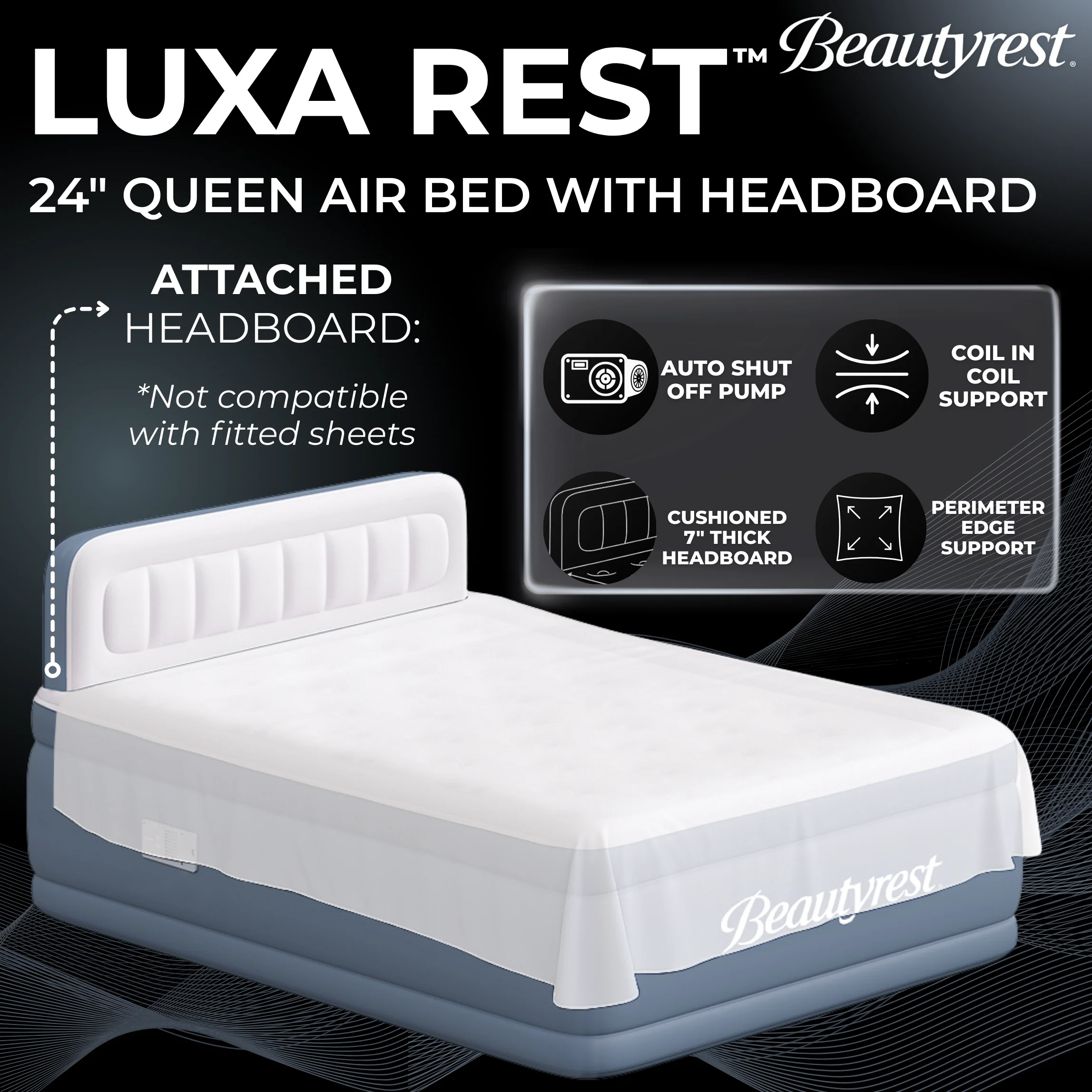 Experience luxury and support with the Beautyrest Luxa Rest 24″ Queen Air Mattress, designed for ultimate comfort and stability. This raised air bed features a 13″ built-in headboard that prevents pillow slipping and enhances support. Equipped with a powerful, one-touch built-in pump with auto shut-off, it inflates and deflates quickly, achieving perfect firmness every time without risk of over-inflation. Auto shut-off on both inflate and deflate preserve your air pump from burnout and makes it easier to pack your Beautyrest air mattress away in the included storage bag. The advanced coil-in-coil construction offers superior stability and contoured comfort, reducing motion transfer. The cooling pillow top cover ensures breathable comfort, so you stay cool throughout the night. Non Skid Textured Top Designed to prevent your flat sheet or blanket from sliding Use with a flat sheet or blanket; not compatible with fitted sheets. Made with extra thick, puncture-resistant Dura-Vinyl, this air mattress supports up to 750 lbs and is leak-free, giving you peace of mind. With a sturdy carry bag included, it’s easy to transport for travel or storage. Backed by an industry-leading 3 Year pump warranty and a 1 Year mattress warranty for your peace of mind. Perfect for guests, camping, or everyday long-term use, the Beautyrest Luxa Rest is built to provide a great night’s sleep, every night.