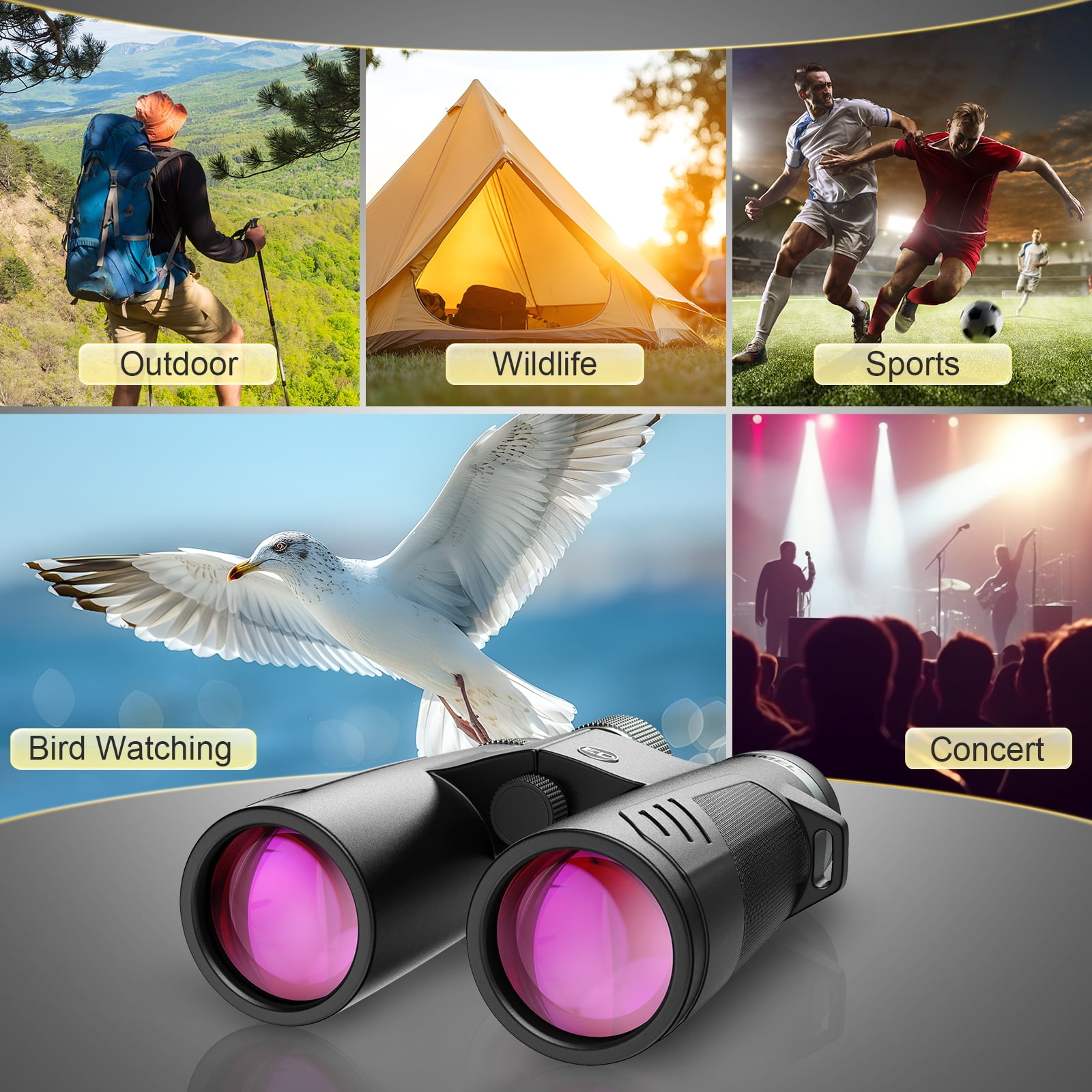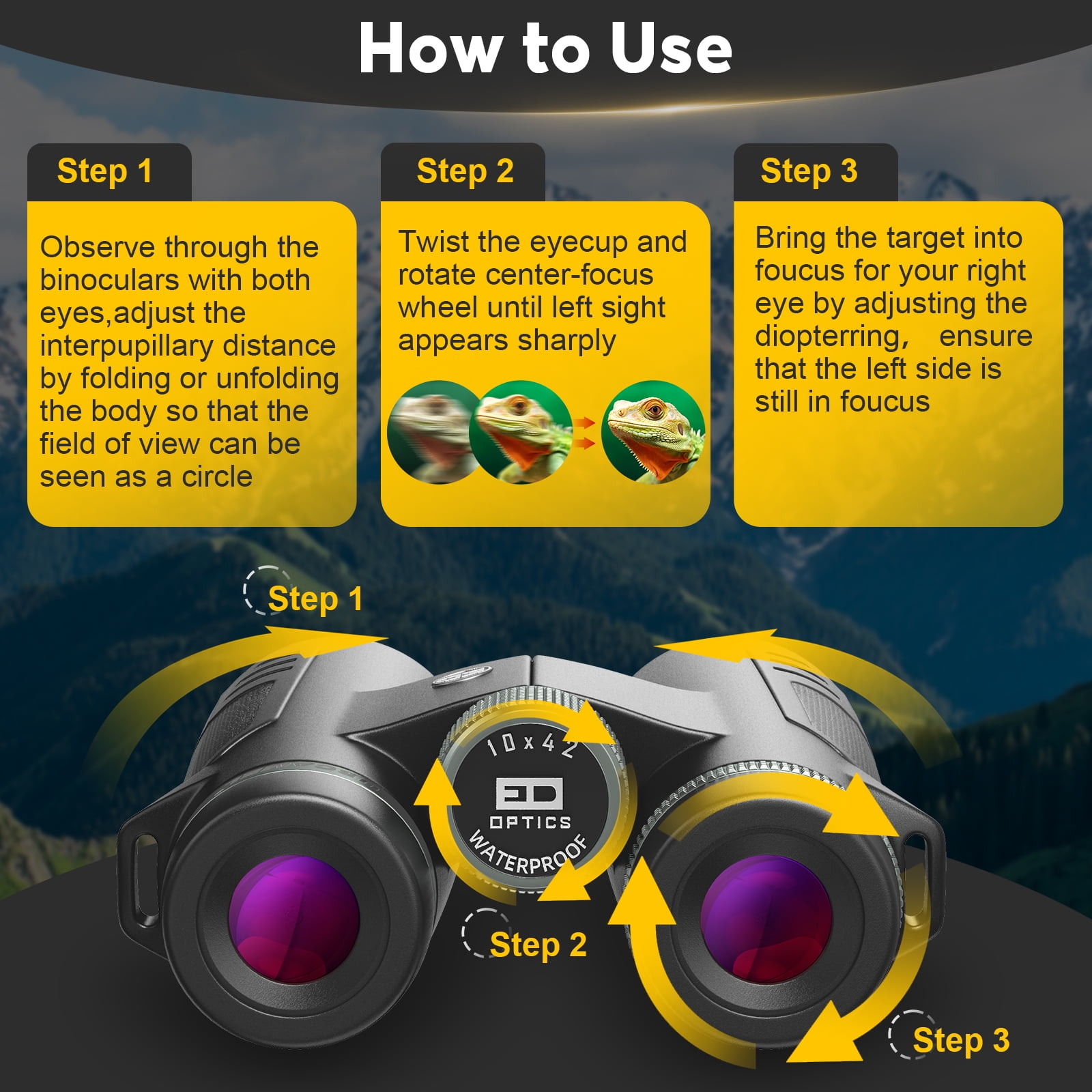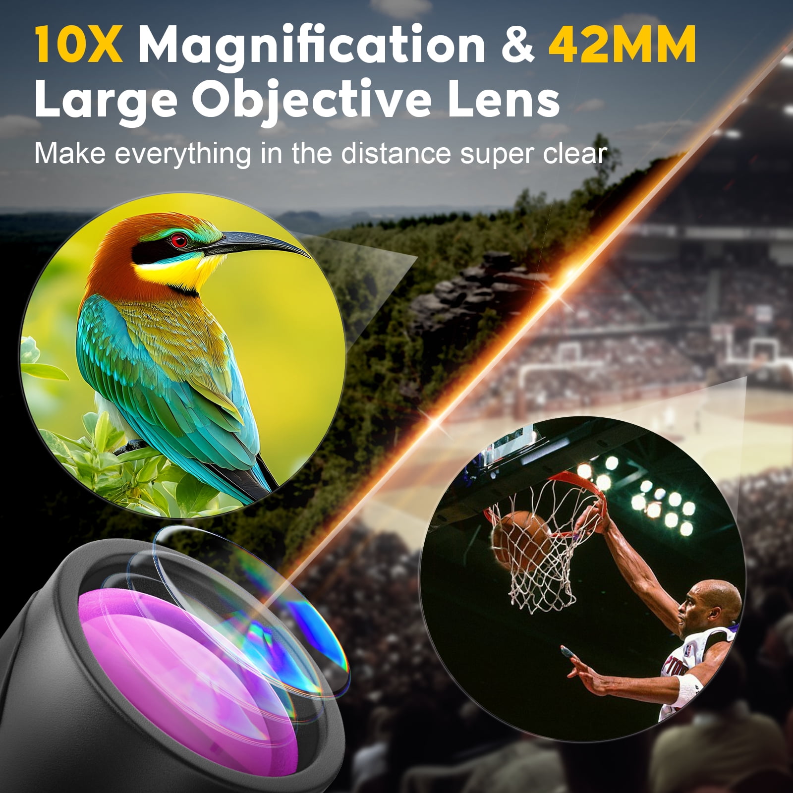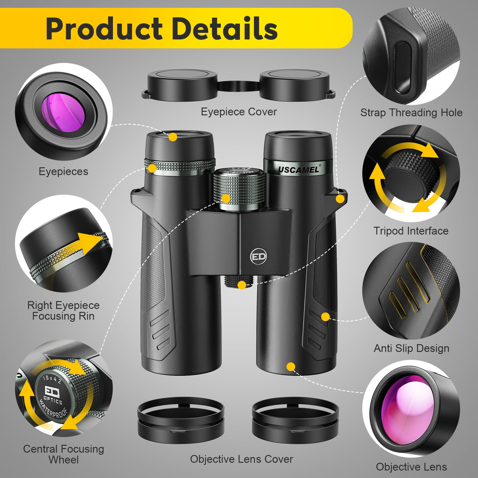 【Ultra-High Definition View】The ED binoculars have exceptional edge-to-edge clarity, sharp detail enhancement, ultra-clear brightness, and true color representation, even in low light conditions.The 10x magnification and 42mm objective lens is the perfect combination of light gathering ability and portability. 【Top-Tier Viewing Experience】Binoculars with ED (Extra-low Dispersion)Glass Lenses eliminates chromatic aberration or color fringing, and Fully multi-coated BaK-4 lenses increase light transmission with multiple anti-reflective coatings on all air-to-glass surfaces. Roof prism design is valued for greater durability and a more compact size. 【Antioxidant & Durable】Adult binoculars with magnesium alloy metal material and Sophisticated rubber armored exterior design provides shock resistance and a firm comfortable grip Extended period of use, Adjustable eyecups twist up and down for comfortable viewing with or without eyeglasses. Center focus wheel adjusts the focus of both binocular barrels at the same time. Diopter (located on right eyepiece) adjusts for differences in a user’s eyes. 【Nitrogen-filled Waterproof , Fog proof】These binoculars feature nitrogen purging and o-ring seals, providing water and fogproof performance in all environments. Their rugged construction withstands recoil and impact, ensuring they stand up to the toughest weather conditions. 【Versatile Use & Gift Box】The adult binoculars suitable for birdwatching, hunting, stargazing, nature observation, or travelling and outdoor activities. A beautifully crafted gift box also makes an exquisite choice for presenting these binoculars as a thoughtful gift.