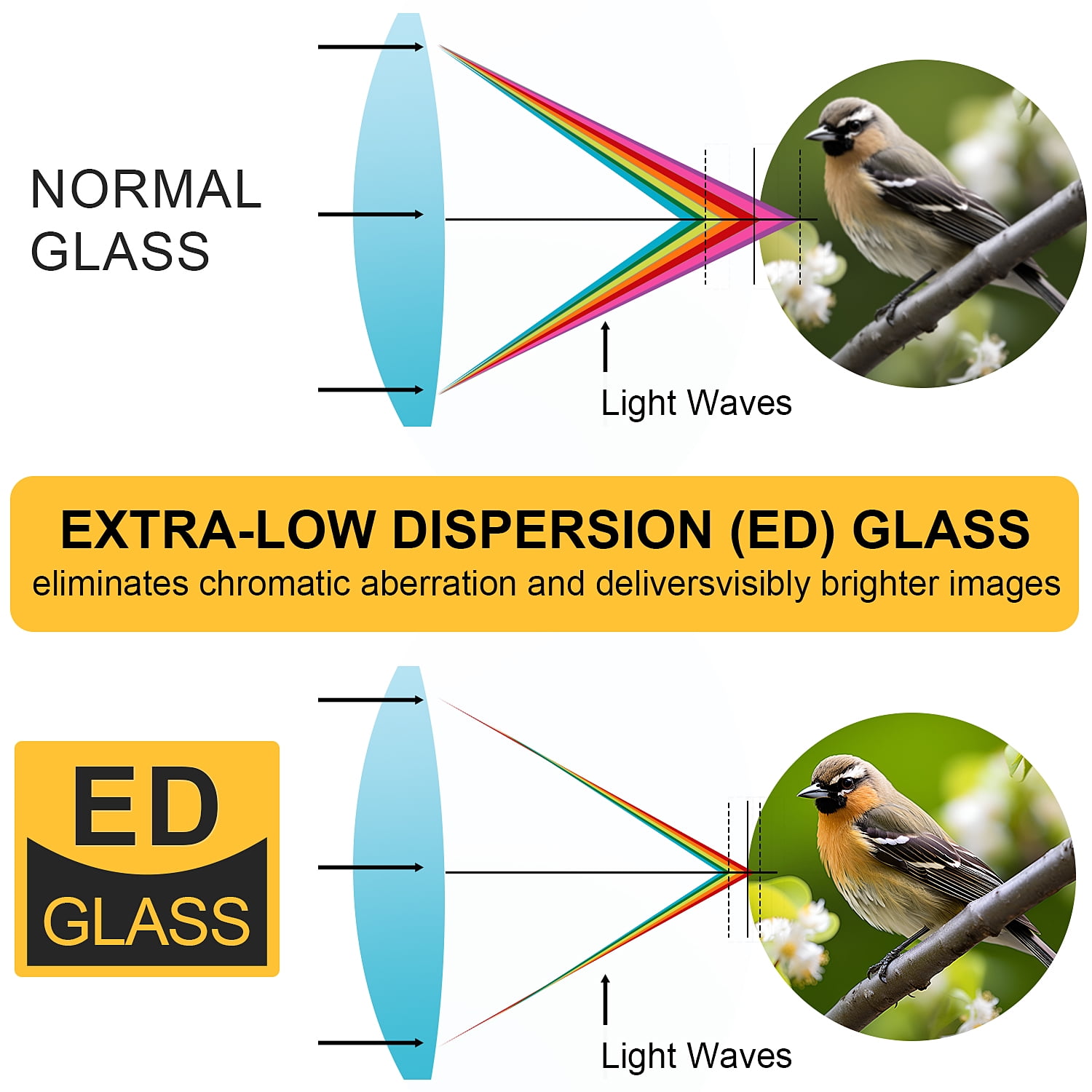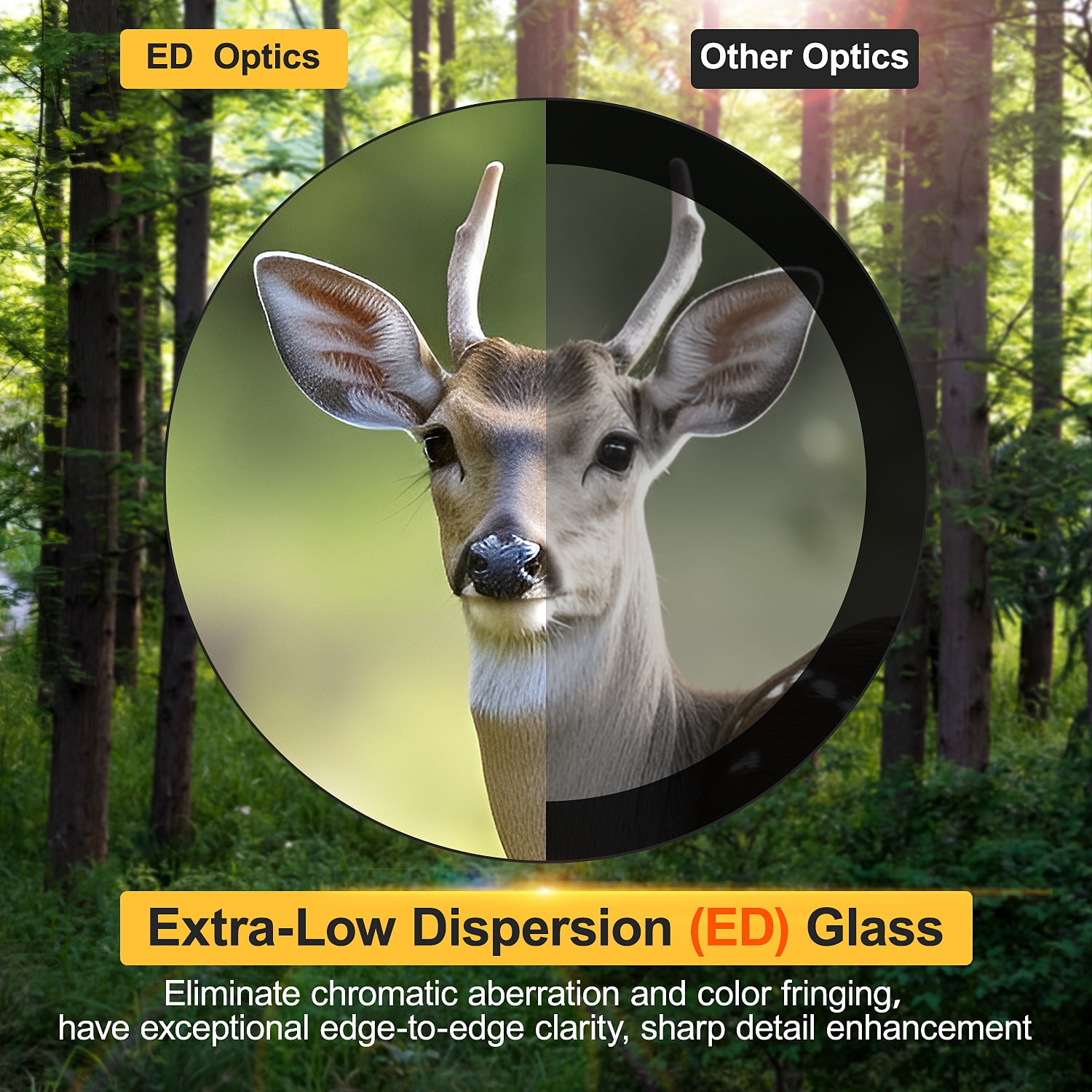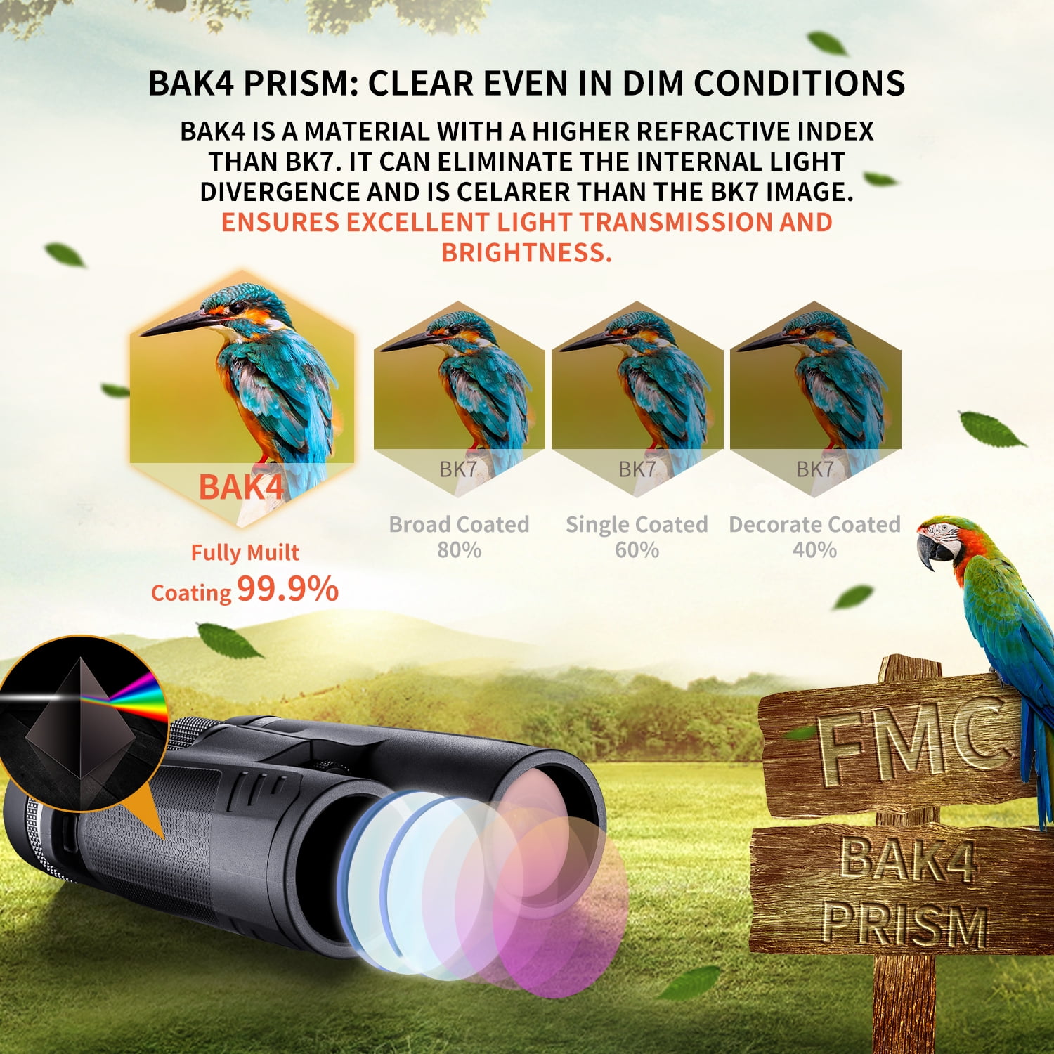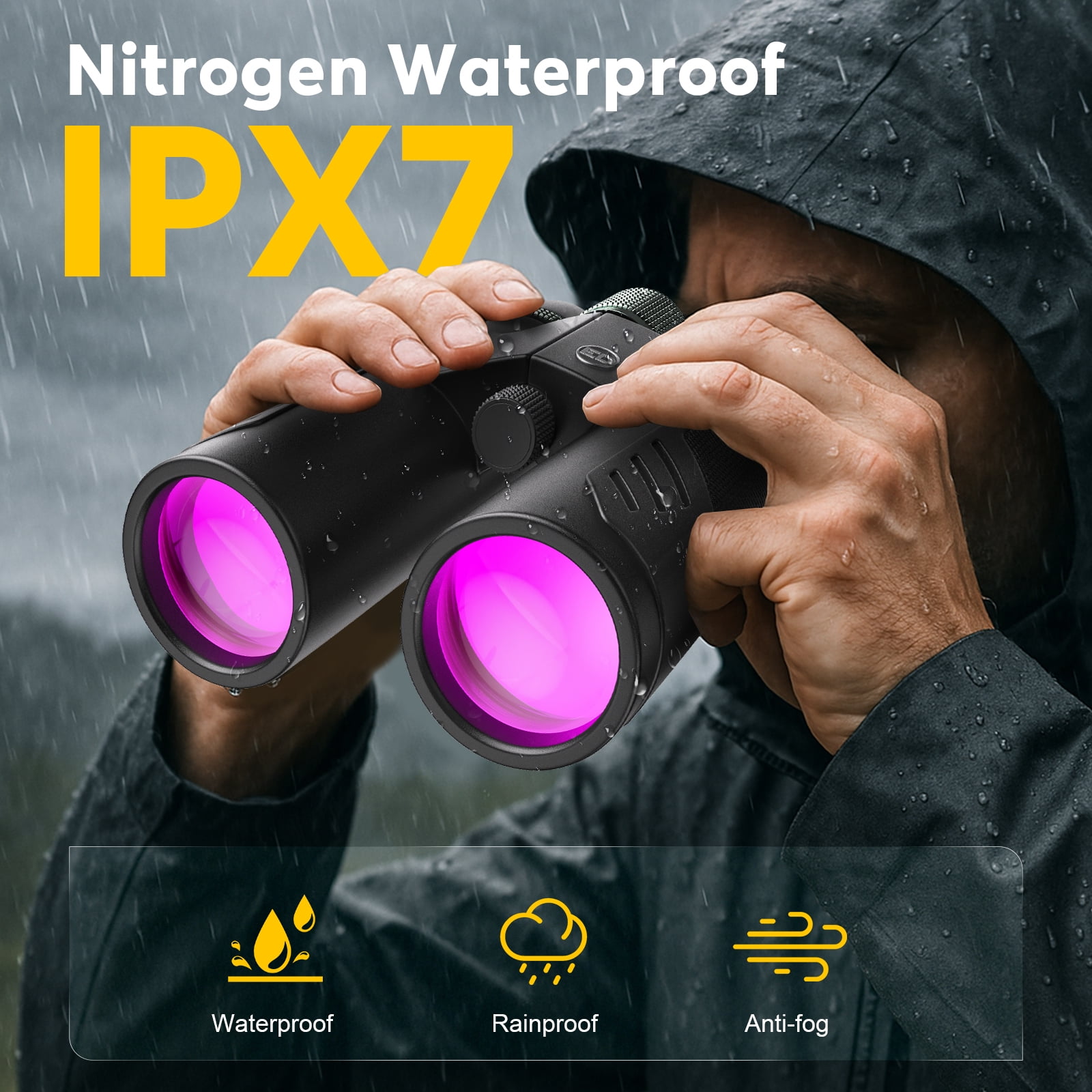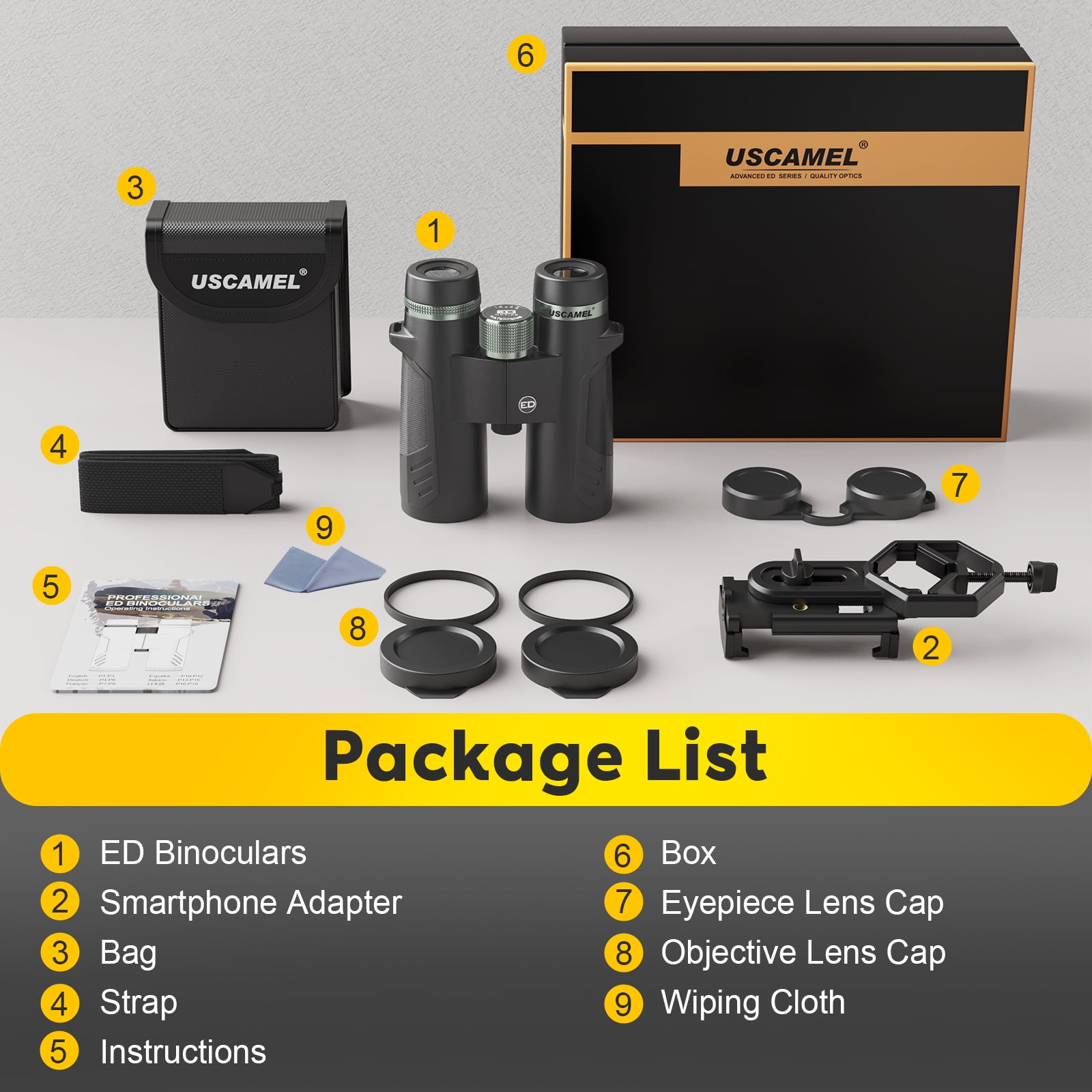 【Ultra-High Definition View】The ED binoculars have exceptional edge-to-edge clarity, sharp detail enhancement, ultra-clear brightness, and true color representation, even in low light conditions.The 10x magnification and 42mm objective lens is the perfect combination of light gathering ability and portability. 【Top-Tier Viewing Experience】Binoculars with ED (Extra-low Dispersion)Glass Lenses eliminates chromatic aberration or color fringing, and Fully multi-coated BaK-4 lenses increase light transmission with multiple anti-reflective coatings on all air-to-glass surfaces. Roof prism design is valued for greater durability and a more compact size. 【Antioxidant & Durable】Adult binoculars with magnesium alloy metal material and Sophisticated rubber armored exterior design provides shock resistance and a firm comfortable grip Extended period of use, Adjustable eyecups twist up and down for comfortable viewing with or without eyeglasses. Center focus wheel adjusts the focus of both binocular barrels at the same time. Diopter (located on right eyepiece) adjusts for differences in a user’s eyes. 【Nitrogen-filled Waterproof , Fog proof】These binoculars feature nitrogen purging and o-ring seals, providing water and fogproof performance in all environments. Their rugged construction withstands recoil and impact, ensuring they stand up to the toughest weather conditions. 【Versatile Use & Gift Box】The adult binoculars suitable for birdwatching, hunting, stargazing, nature observation, or travelling and outdoor activities. A beautifully crafted gift box also makes an exquisite choice for presenting these binoculars as a thoughtful gift.