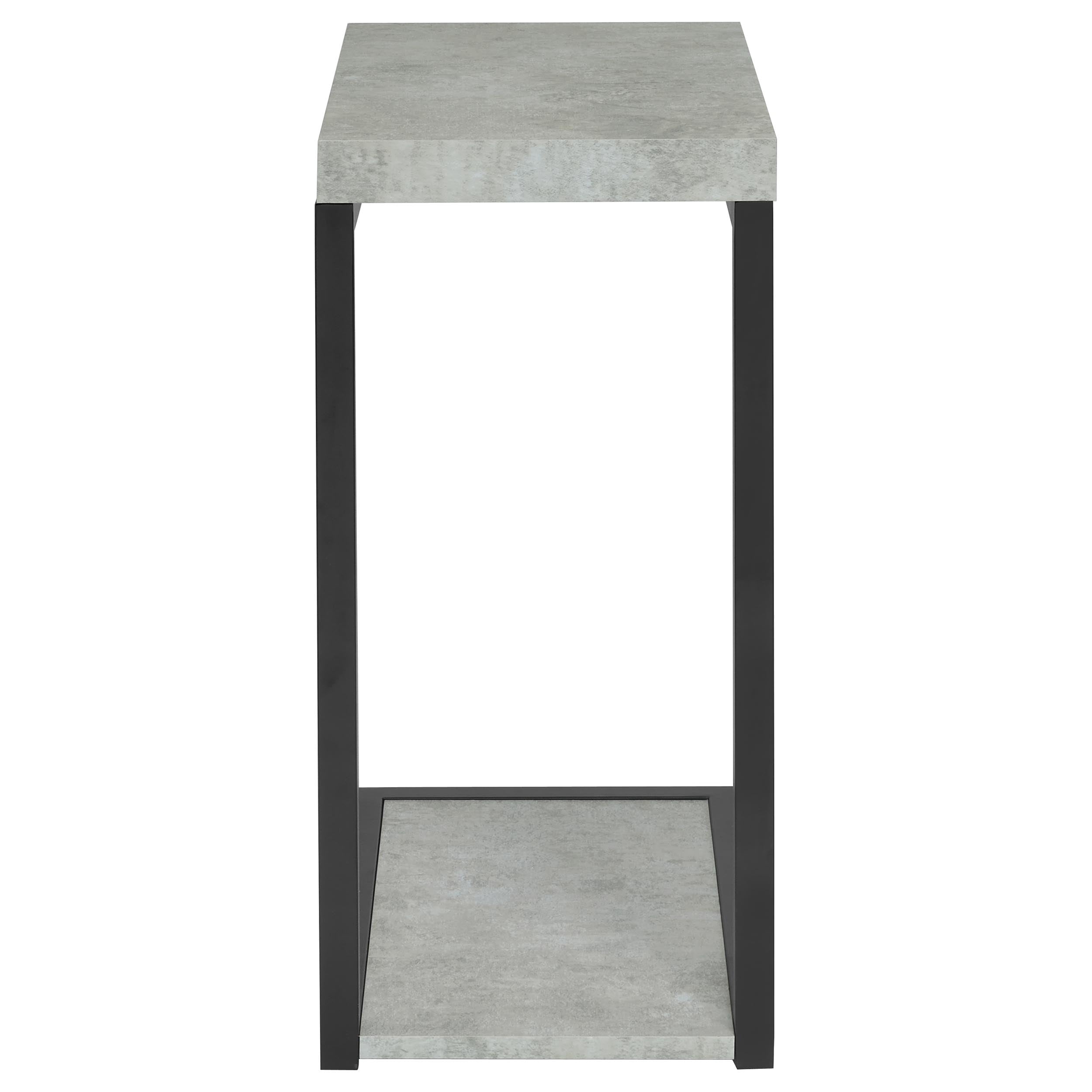Include: One (1) snack table Finish: Cement and Black Materials: Metal, Particle Board, Hollow Board, Engineered Veneer Bring industrial to your residential space with this accent table Black metal base adds a touch of modern while staying true to industrial design Faux cement table top completes the design Leveler/ plastic glide: Plastic glide Shape: Rectangular