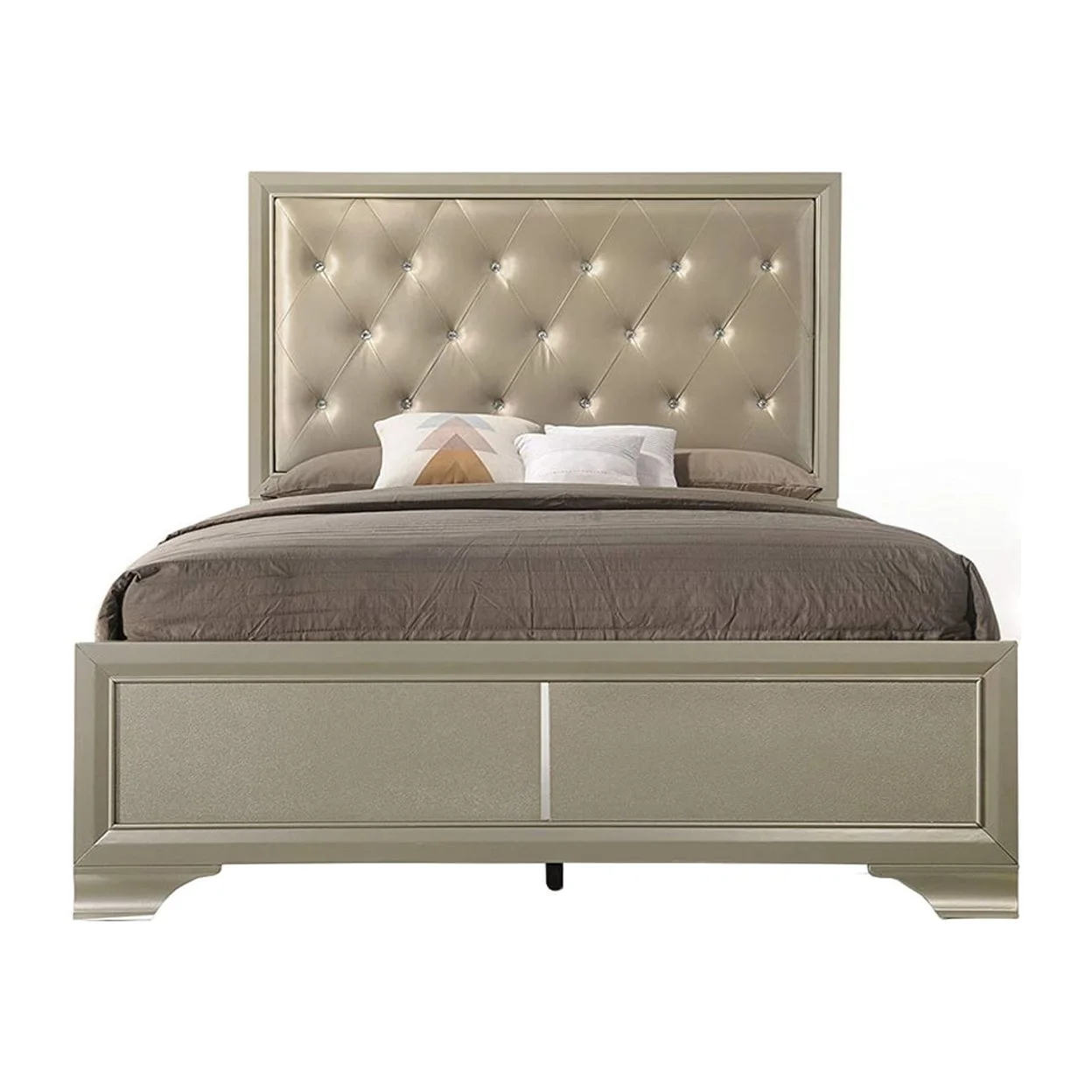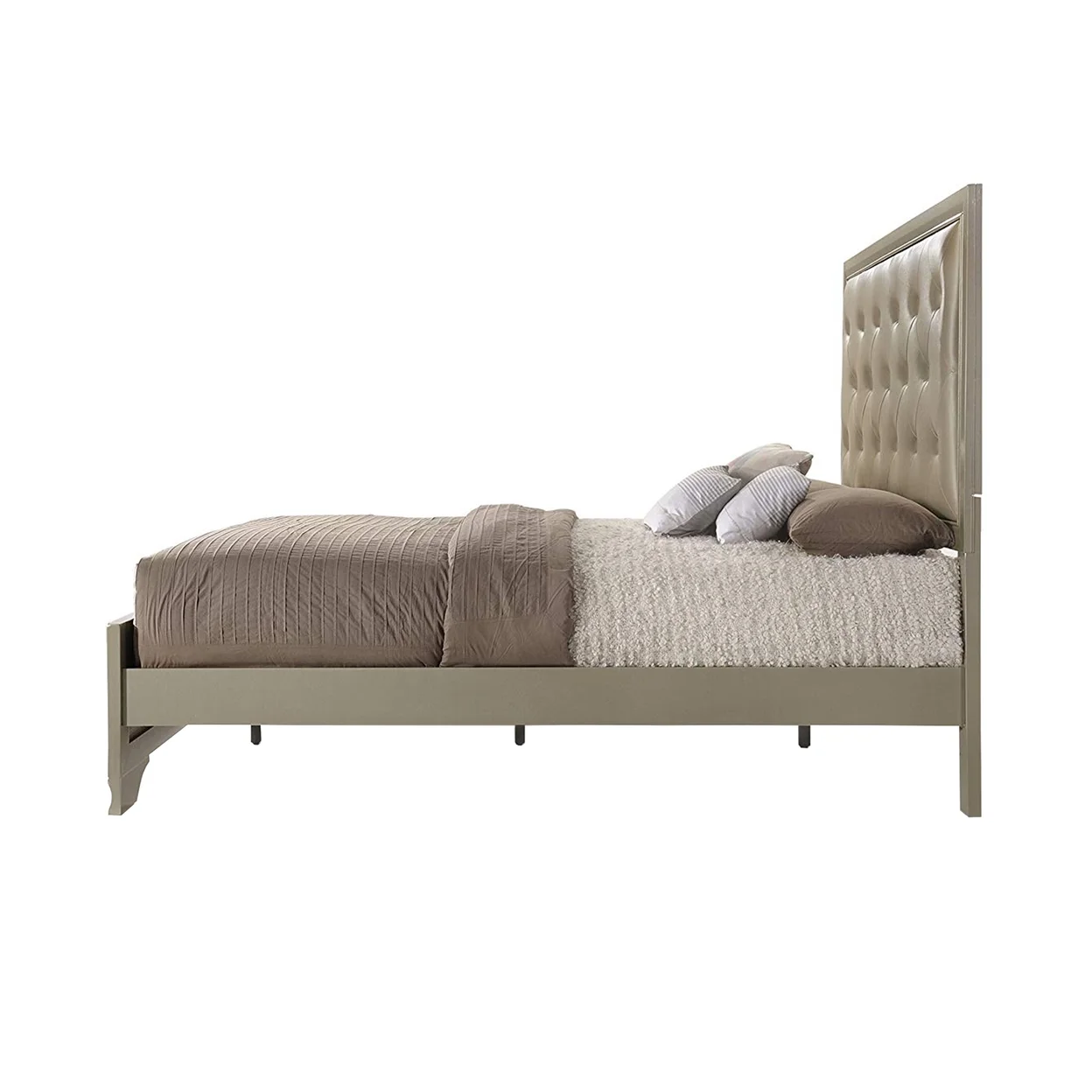 The transitional queen bed in champagne finish features button tufted headboard, low profile footboard. And its complemented by oversized case with sleek design and designed by wooden bracket leg.This beautiful bed will be a perfect complement to decor your master bedroom.
