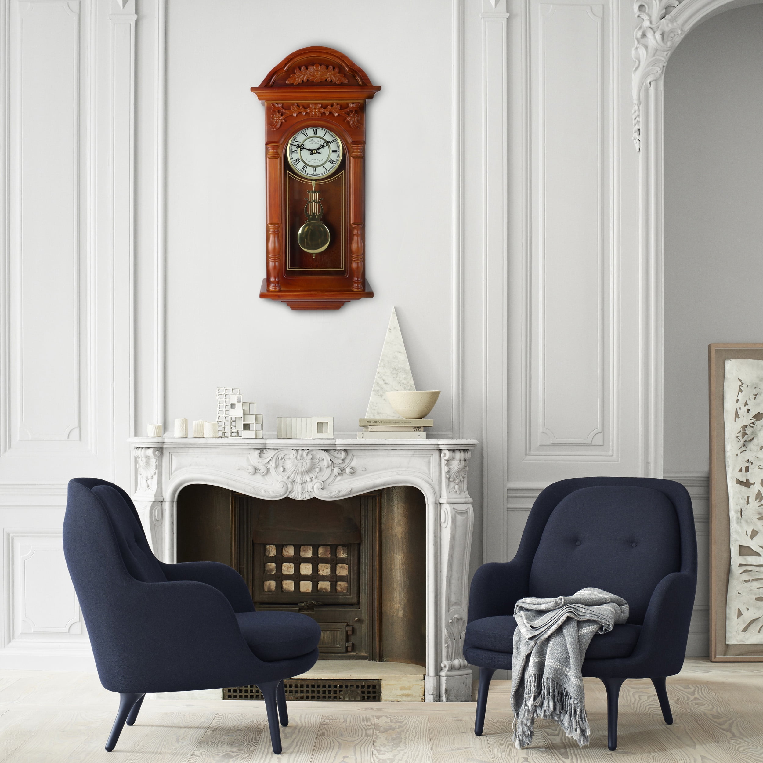 Padauk Oak finish Decorative carved accents Metal dial Roman Numerals Decorative glass Harmonic Chimes play on the hour Adjustable volume control Chime shut off option Easy to use Nighttime volume shut-off function at a push of a button Chime Choices: To Alice, Strike, Westminster Music and Strike, Westminster Only Includes: One Wall Clock One Pendulum One Instruction Manual Item Dimensions: Wall Clock: 12.75″ length, 5.75″ width, 27.50″ height, 9.60lbs weight