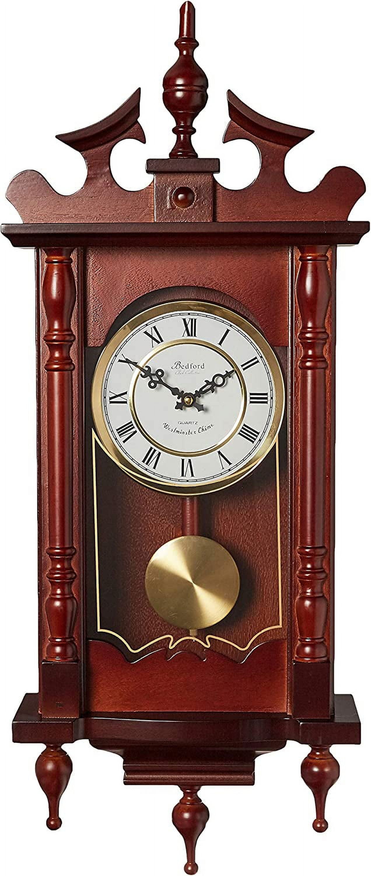 Bedford Clocks Classic 31″ Swinging Pendulum Chiming Wall Clock with Roman Numerals Elegant design featuring classic Roman numerals Chiming mechanism adds a traditional touch to your home Swinging pendulum enhances the aesthetic appeal Finished in rich cherry oak for a timeless look Ideal for living rooms, hallways, or offices Measures 31 inches, making it a striking focal point