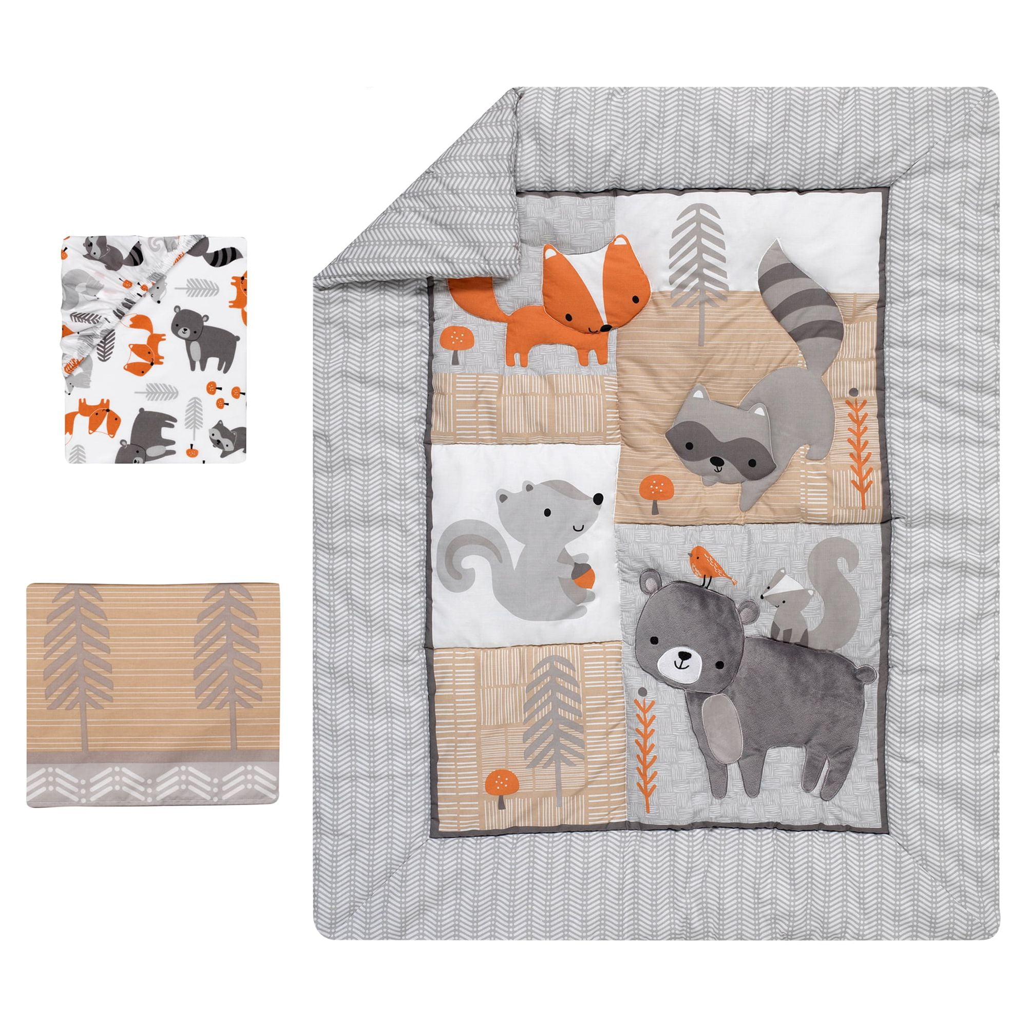 The 3-piece crib bedding set includes one quilt, one fitted crib sheet and one crib skirt A pretty gray and white pattern decorates the border and back of the quilt A charming tossed print with Mr. Bear, clever fox, sweet squirrel with acorns in hand and raccoon decorate the 28” x 52” fitted crib sheet Completing the 3-piece crib bedding set is a coordinating crib skirt with forest trees over a gray border and chevron stripes Machine washable