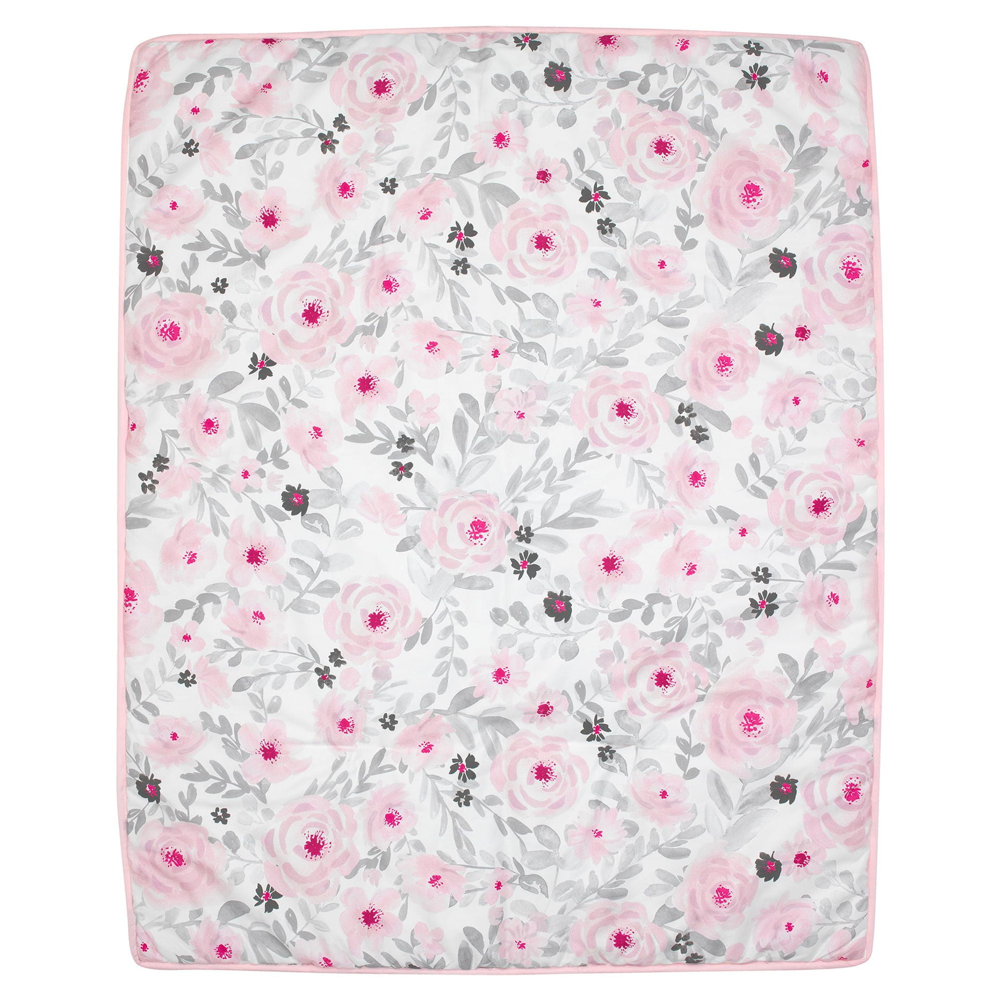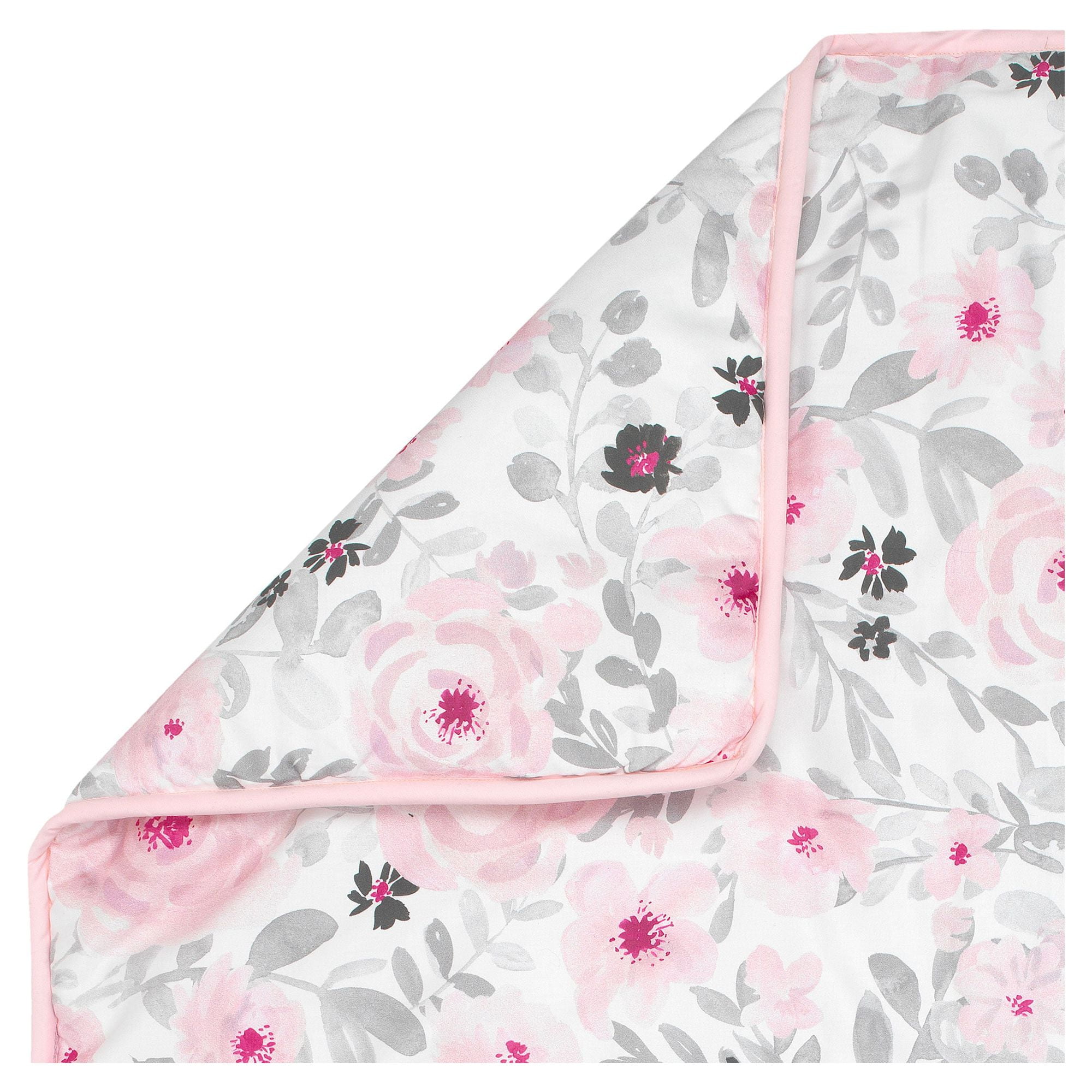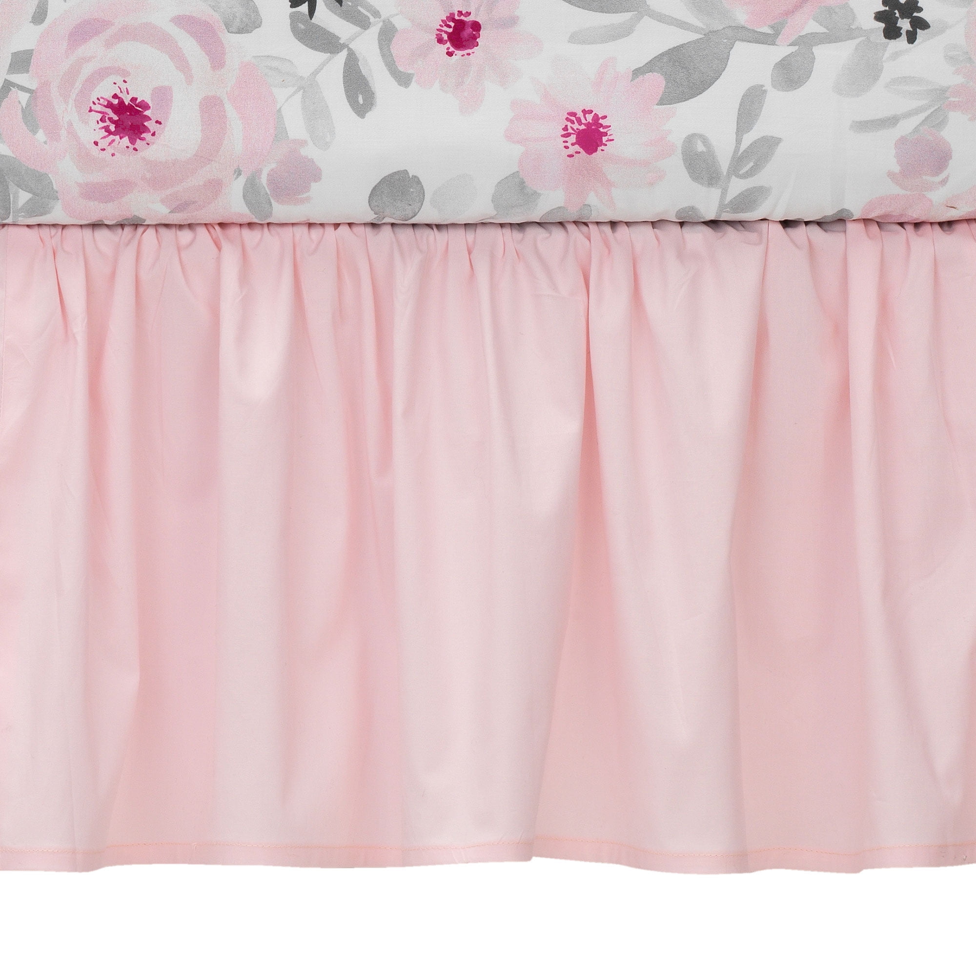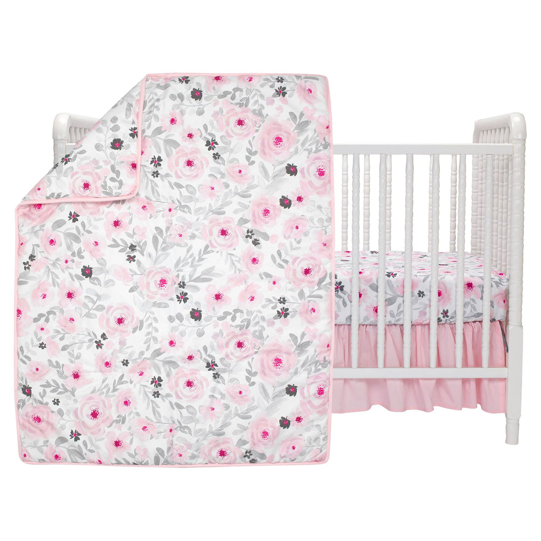 This charming 3-Piece crib bedding set includes one quilt/comforter, one crib skirt, and one fitted crib sheet A gorgeous floral watercolor print decorates the quilt The fitted crib sheet and quilt are decorated in shades of pinks and grays. They have been digitally printed in a high-resolution microfiber which enhances their colors The solid pink crib skirt is shirred for a more luxury/designer style Coordinates with the Blossom Baby Nursery Collection