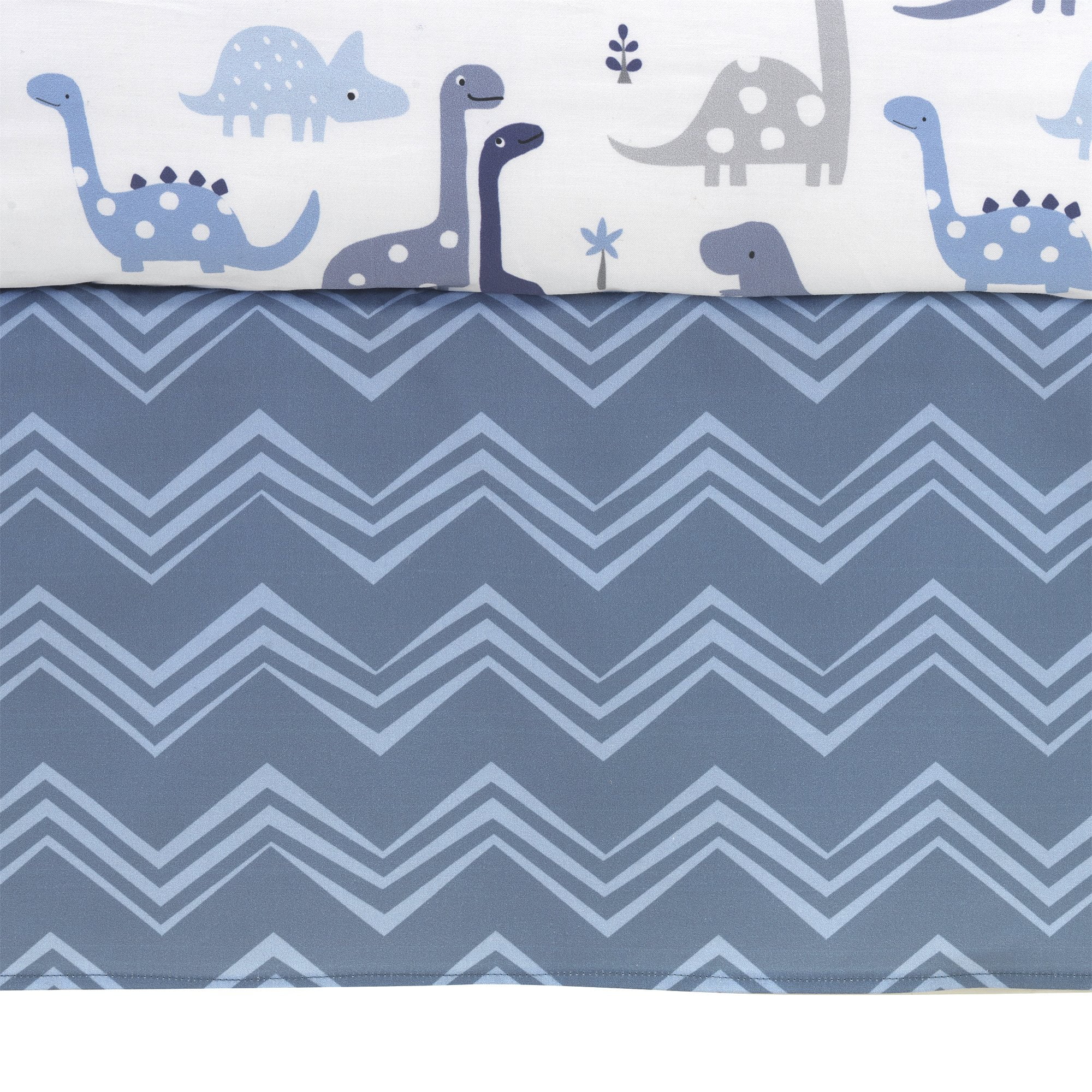 The 3-piece bedding set includes one quilt, one fitted crib sheet, and one dust ruffle The fitted crib sheet is on a crisp white ground with many different varieties of dinosaurs The dust ruffle is a trendy chevron print in two shades of blue The quilt features Rex, a sweet appliqued brontosaurus with embroidered white dots and gray scales. He stands on a colorful patchwork in gray, navy, and blue. Coordinates with the Roar Baby Bedding Collection