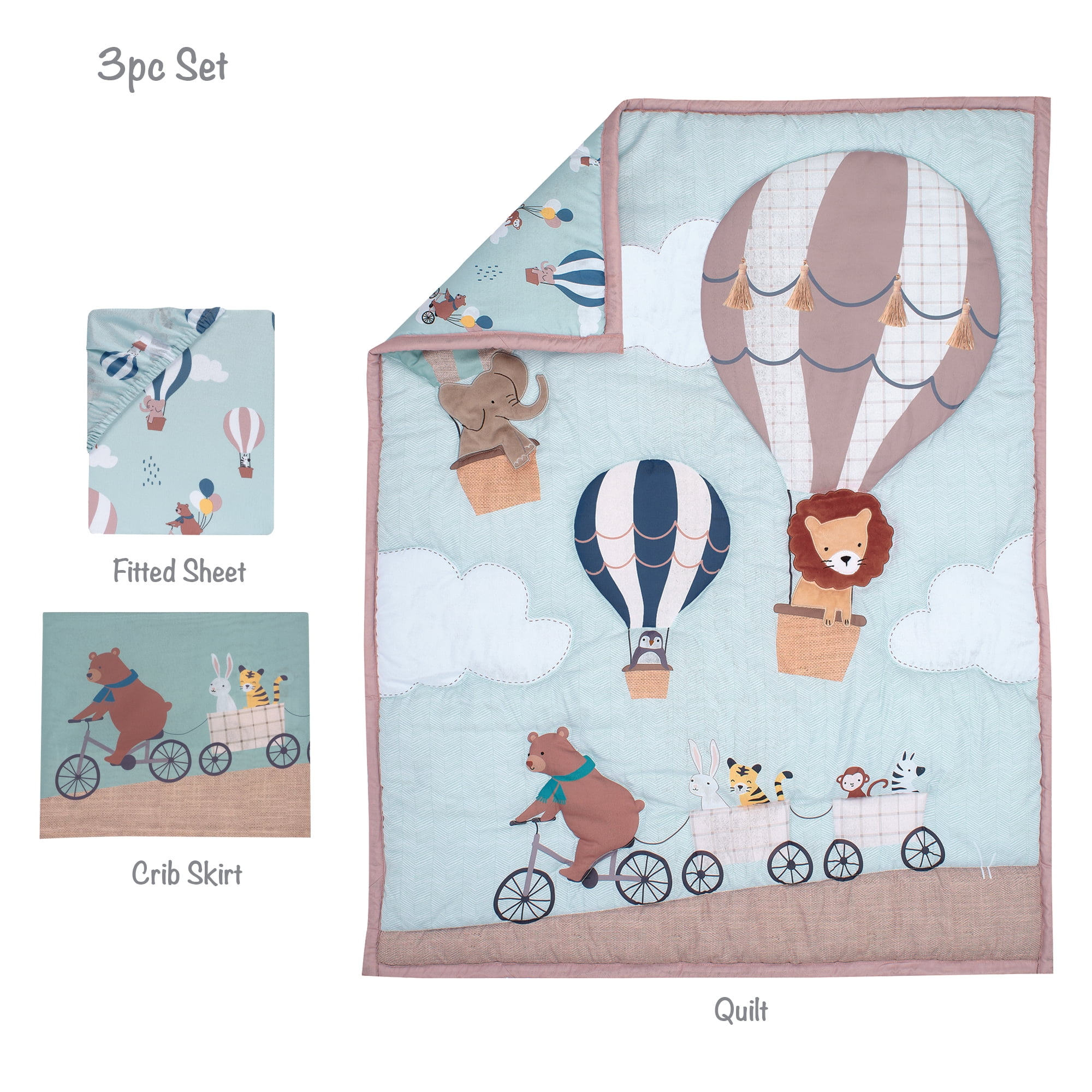 Three-piece crib bedding set includes one quilt, one fitted crib sheet and one crib skirt Soft, wrinkle resistant microfiber fabric Happiness are animals floating in hot air balloons Fitted crib sheet has elastic all the way around ensuring a safe and secure fit Adorable crib skirt featuring all the cute animals having fun