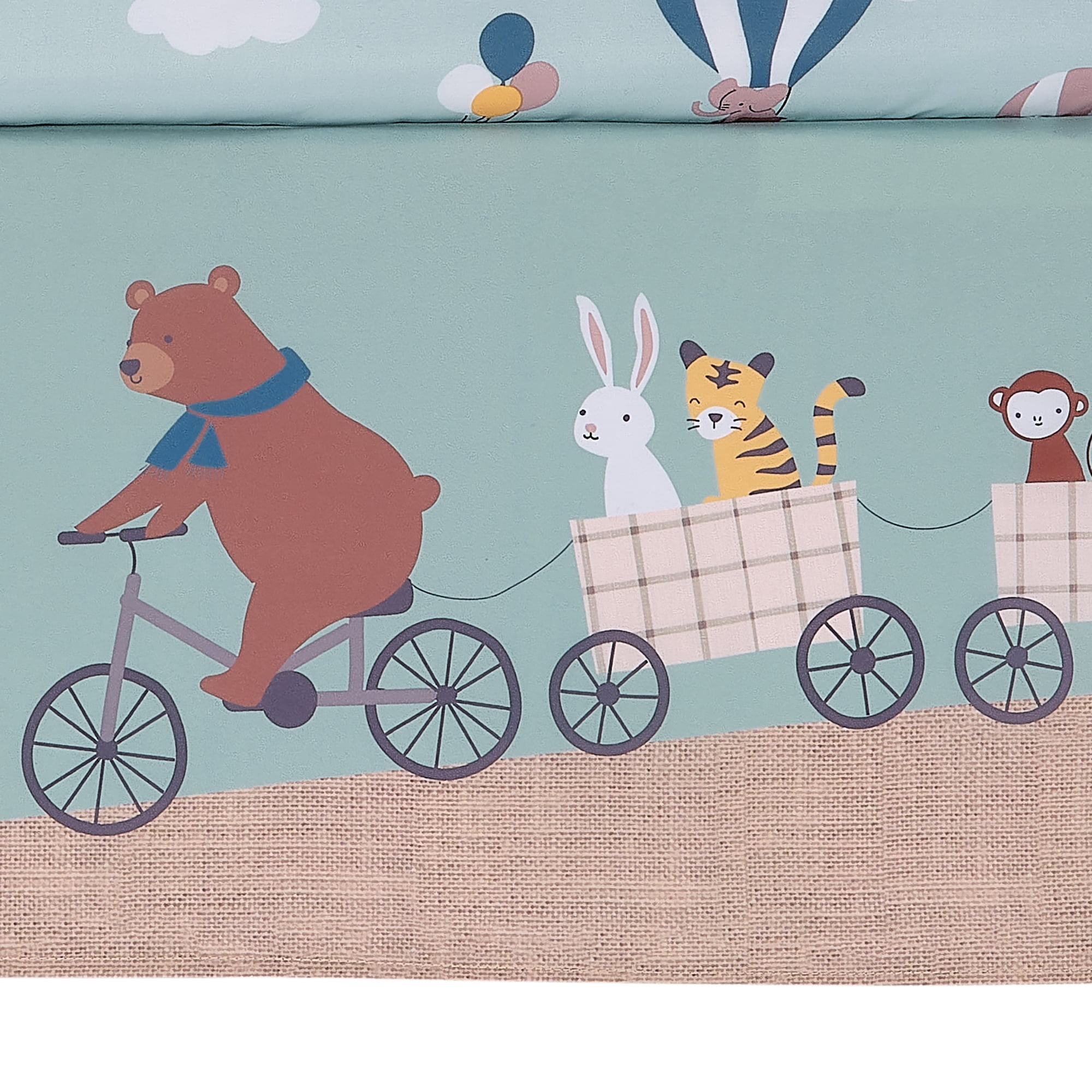 This three-piece crib bedding set includes one quilt, one fitted crib sheet and one crib skirt. It is made in a wrinkle resistant soft microfiber material. Featured is an appliqued gray velour elephant, a lion with an appliqued mane and face, and a sweet little penguin all in their own wide striped hot air balloon decorated with large tassels. The crib sheet is on a sky-blue background with multiple sized hot air balloons floating in the sky. A variety of animals are in the baskets having fun. Included are lions, tigers, zebras, penguins, rabbits, and elephants. The fitted crib sheet has elastic all the way around ensuring a safe and secure fit on a standard size mattress measuring 28” X 52”. The crib skirt adds the finishing touch to your child’s crib. Our adorable little bear named Kodiak is riding his bicycle and pulling little carts filled with animals. The 4-sided crib skirt has a 10” drop.